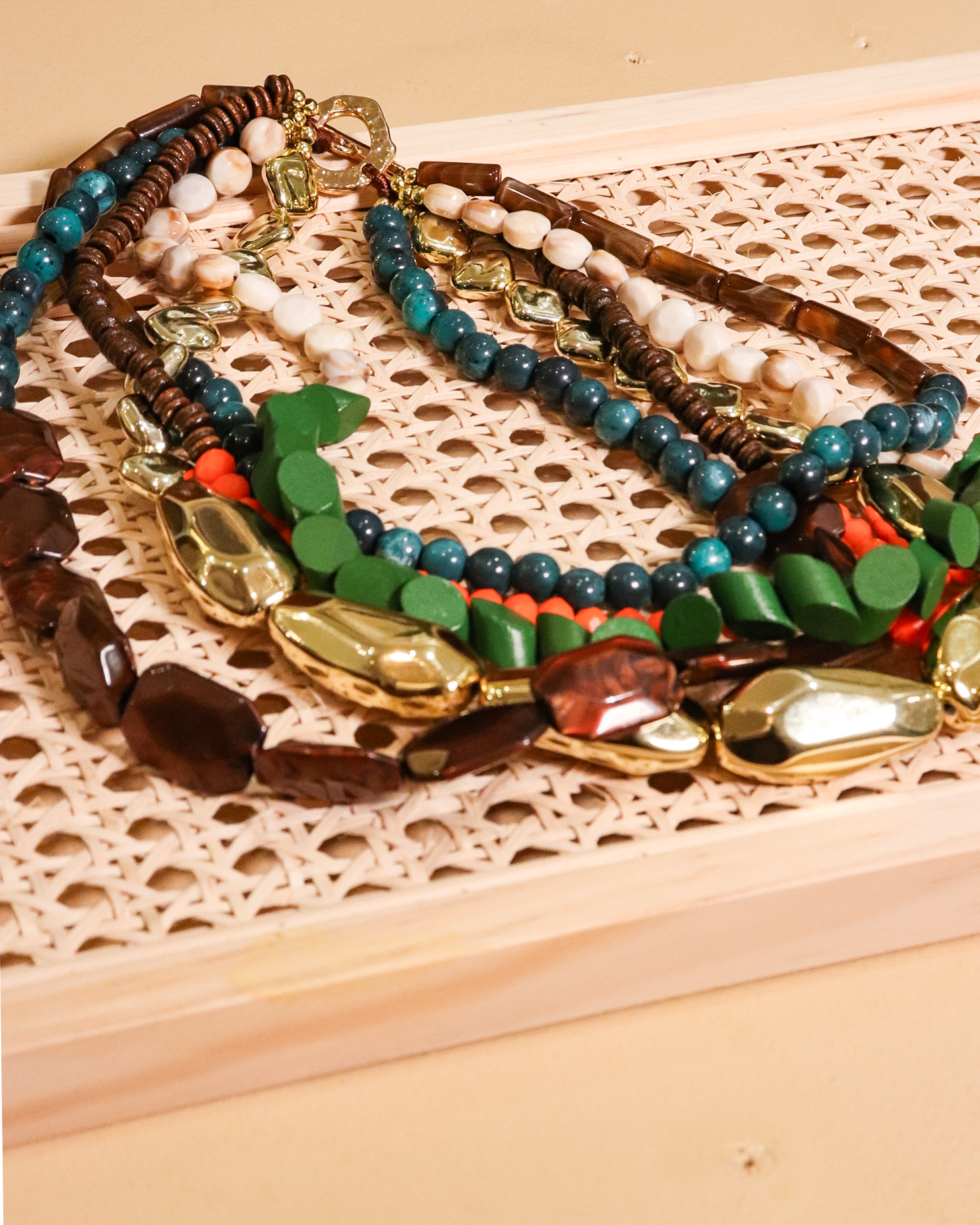 Colar Líbia 25,40 € Desconto de %. Partilhar Comprar Contactar Colar em contas de madeira e metal dourado. Cores terracota e verde.