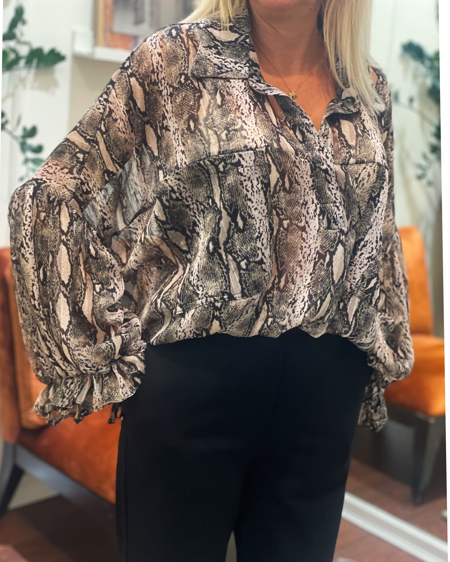 Blusa Adele 27,76 € 69,40 € Desconto de %. Partilhar Comprar Contactar Outlet FW26. Válido de 28 de Fevereiro de 2026 às 00:00 até 31 de Agosto de 2026 às 00:00. Esta blusa tem um padrão tipo pele de cobra. O tecido é leve e fino em viscose. Cor. tem uma mistura de tons beje, branco e preto, replicando a aparência da pele de cobra e tem um ligeiro brilho metálico visivel em algumas áreas. Tamanho S-M / L-XL
