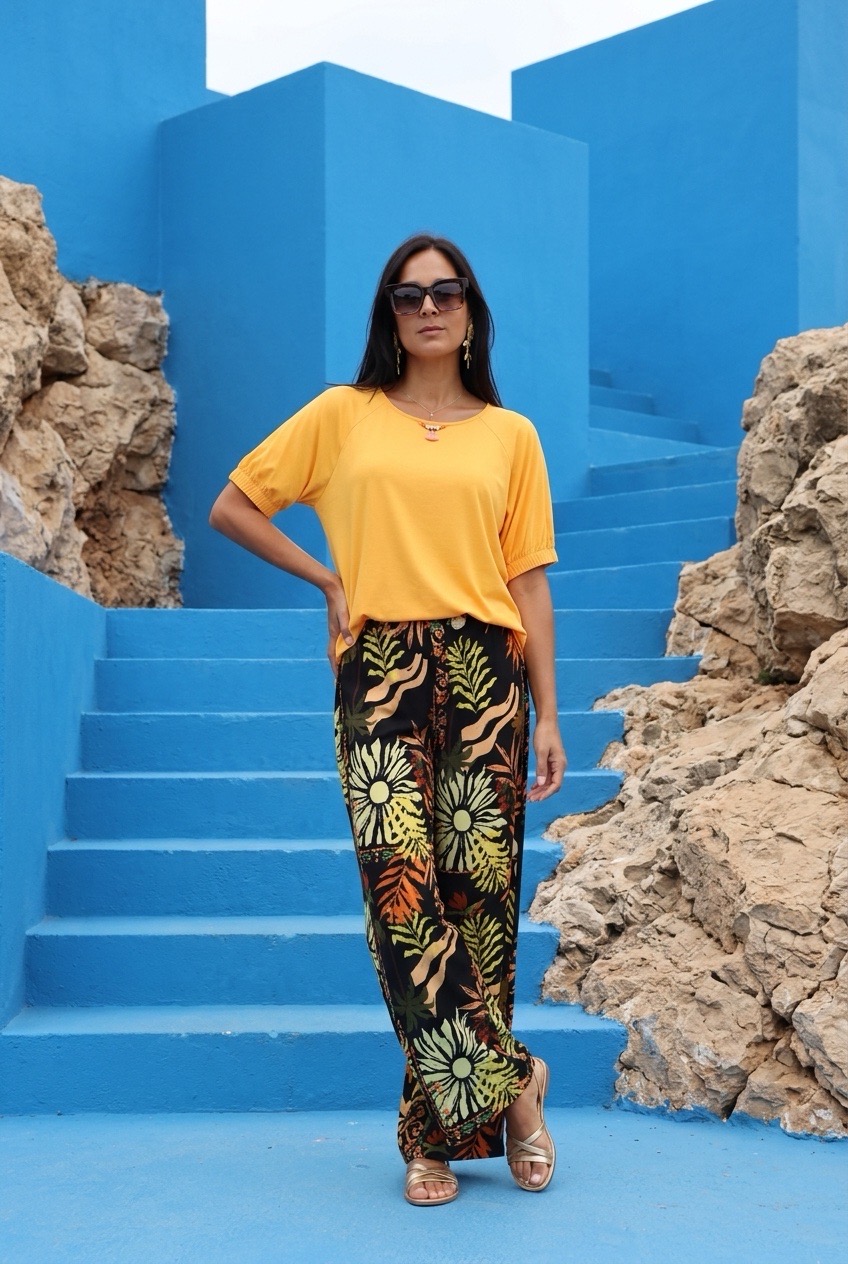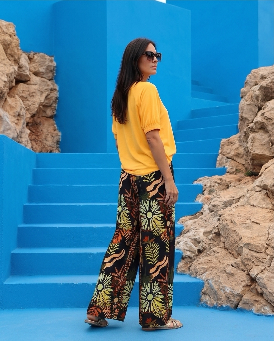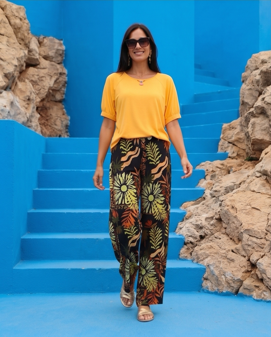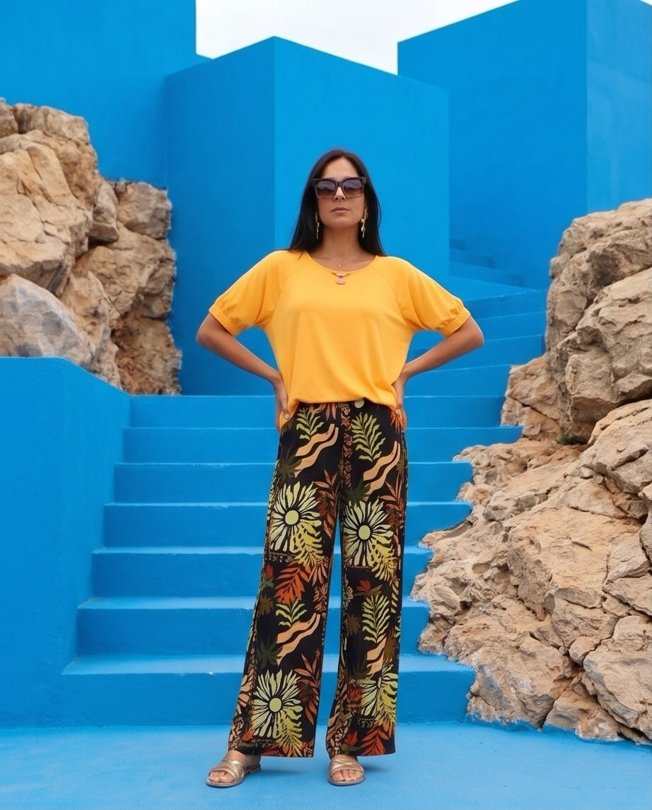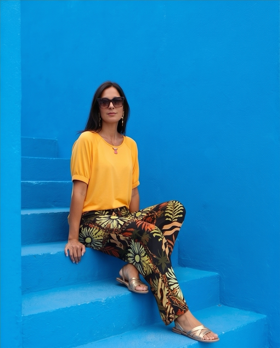 • Mulher com t-shirt amarela e calças pretas com padrão tropical colorido em escadaria azul