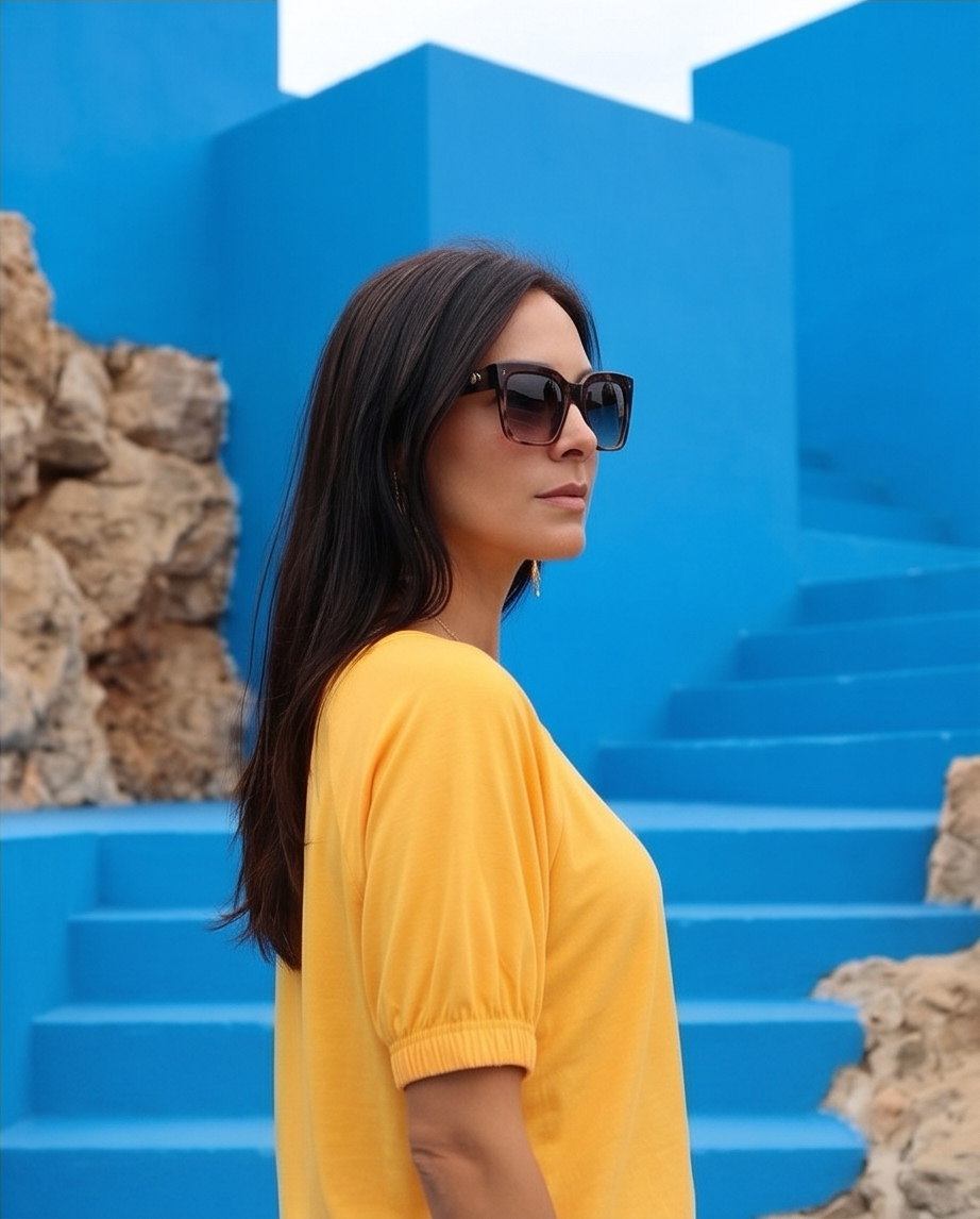• Mulher com t-shirt amarela e óculos de sol, em frente a escadas e paredes azuis.