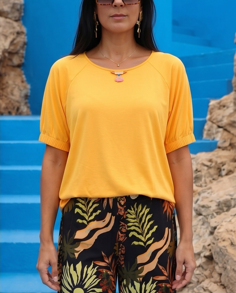 Esta blusa destaca-se pelos detalhes, o decote é redondo e adornado por um pequeno pendente de contas delicadas. As mangas são curtas e terminam com um elástico franzido, criando um ligeiro efeito bufante.