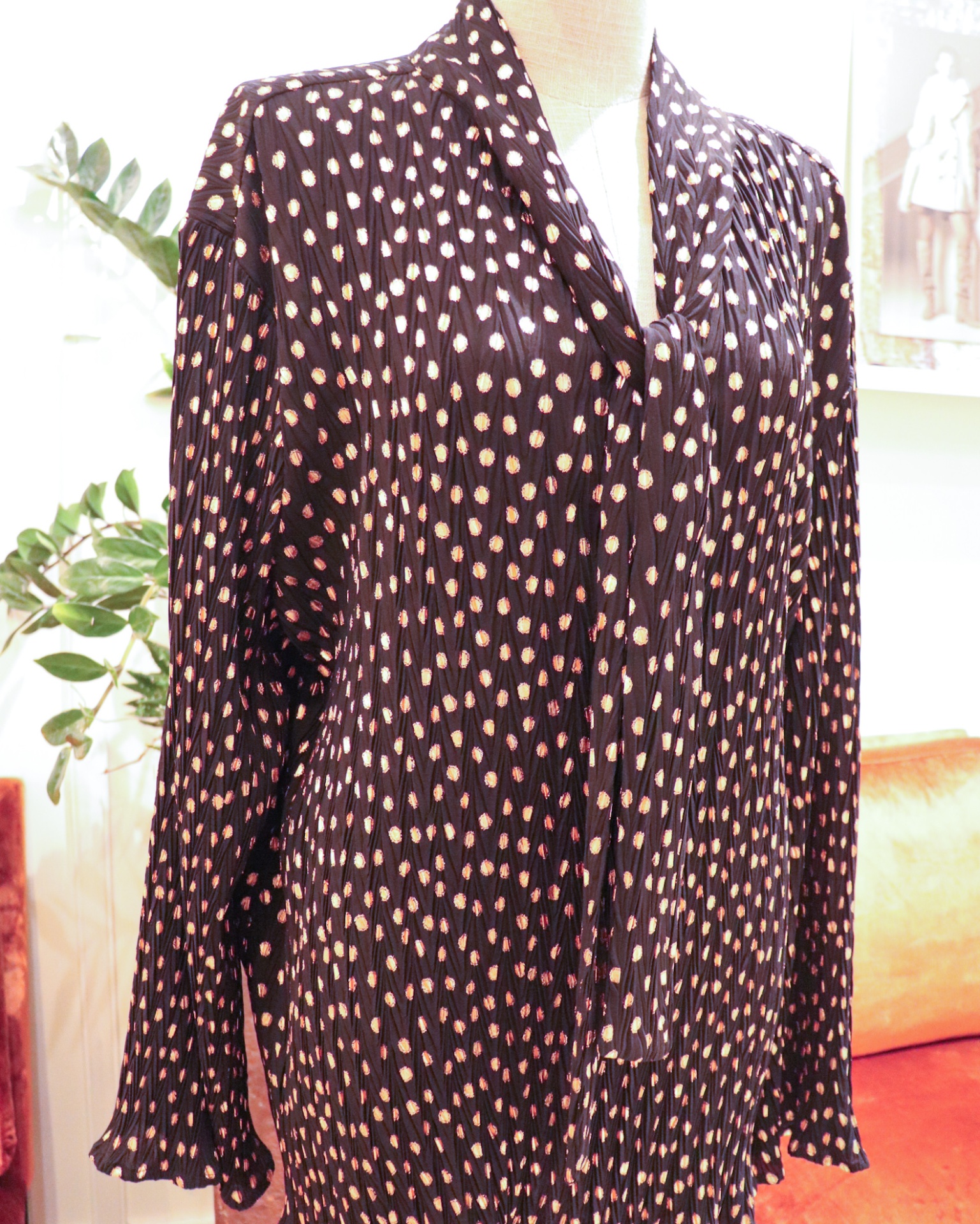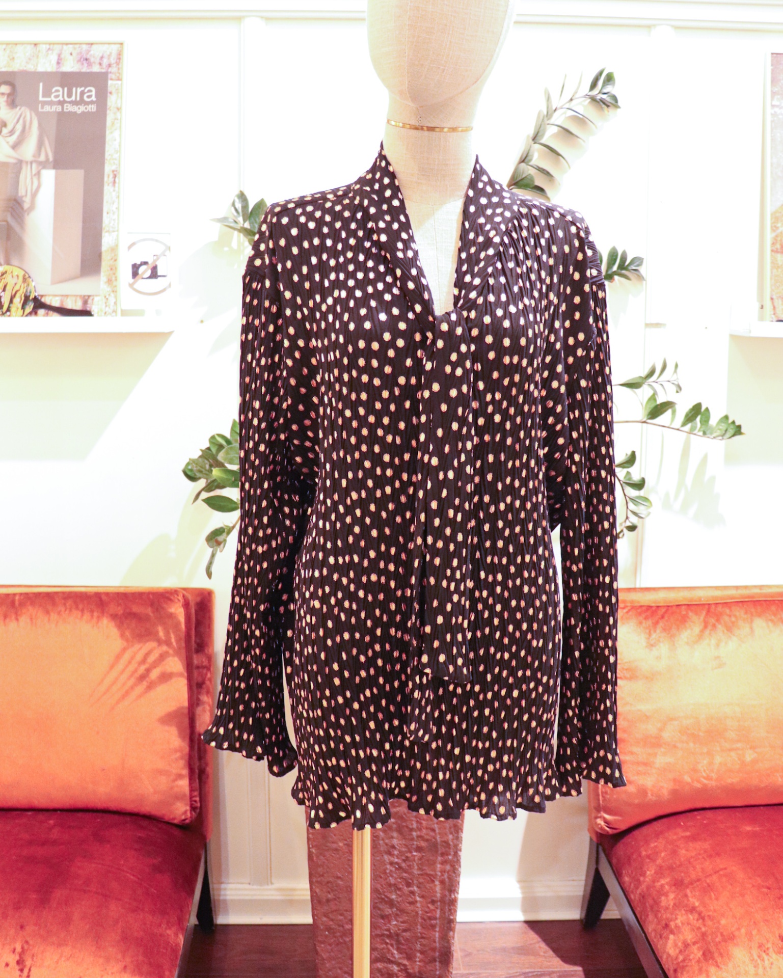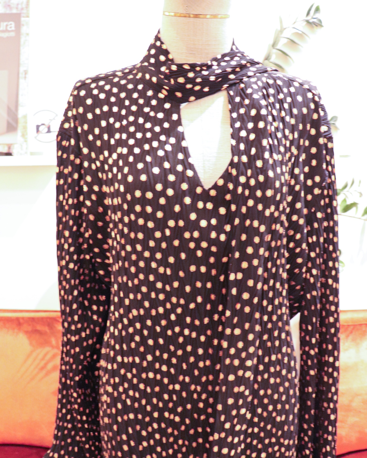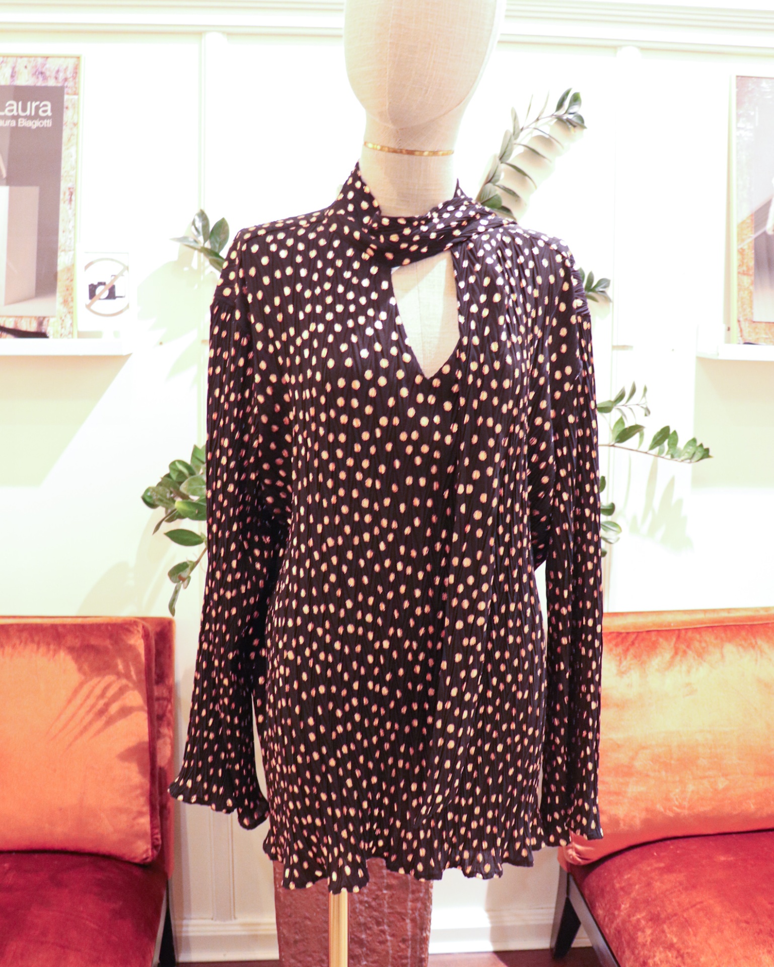 • Blusa preta com bolinhas cor-de-rosa em manequim em loja com sofás laranja e plantas