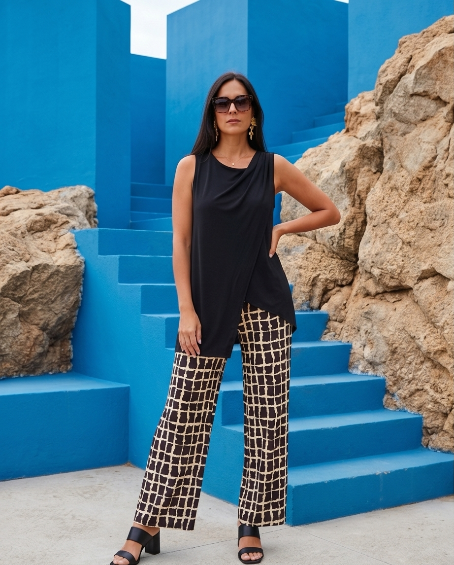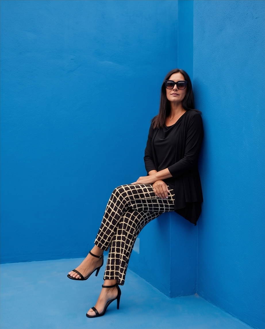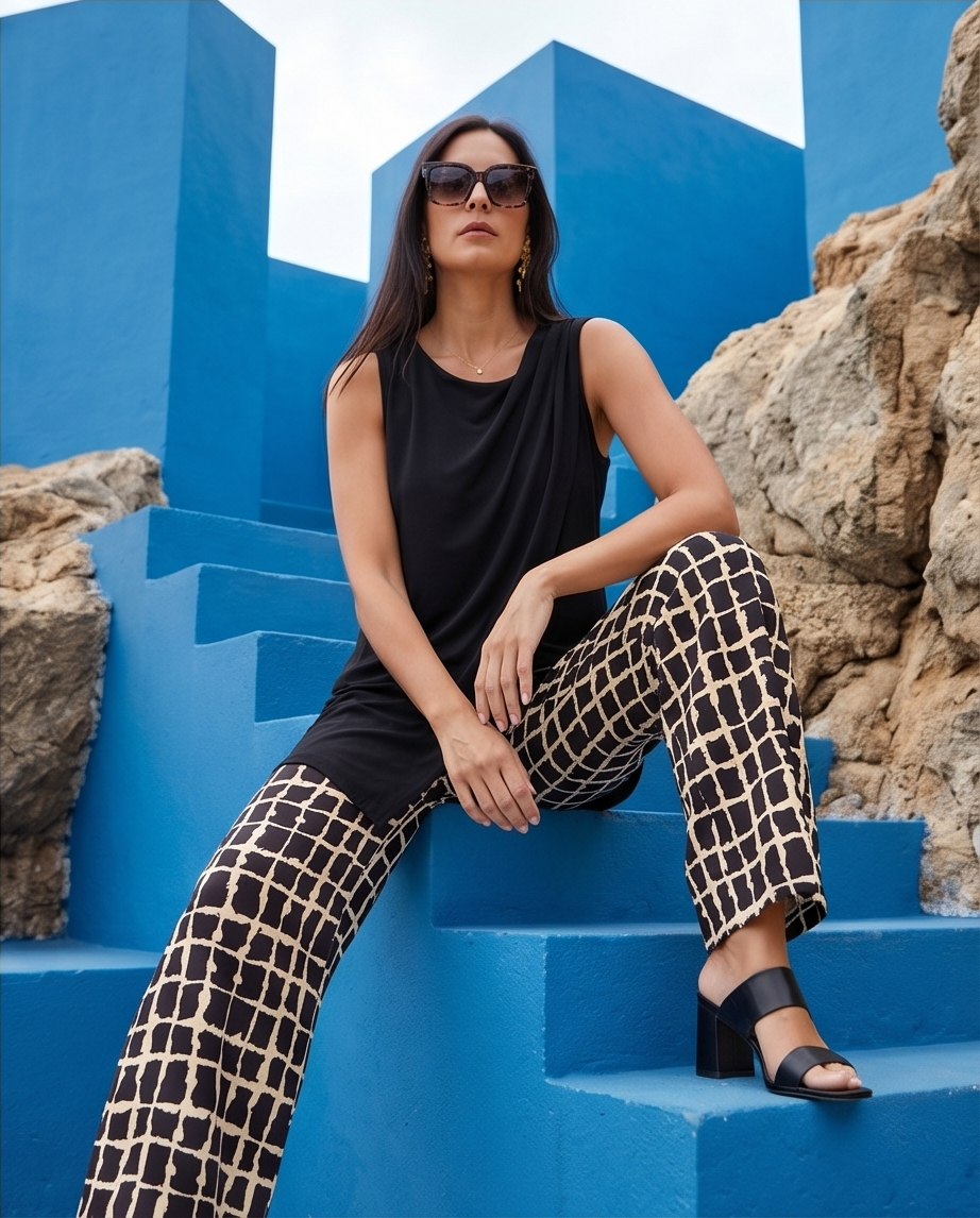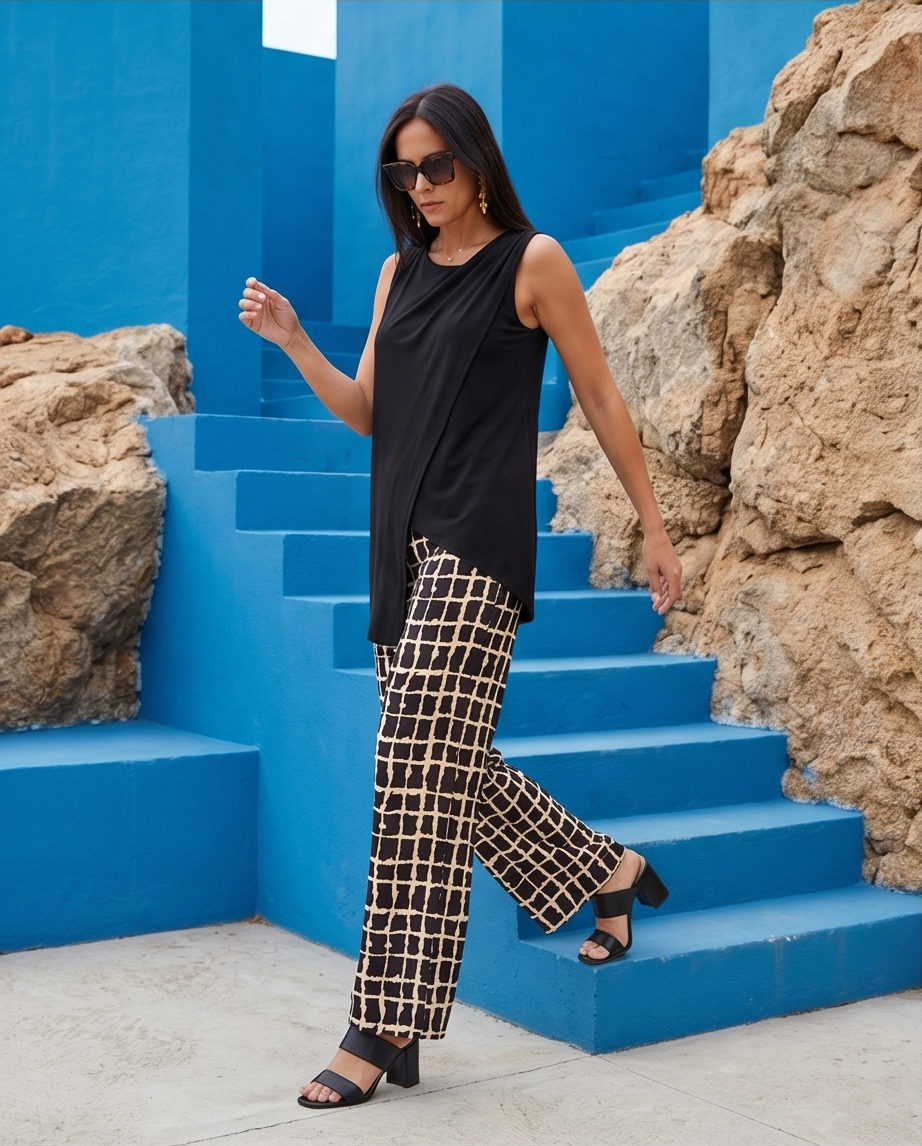 • Mulher de top preto e calças xadrez bege e preto, com sandálias pretas, óculos de sol e brincos, em escadaria e paredes azuis.