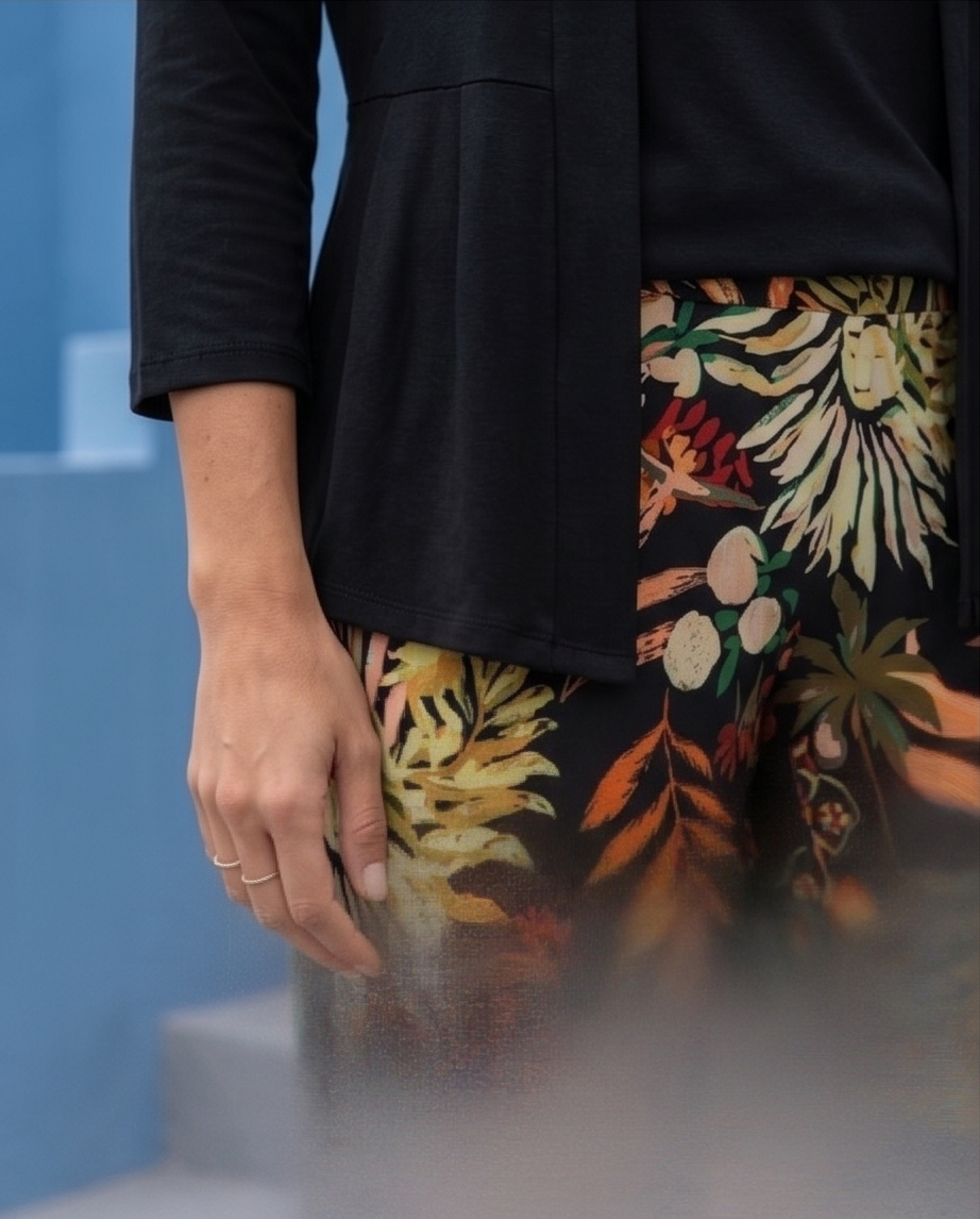 • Parte inferior de vestuário com padrão floral colorido e camisa preta