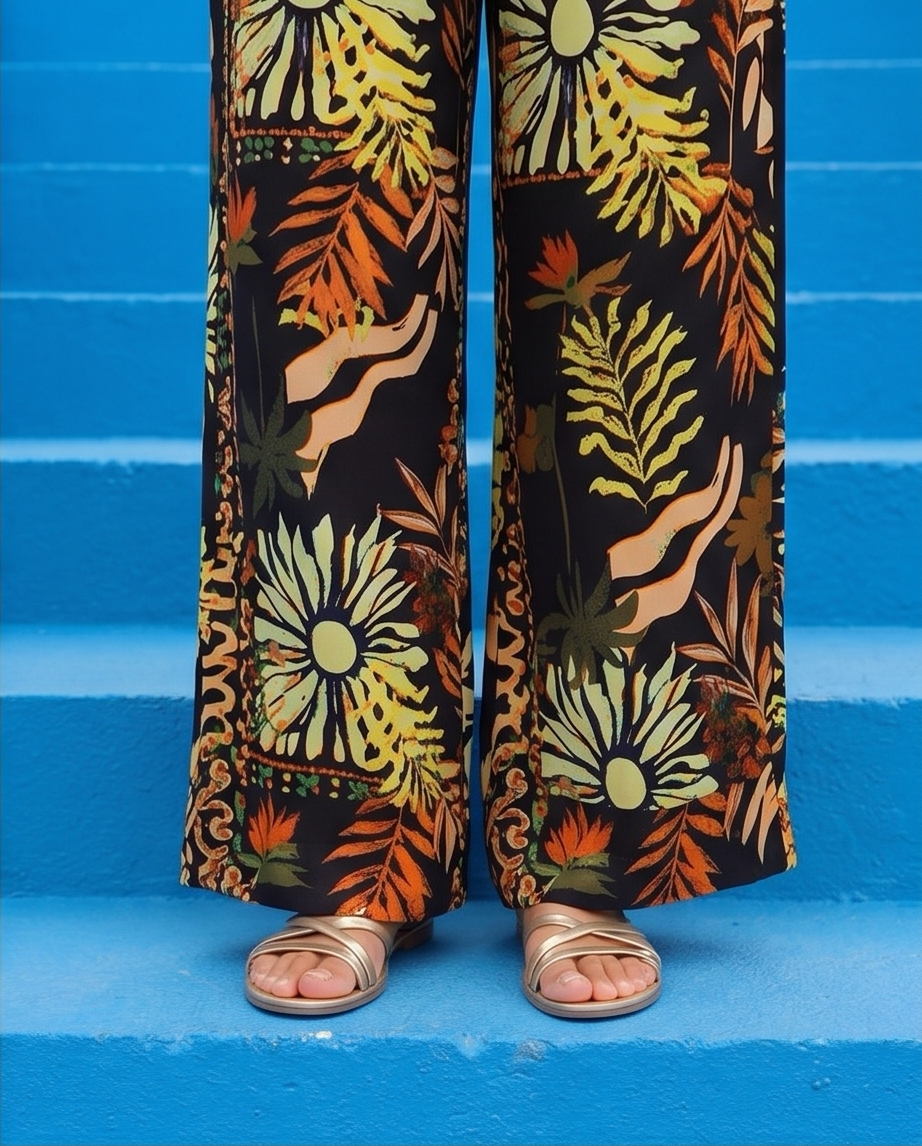 Esta calças são de corte largo e fluidas, tem a cintura com elástico para maior conforto. Apresenta um padrão tropical vibrante com flores e folhagens sobre um fundo preto.