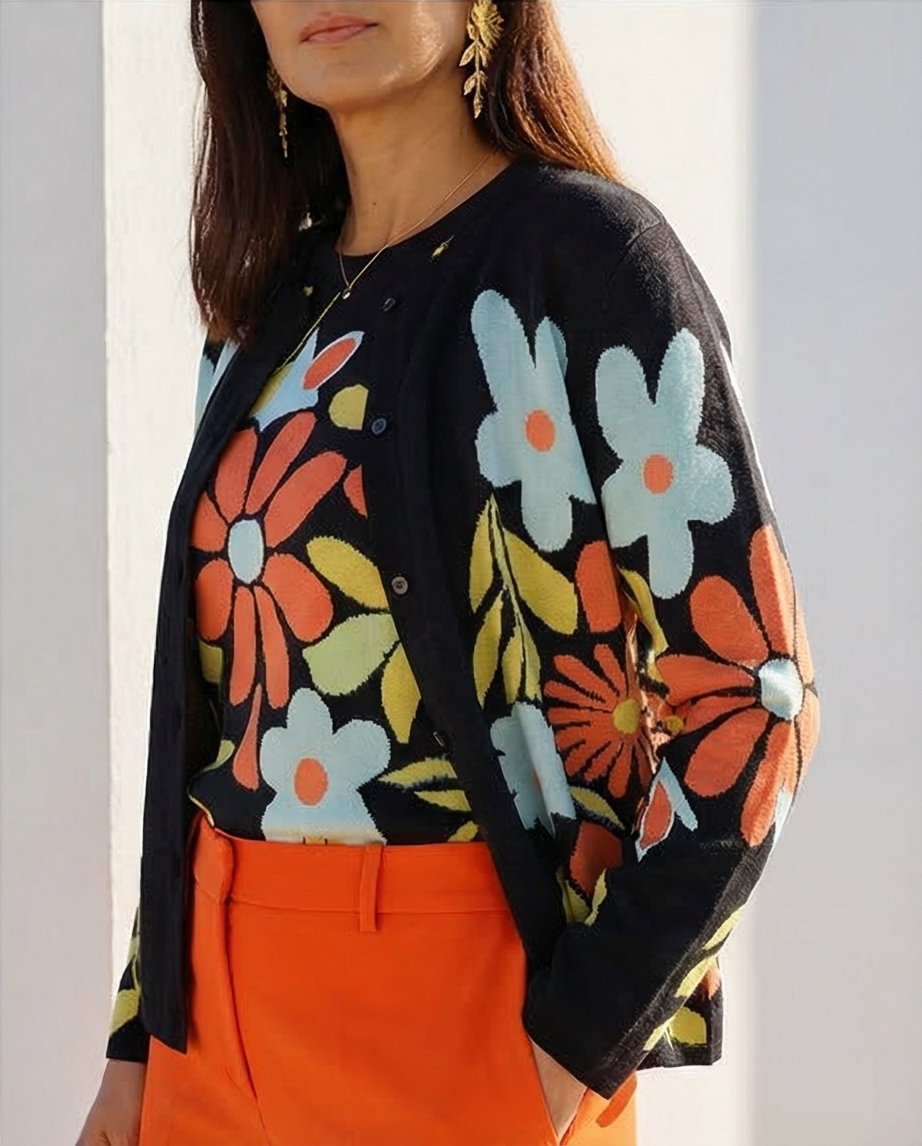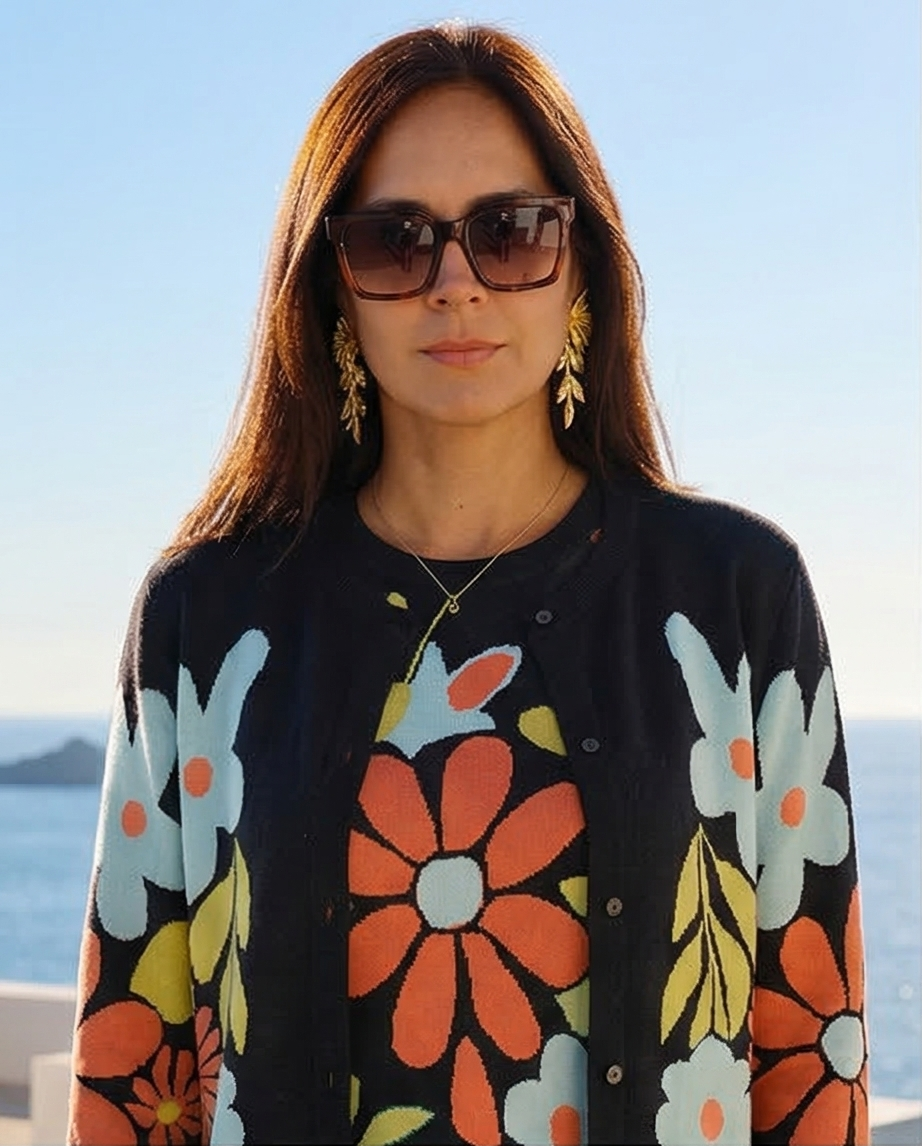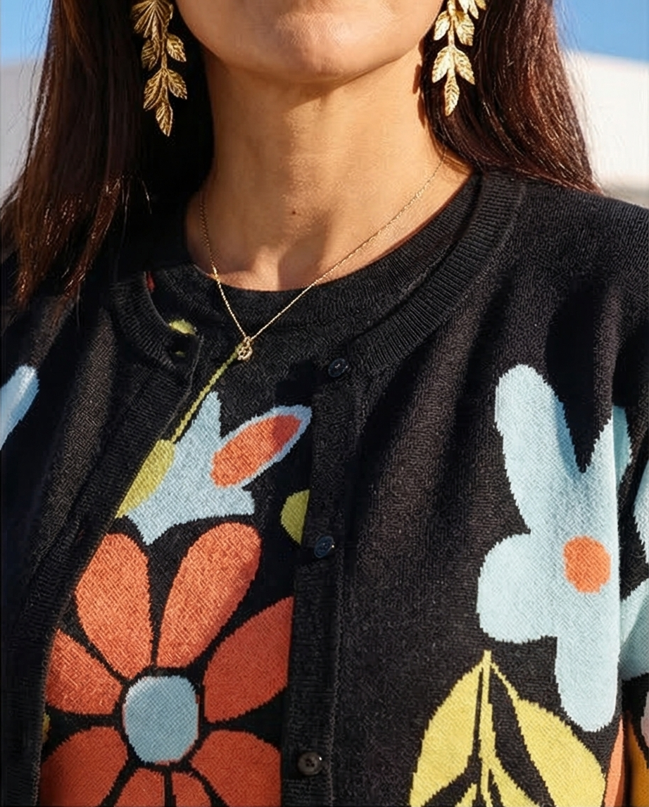 • Cardigã preto com flores coloridas, brincos dourados de folhas e colar delicado