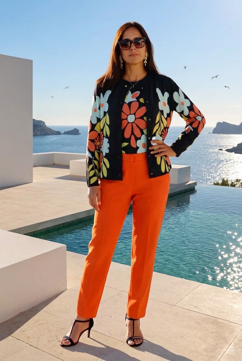 • Mulher com casaco e camisola floral, calças laranja e sandálias de salto junto a piscina com vista para o mar