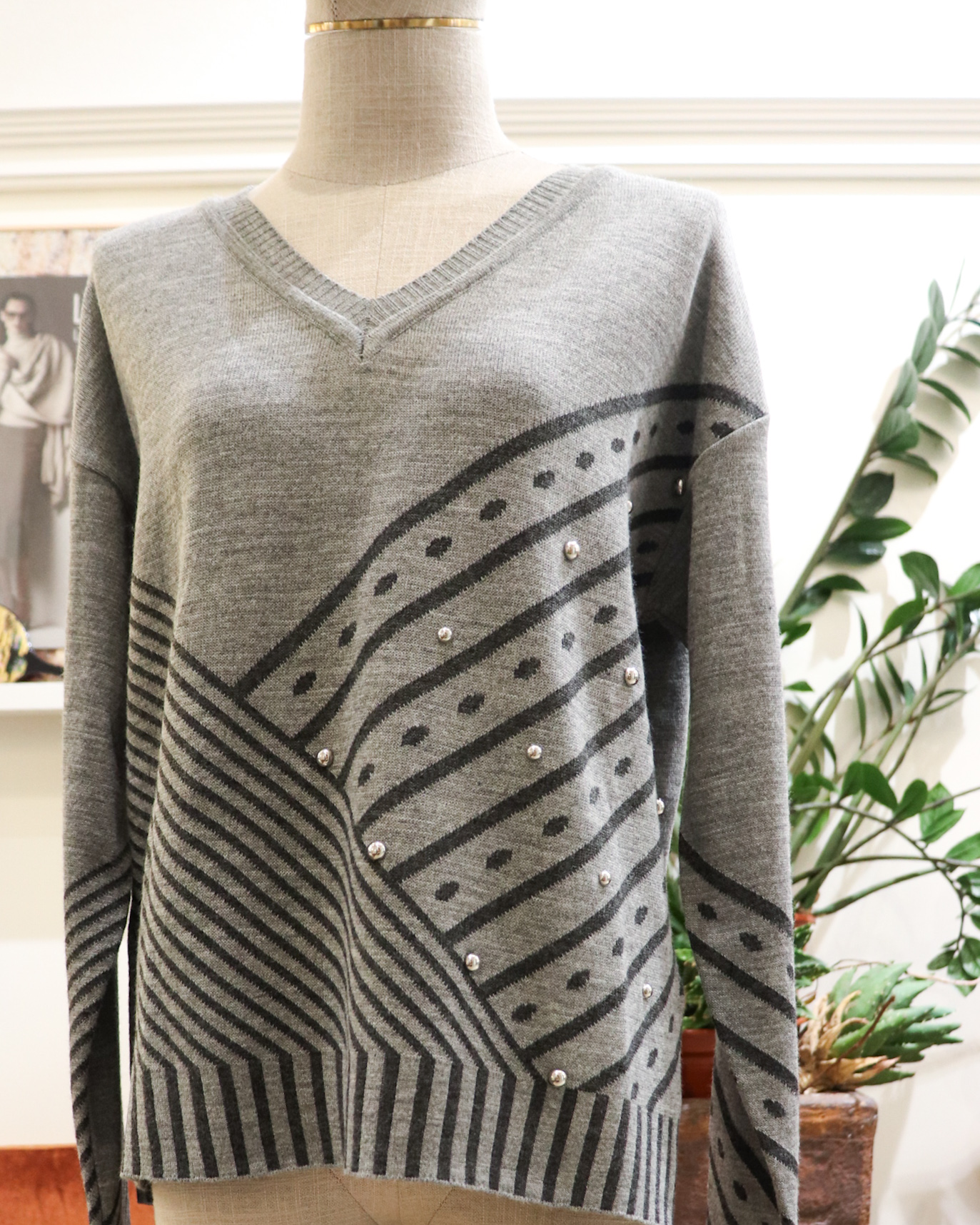 • Camisola cinza geométrica com pérolas e decote em V no manequim