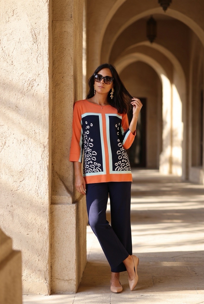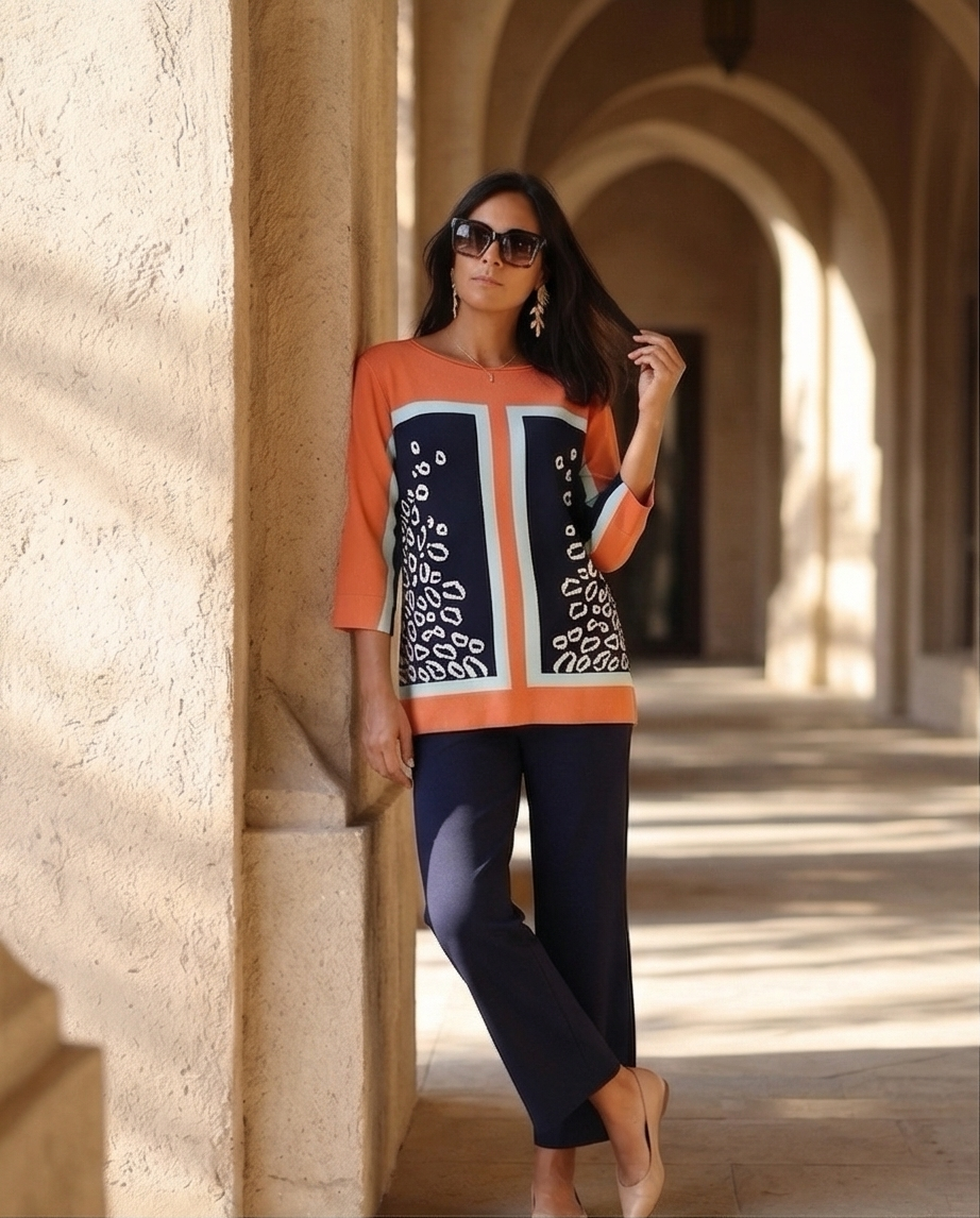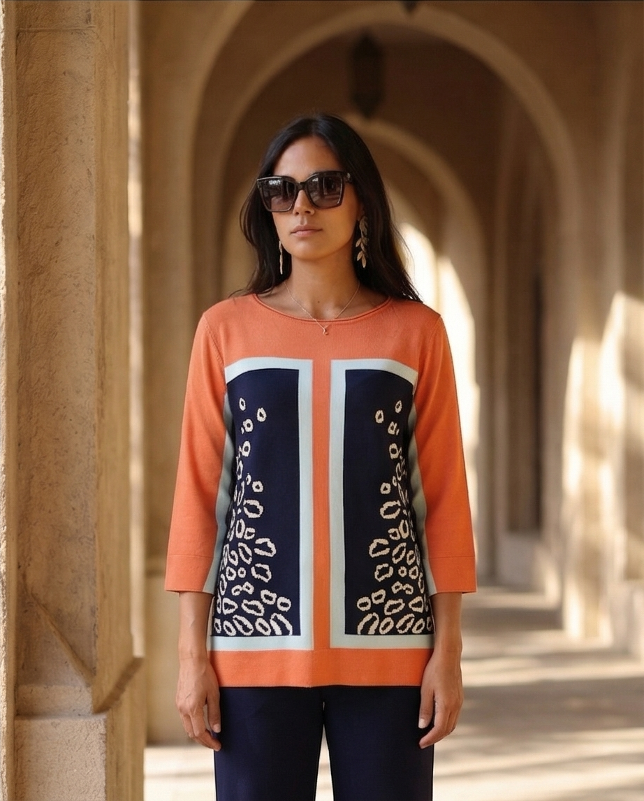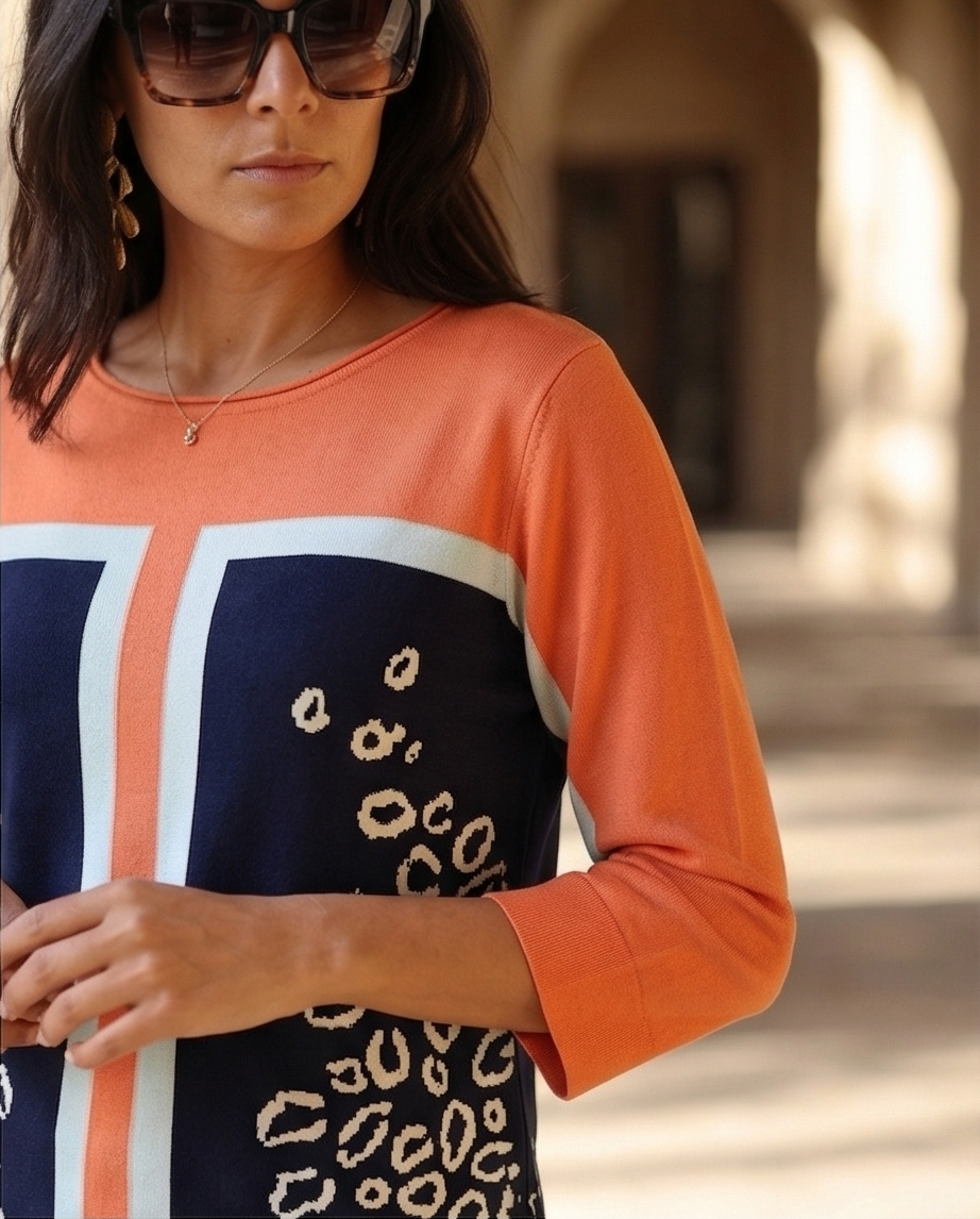Camisola Pingo Doce 119,40 € Desconto de %. Partilhar Tamanho L / XL Comprar Contactar Esta camisola tem um padrão geométrico e animal print nas cores laranja, azul-marinho e branco. É uma camisola com decote redondo e mangas a três quartos, tem um cair elegante.