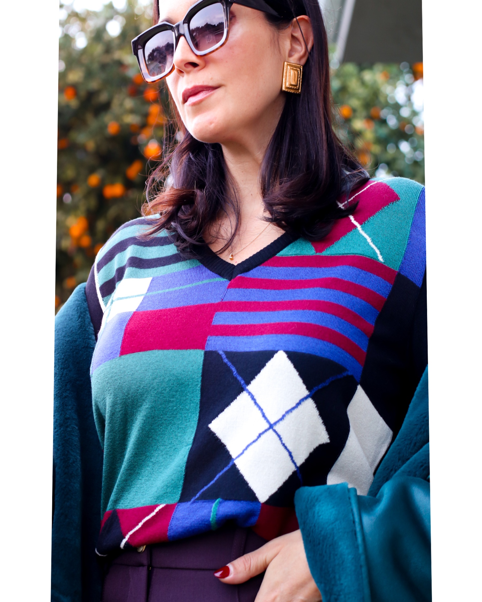 Camisola Taís 179,40 € Desconto de %. Partilhar Comprar Contactar Esta malha tem um design geométrico vibrante, com padrões de várias cores, gola em V. Cor: Verde, Preto, Azul, Bordô e Verde.