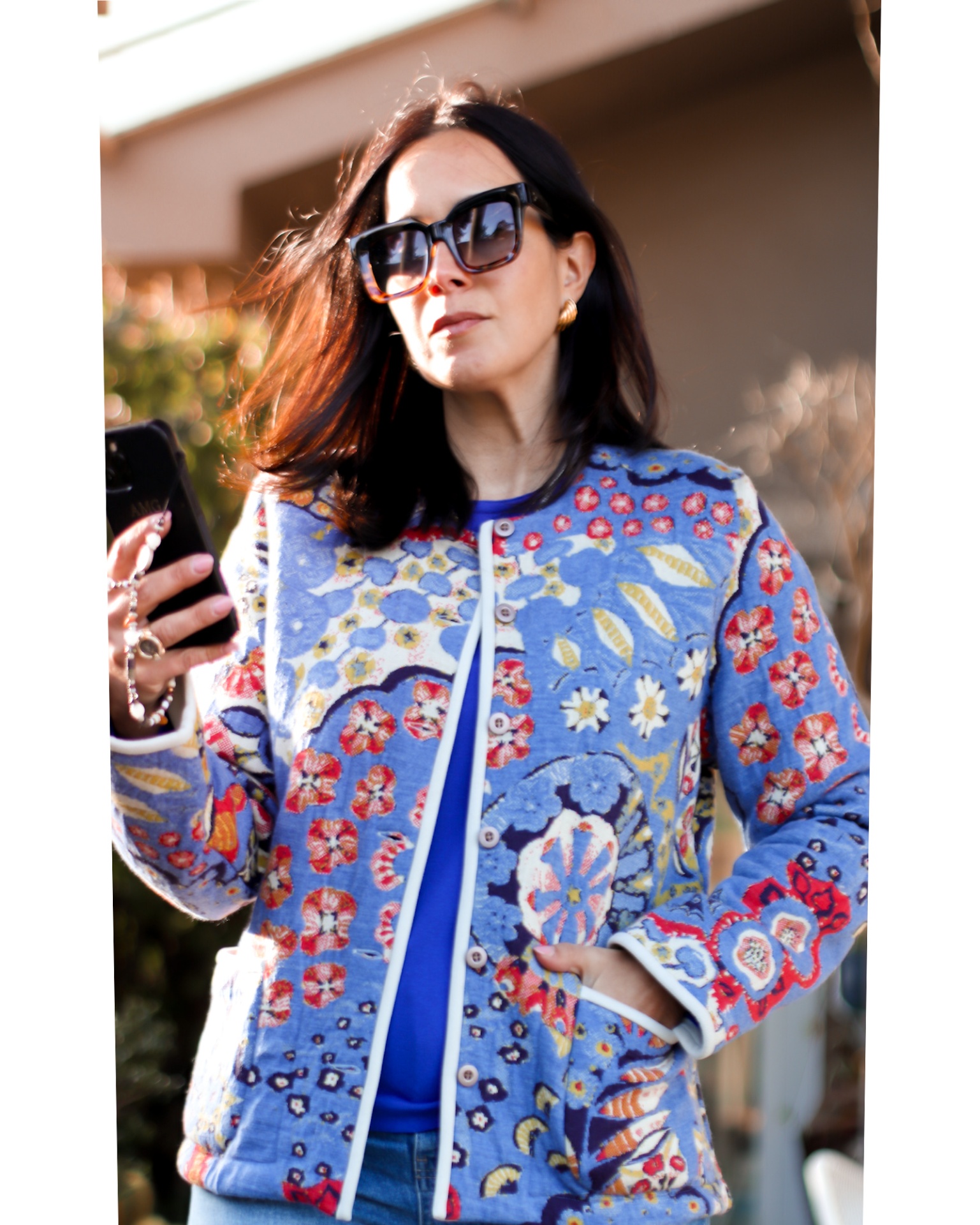 • Mulher com casaco azul floral e óculos de sol a segurar telemóvel