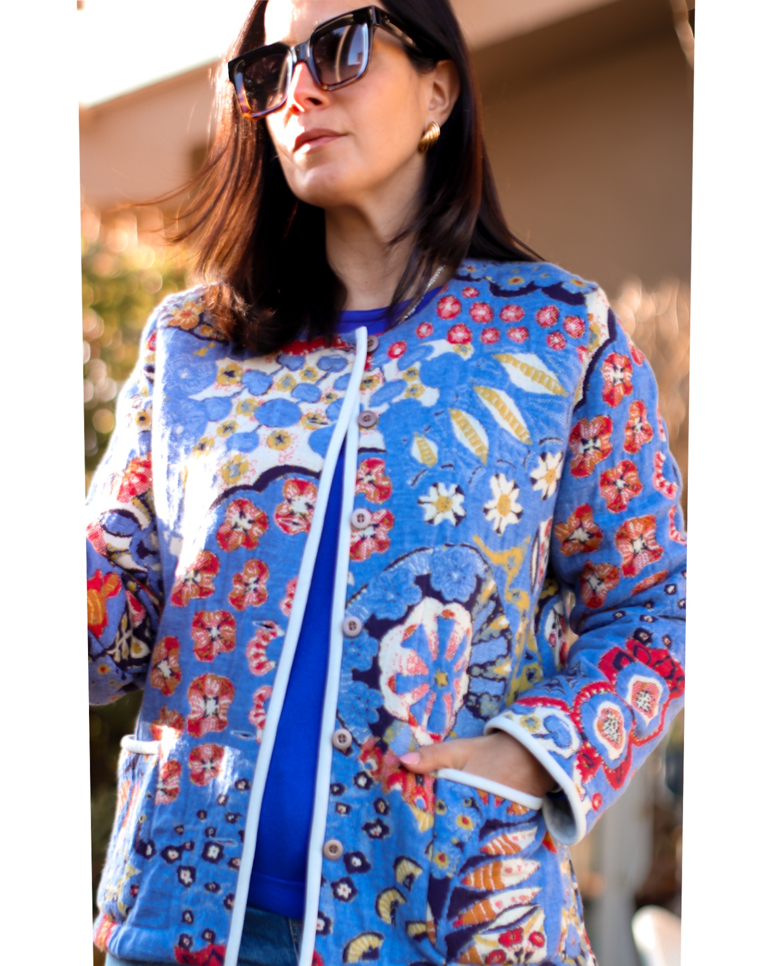 • Casaco com padrão floral colorido e botões, em ambiente exterior