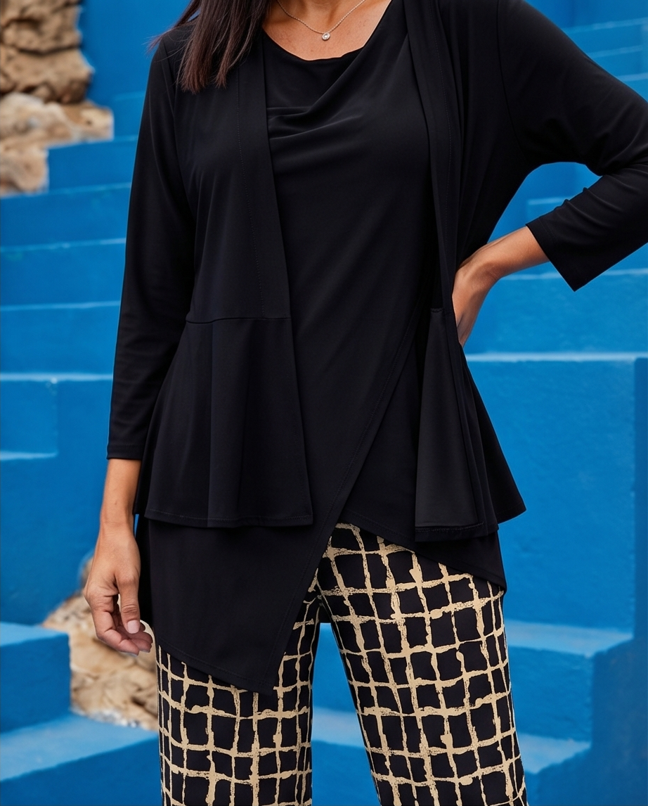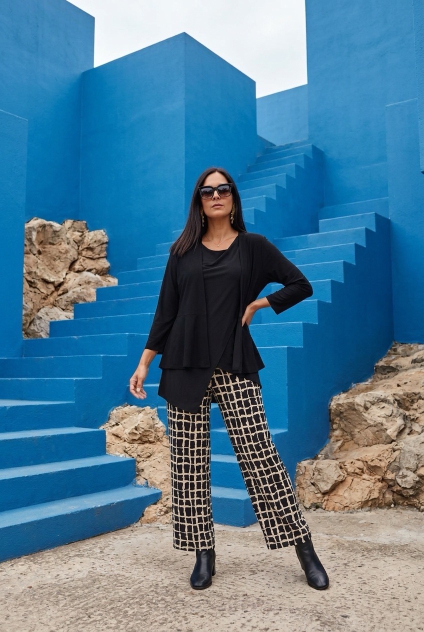Mulher com roupa preta e calças quadriculadas posa diante de escadas azuis e pedras. Casaco de malha Black 89,40 € Desconto de %. Partilhar Comprar Contactar Este casaco de malha é de corte fluido que o torna ideal para sobreposições leves, tem na cintura um folho. Ideal para o dia a dia. Cor: Preto