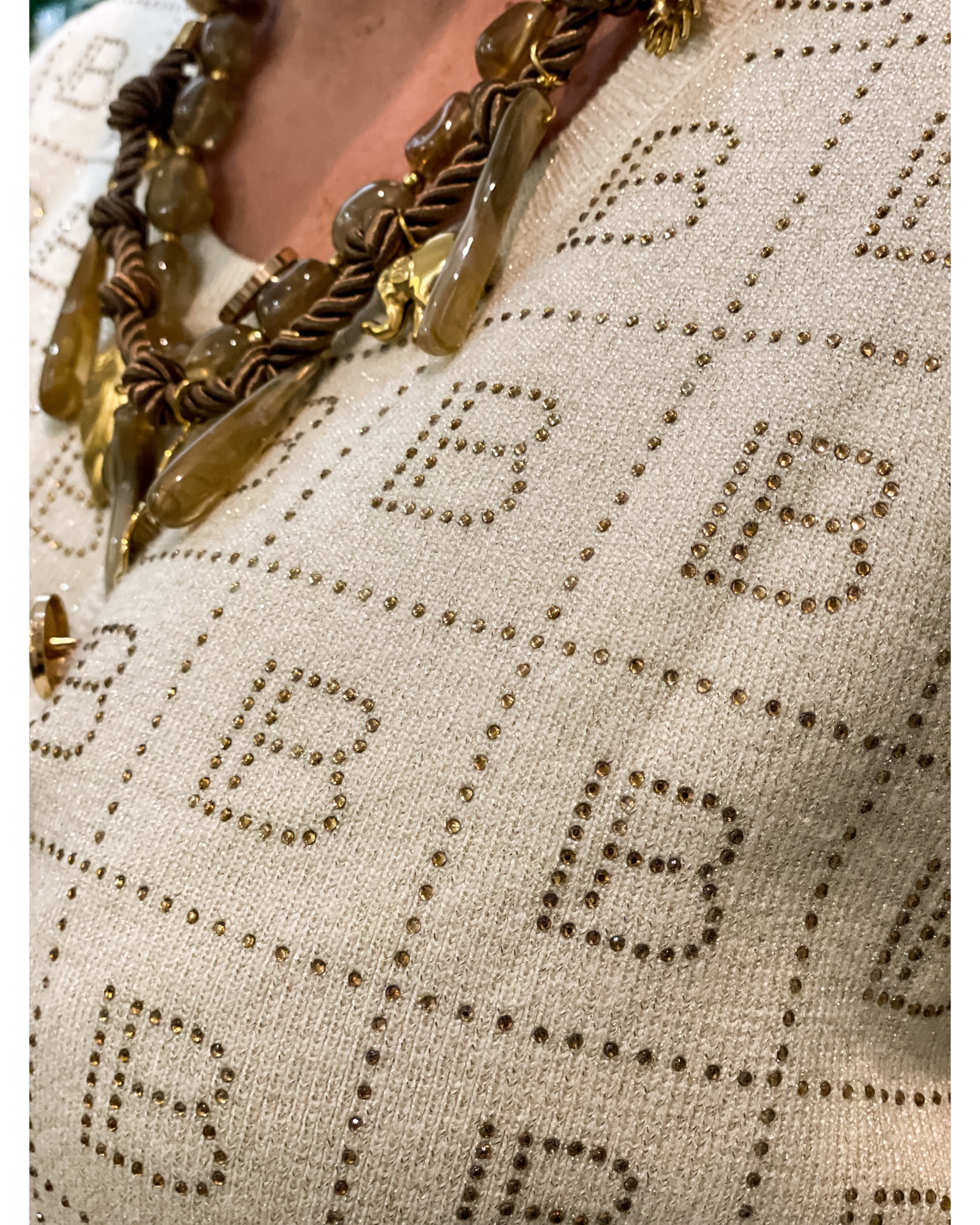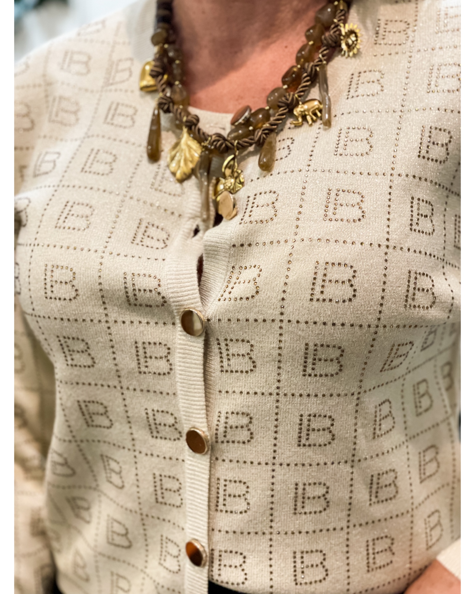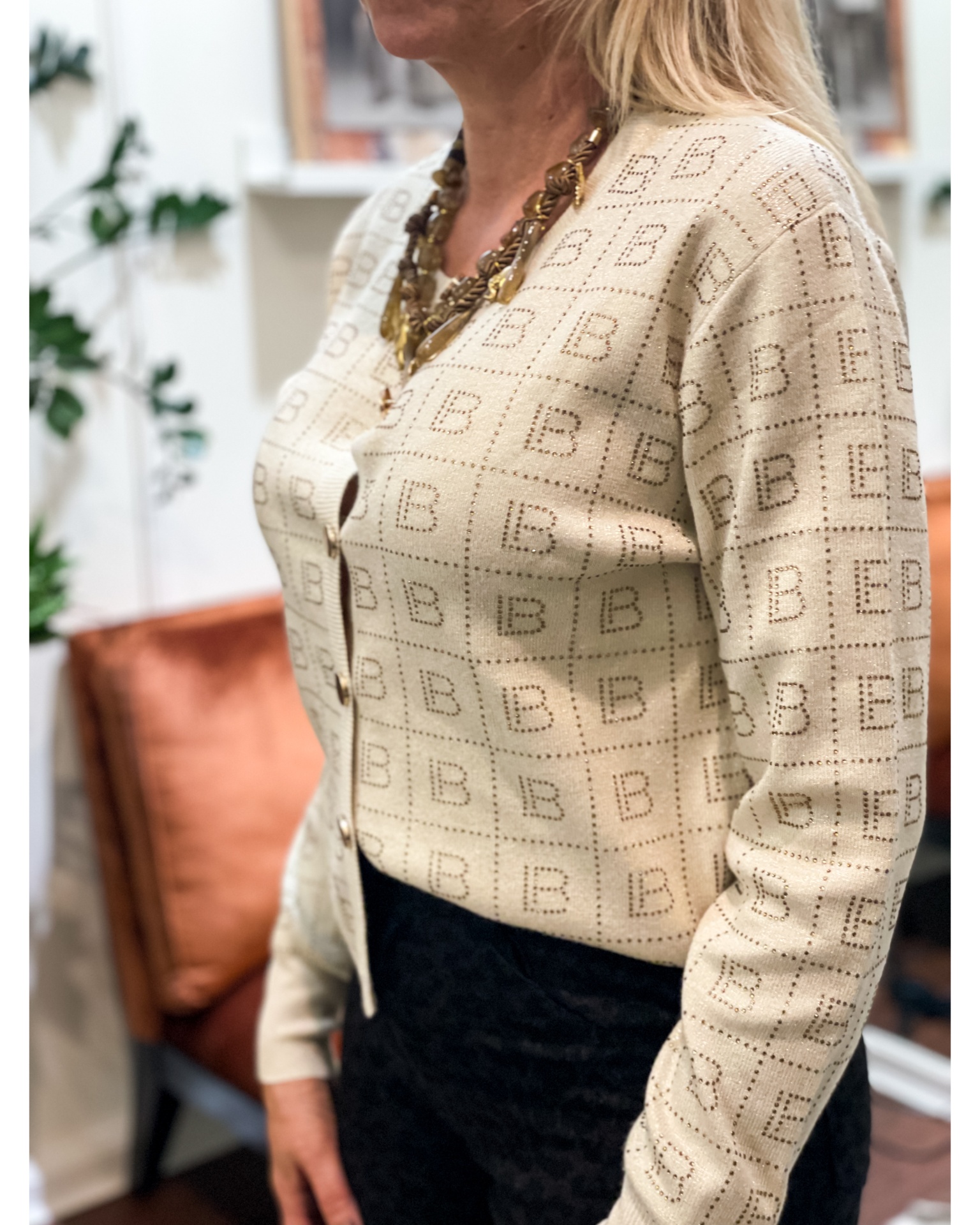 Este casaco apresenta um desig em malha estrutorada com um padrão geometrico, com um monograma composto pela letra "B" repetida por toda  peça. Tem botões dourados, que adionam um toque de luxo e sofisticaçao.