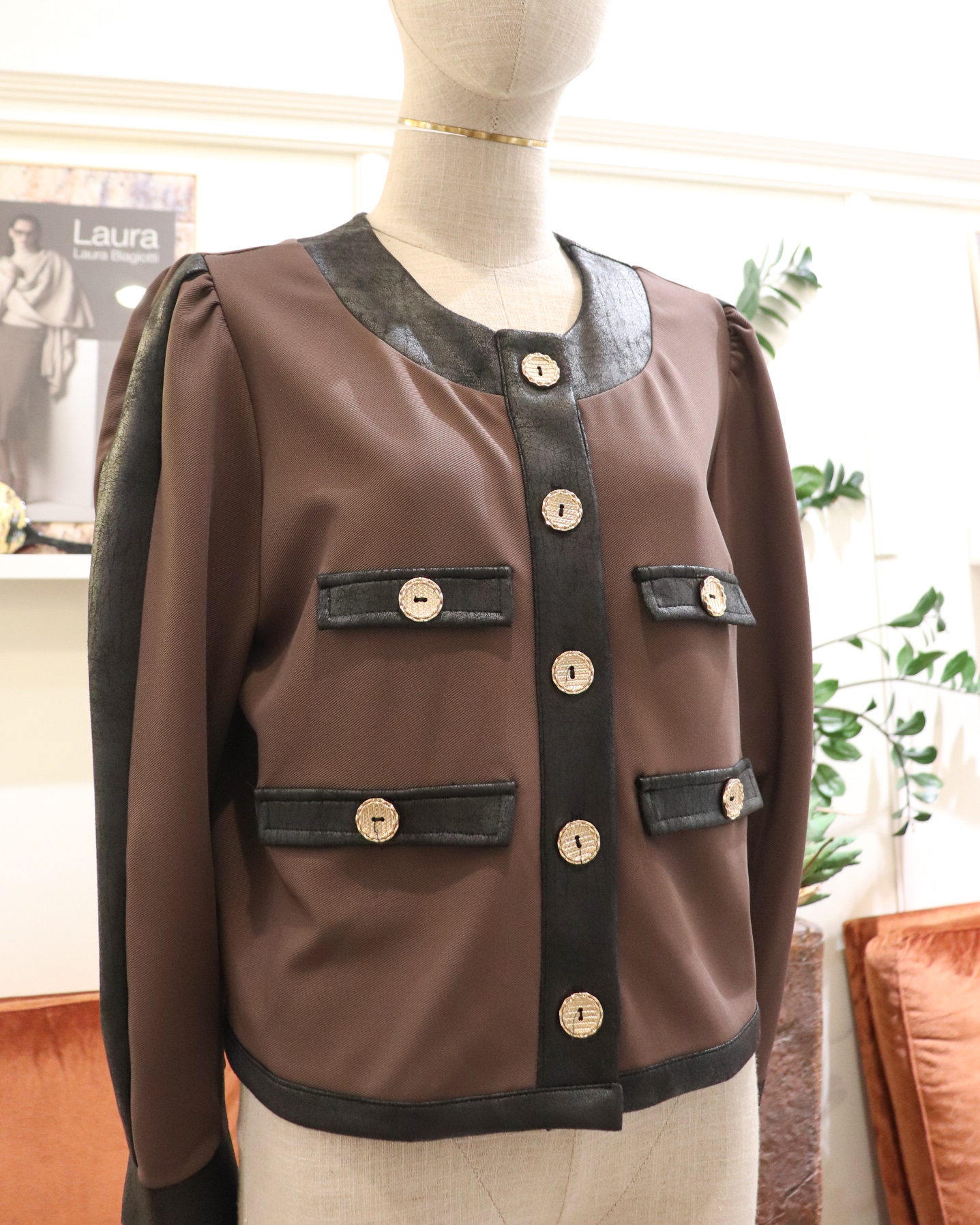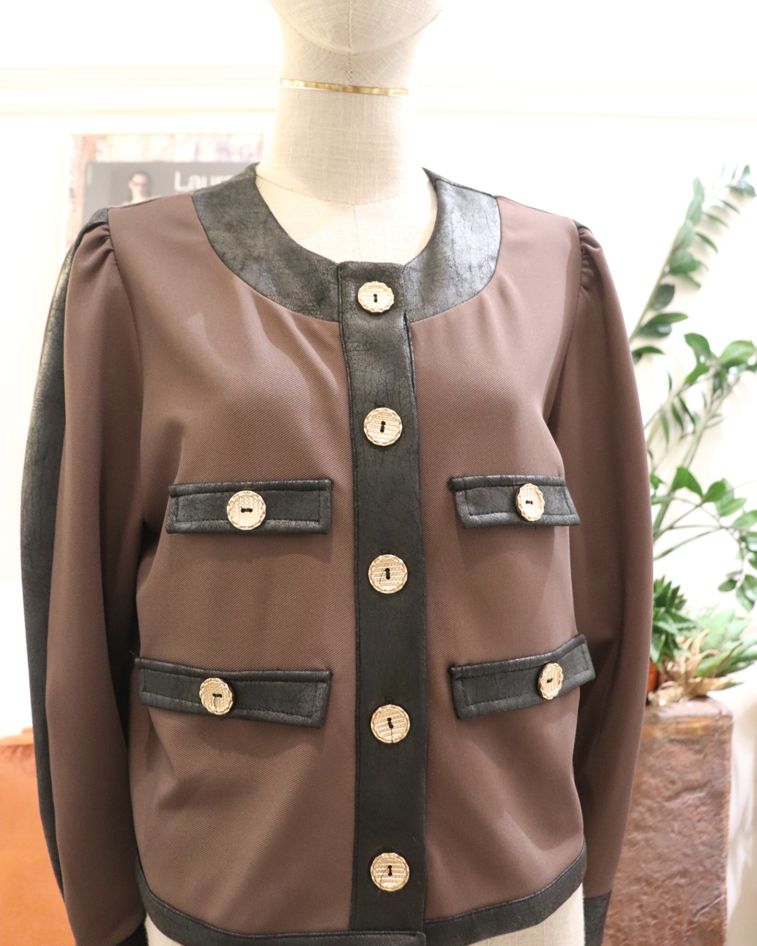 • Casaco castanho com bordas pretas e botões dourados num manequim branco