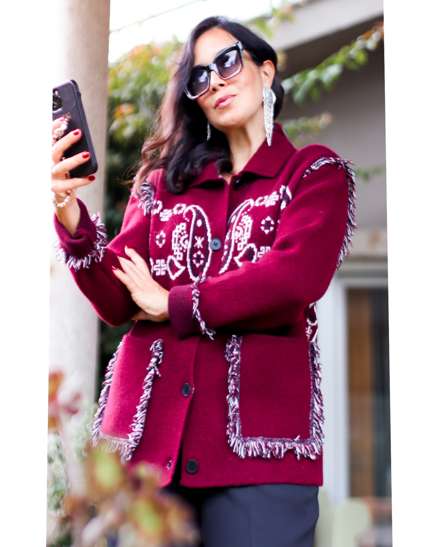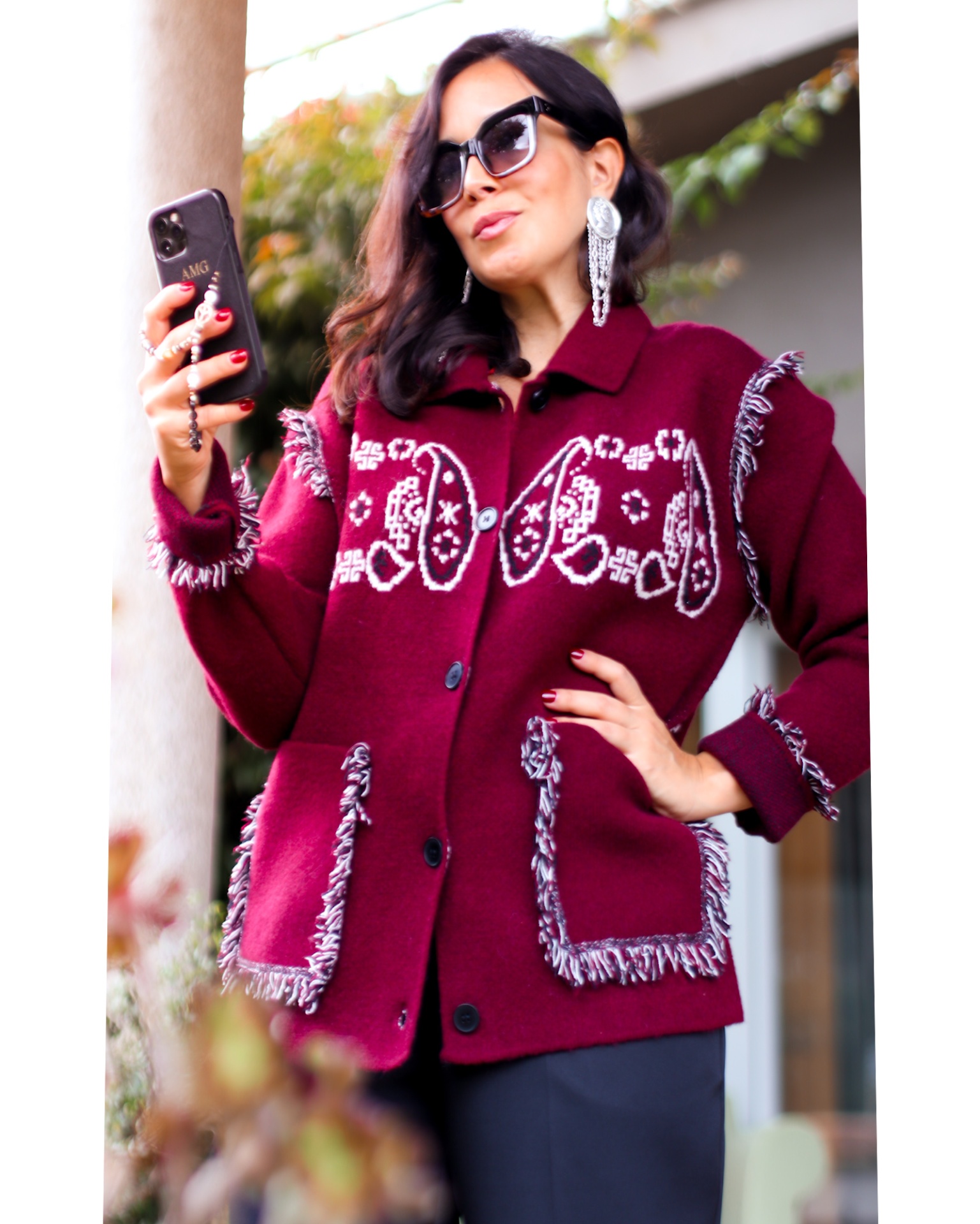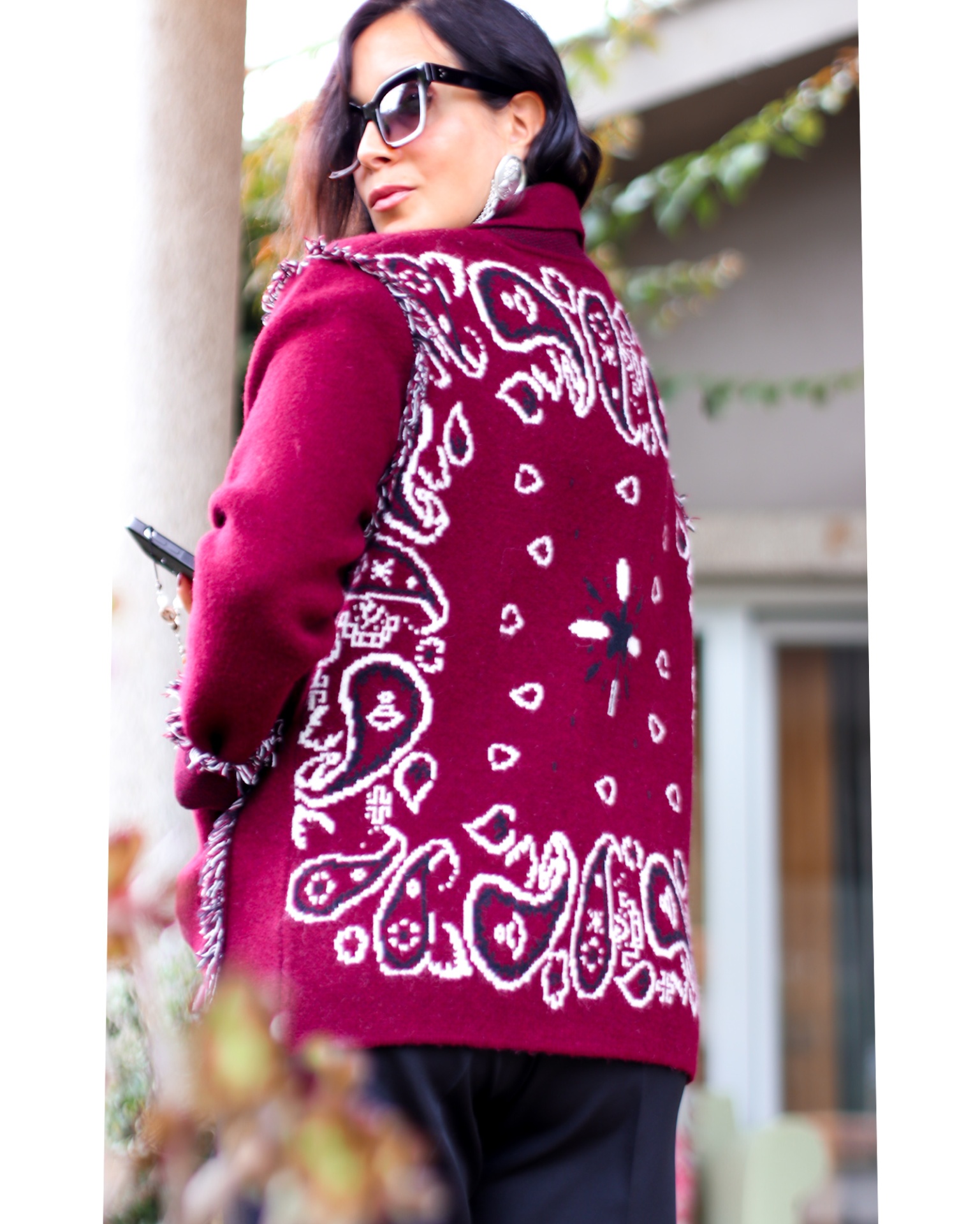 Casaco Mafalda 89,40 € Desconto de %. Partilhar Comprar Contactar É um casaco de malha arrojado, tem uma textura muito aconchegante. Apresenta detalhes paisley entrelaçado na frente e nas costas, bolsos frontais com acabamentos em franjas multicores. Cor: Vermelho, Preto e Branco Tamanho unico