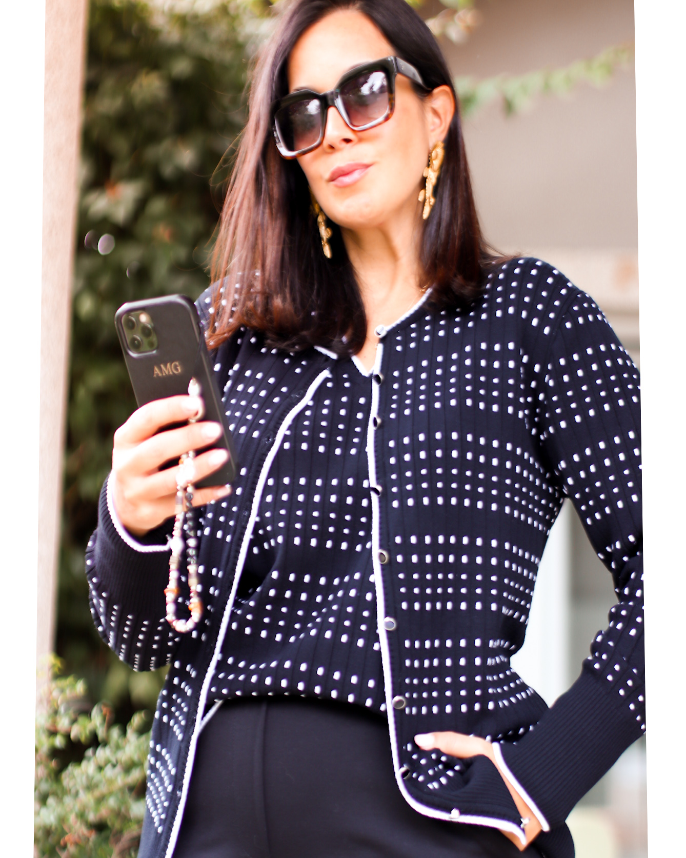 Casaco de malha canelado em preto com pequenos pontos em branco dispostos na vertical. Gola redonda com botões na frente. Tem camisola com o mesmo padrão para fazer conjunto.