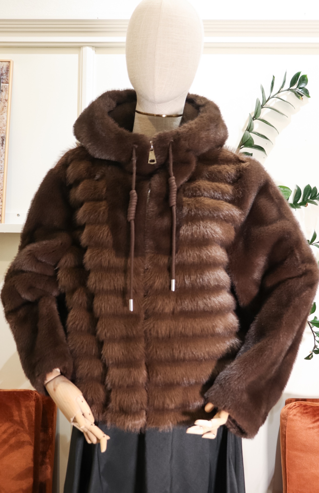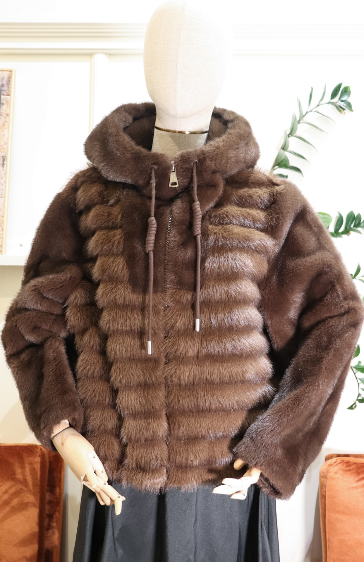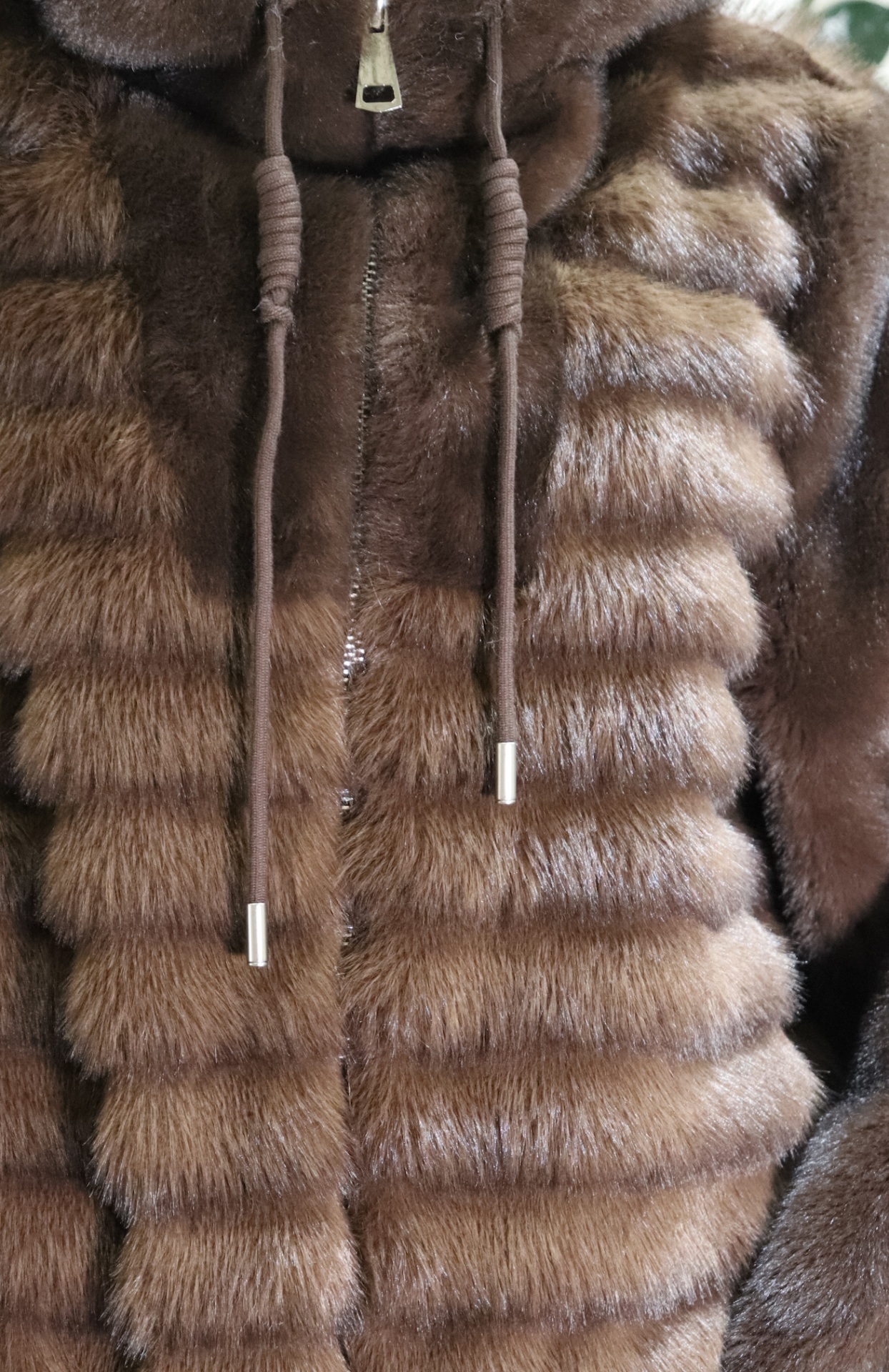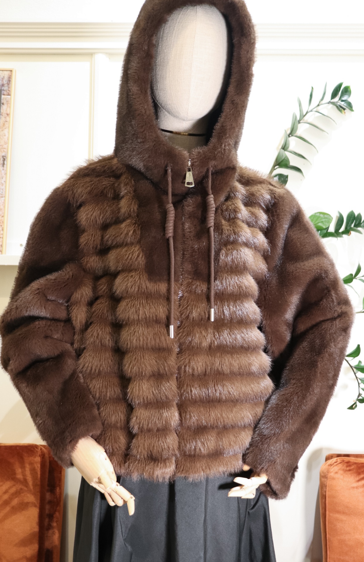 É um casaco de pelo de alta qualidade, possui paineis na horizontal e fecho decorrer na frente. Tem carapuço, um agasalho contempôraneo e luxuoso, adequado para o tempo frio.