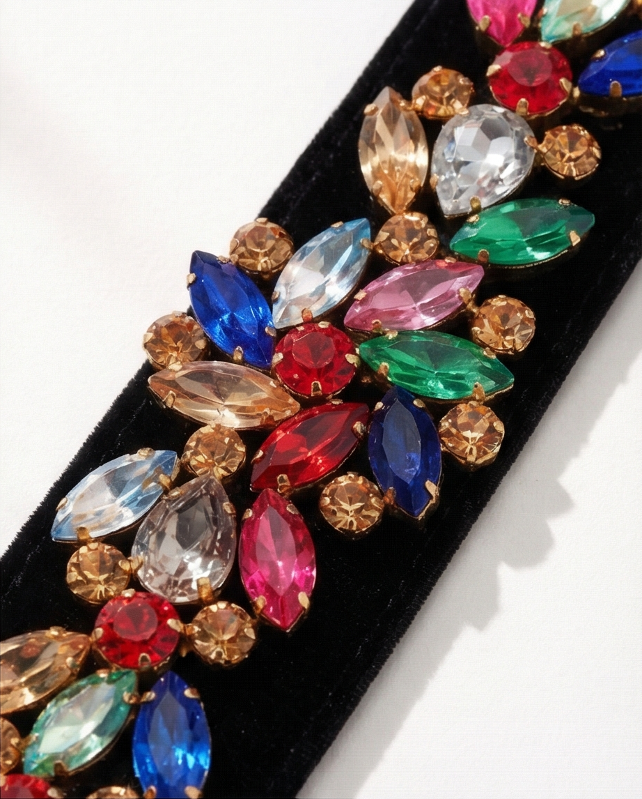 • Pulseira de veludo preto com pedras coloridas decorativas.