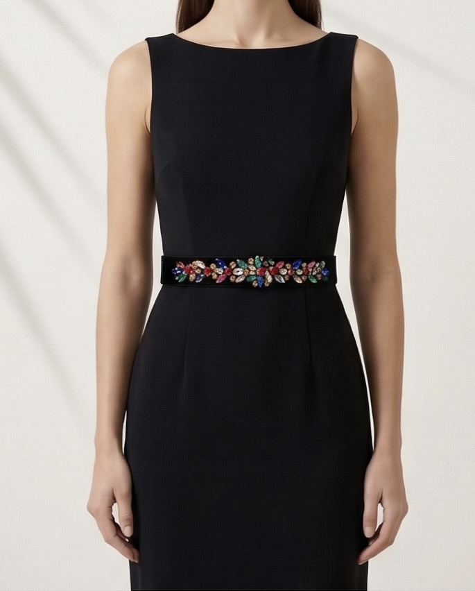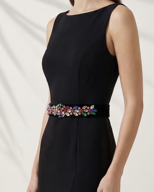 • Vestido preto justo com cinto decorado de pedras coloridas.