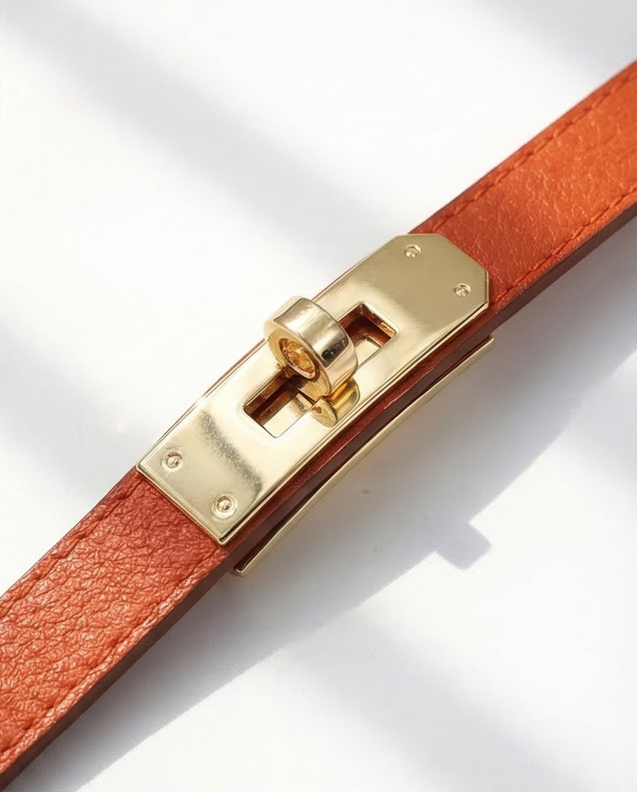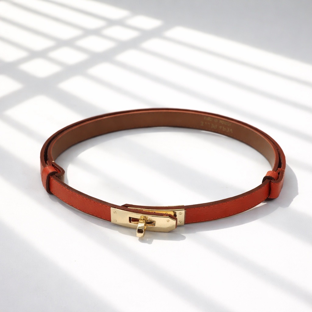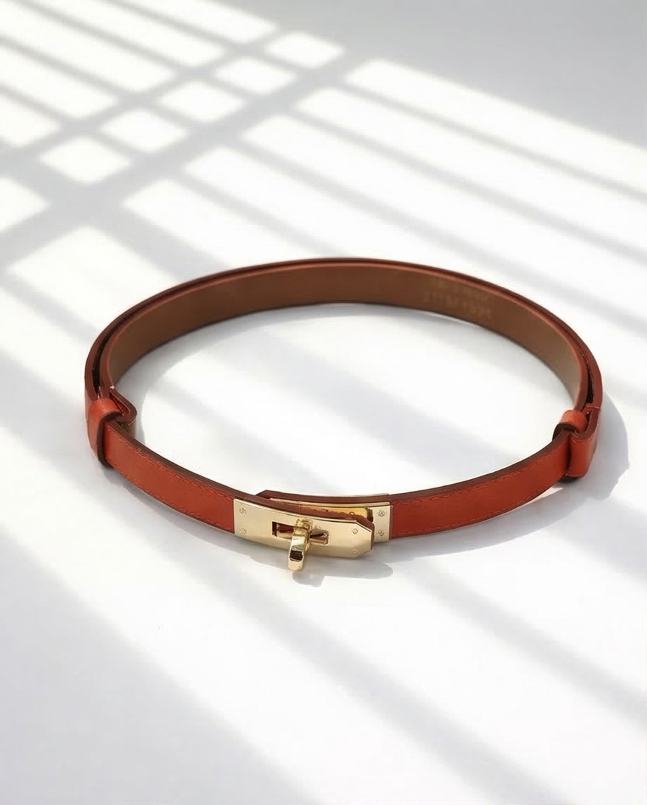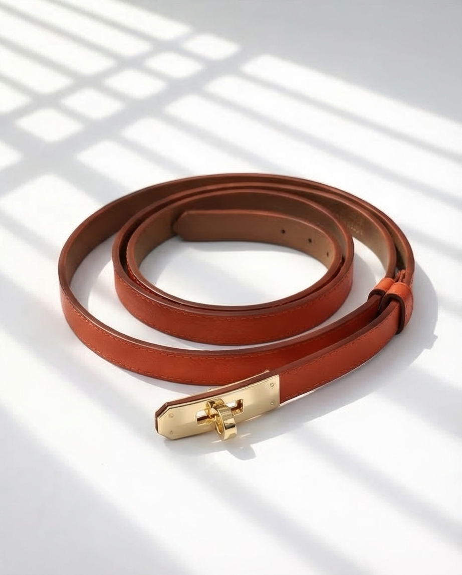 • Cinto fino castanho com fivela dourada sobre fundo branco com sombras