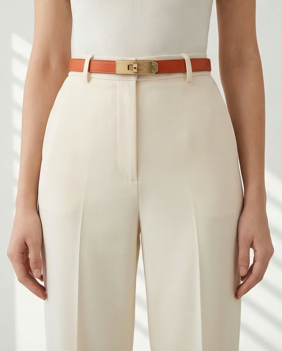 • Cinto castanho estreito com fivela dourada em calças brancas