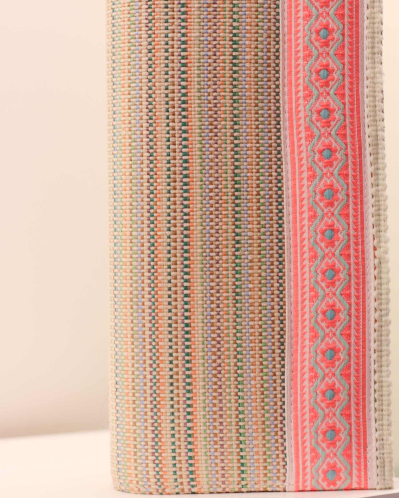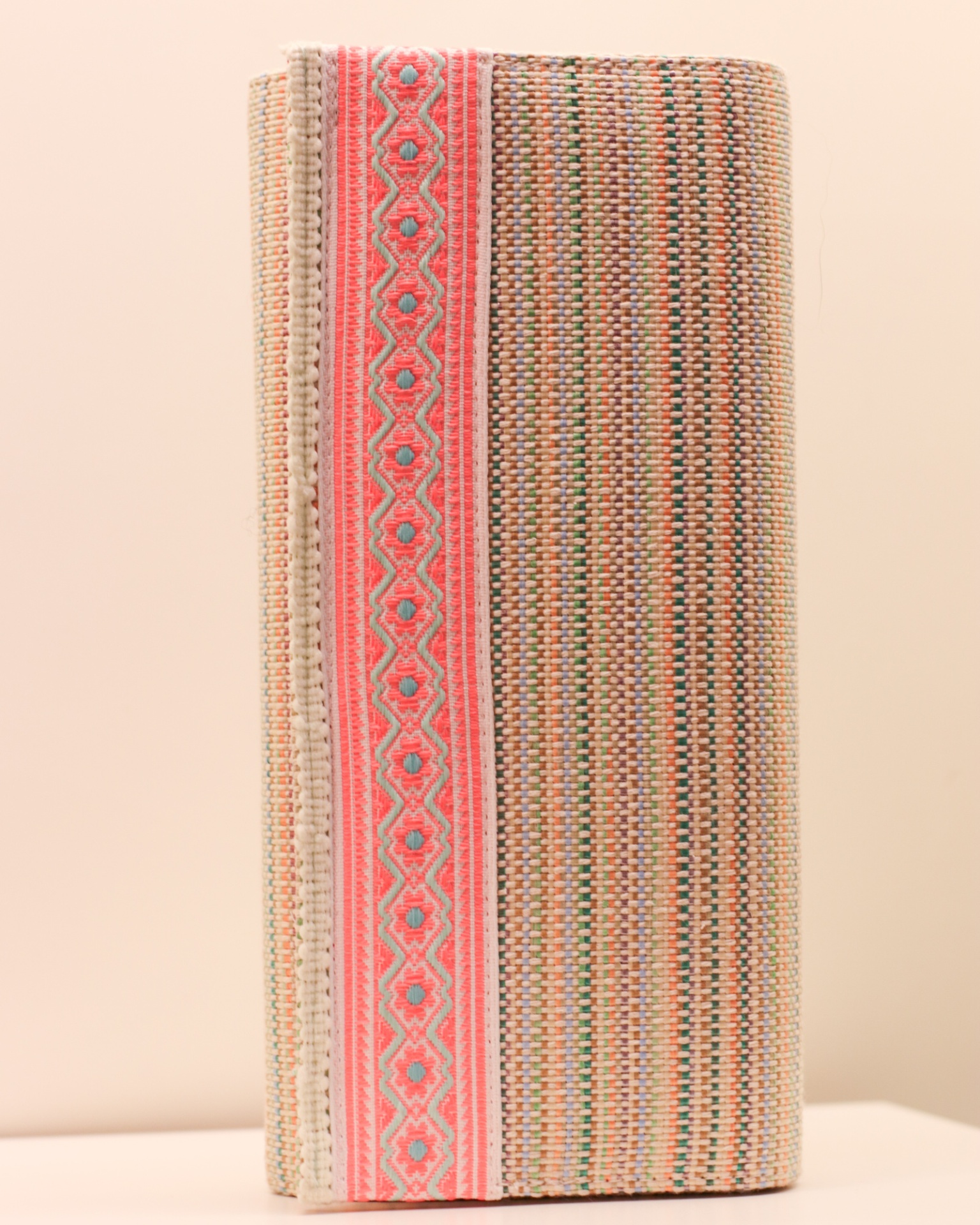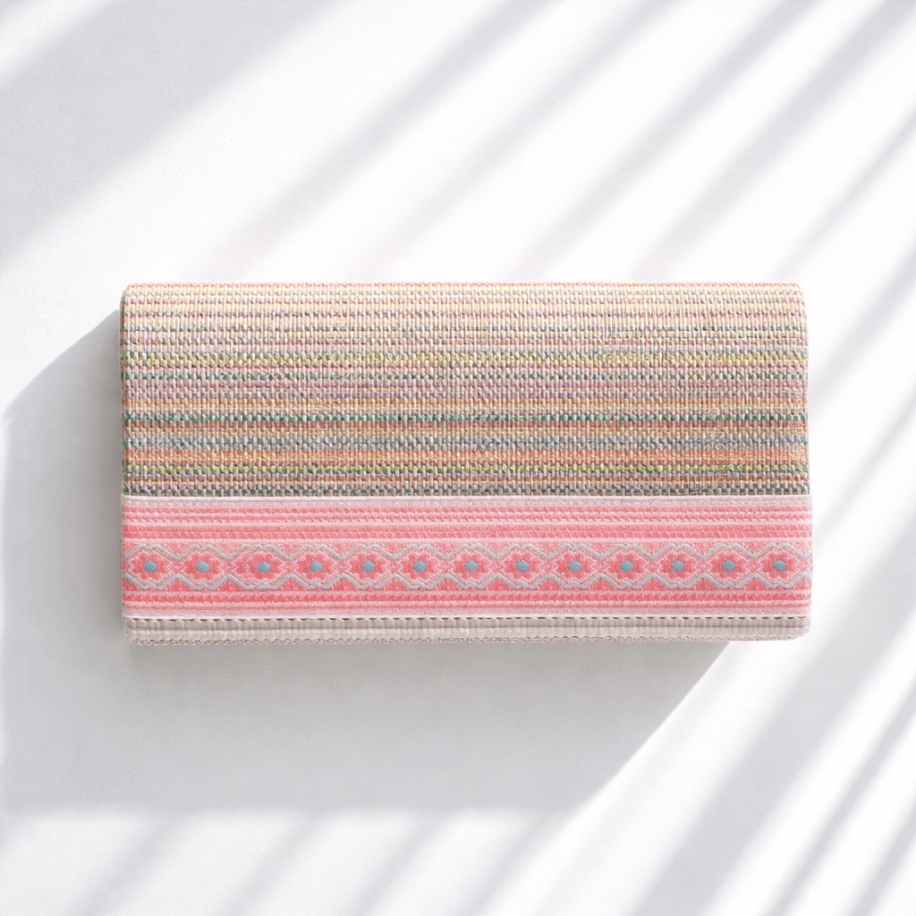 • Carteira em tecido com padrão de listras em tons pastel e faixa decorativa rosa