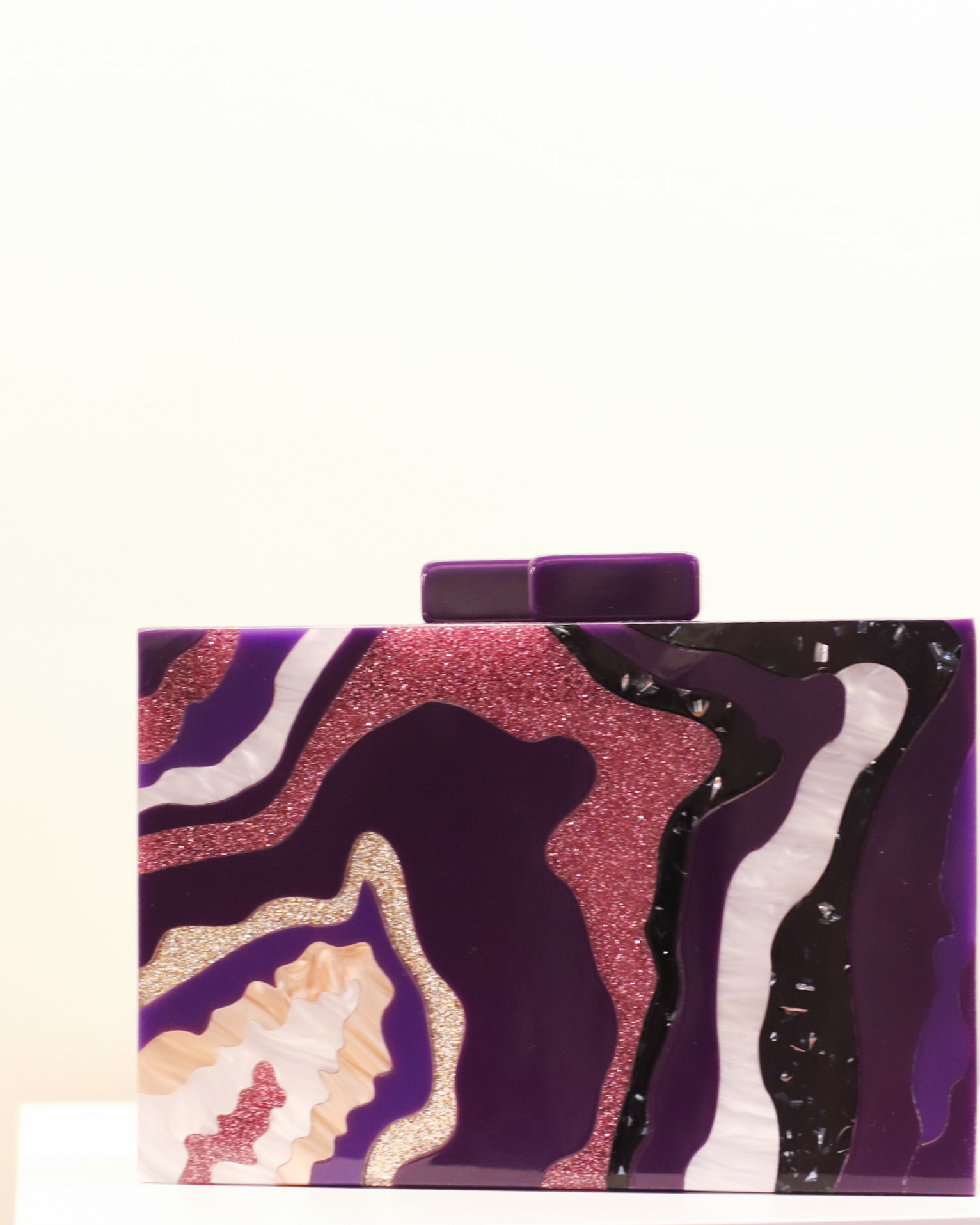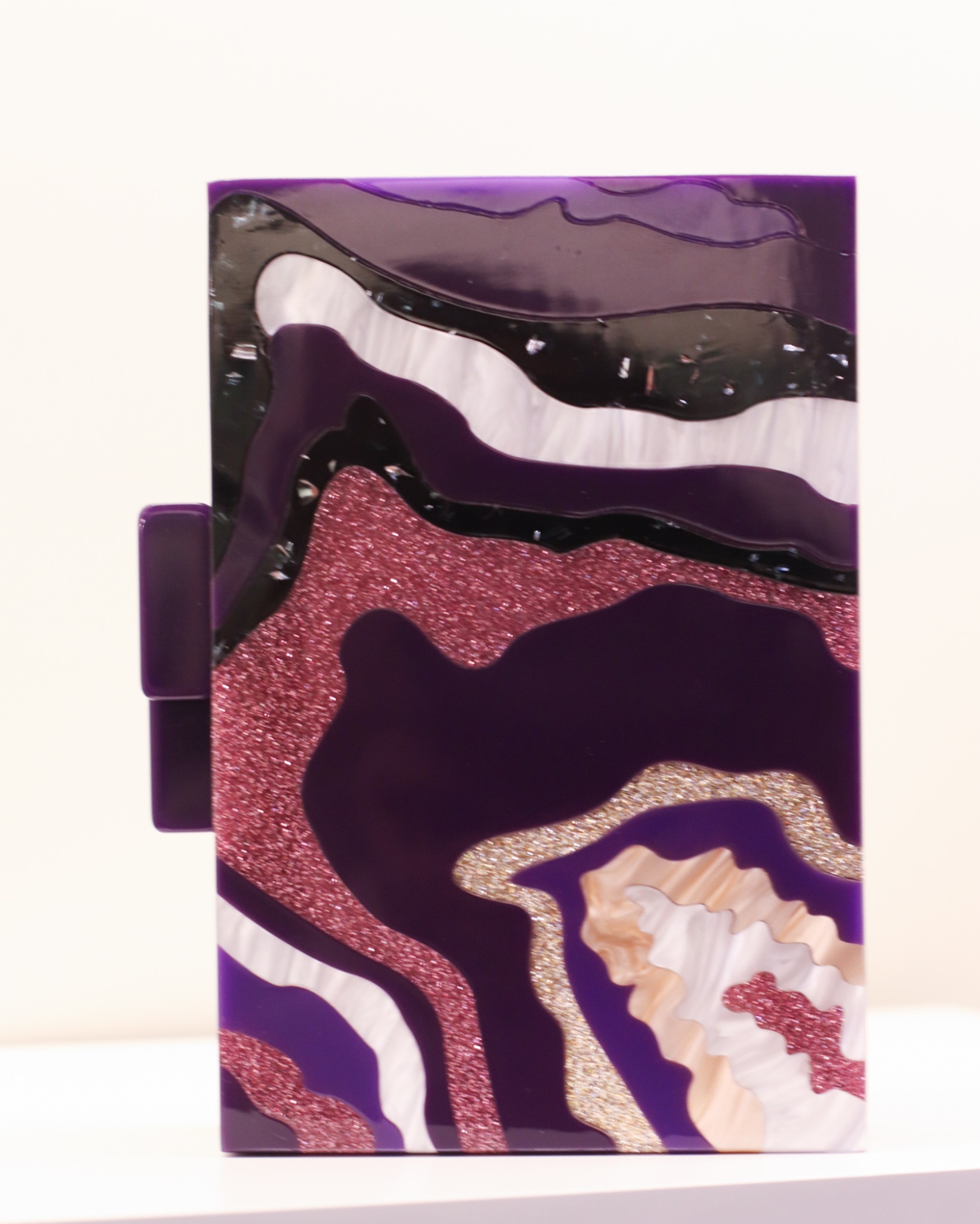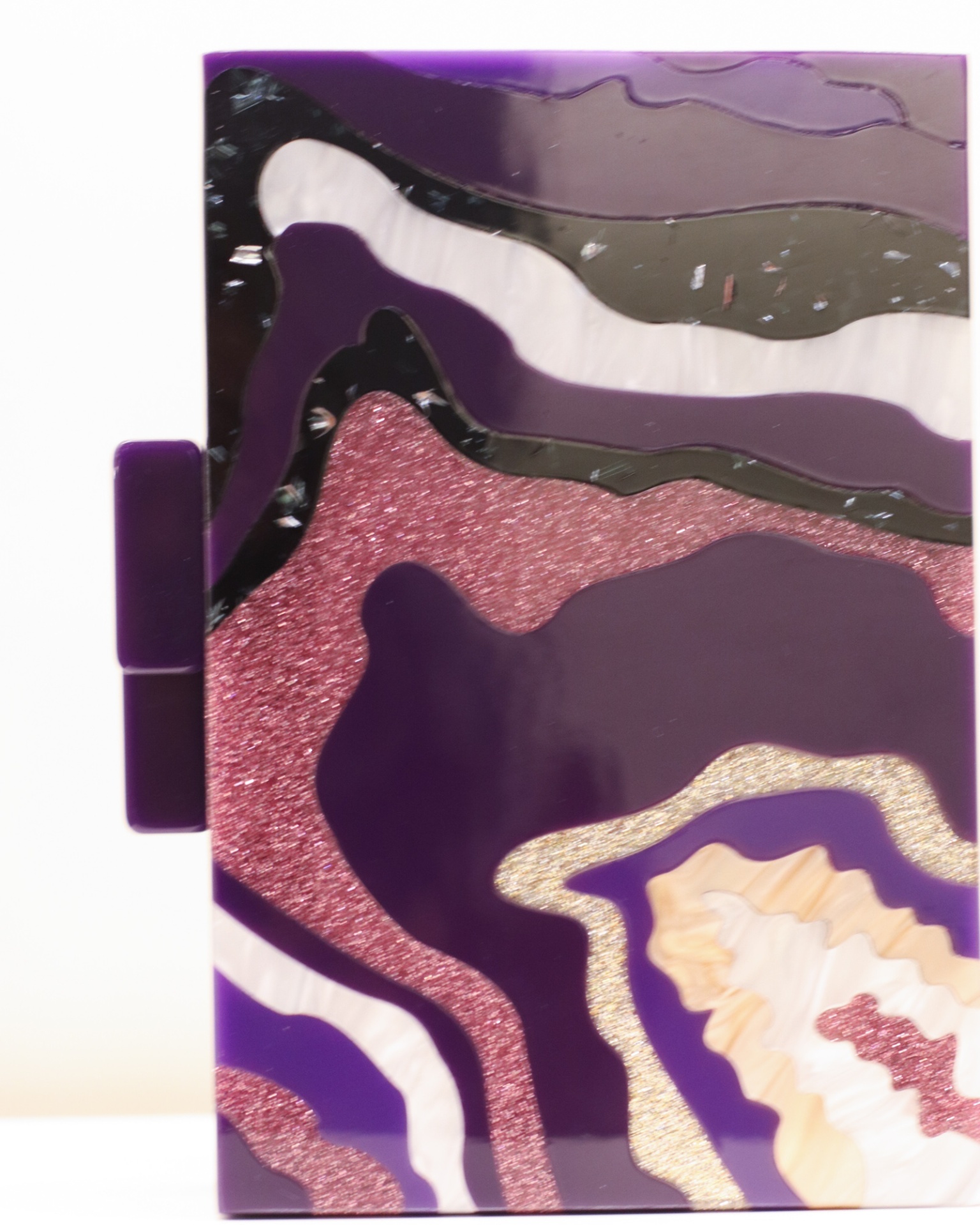 Clutch em acrílico com um design inspirado em formas de ondas em tons de roxo, dourado, preto, beje, com detalhes em glitter que imitam pedras naturais.