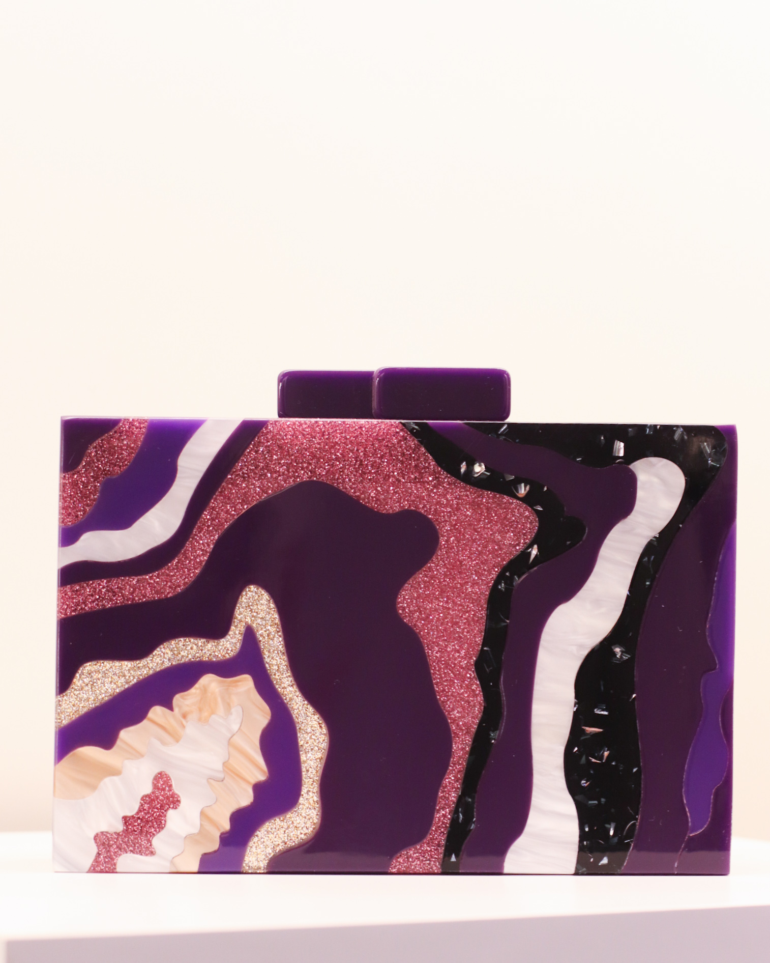 • Bolsa clutch acrílico com padrão de camadas roxas e rosa glitter