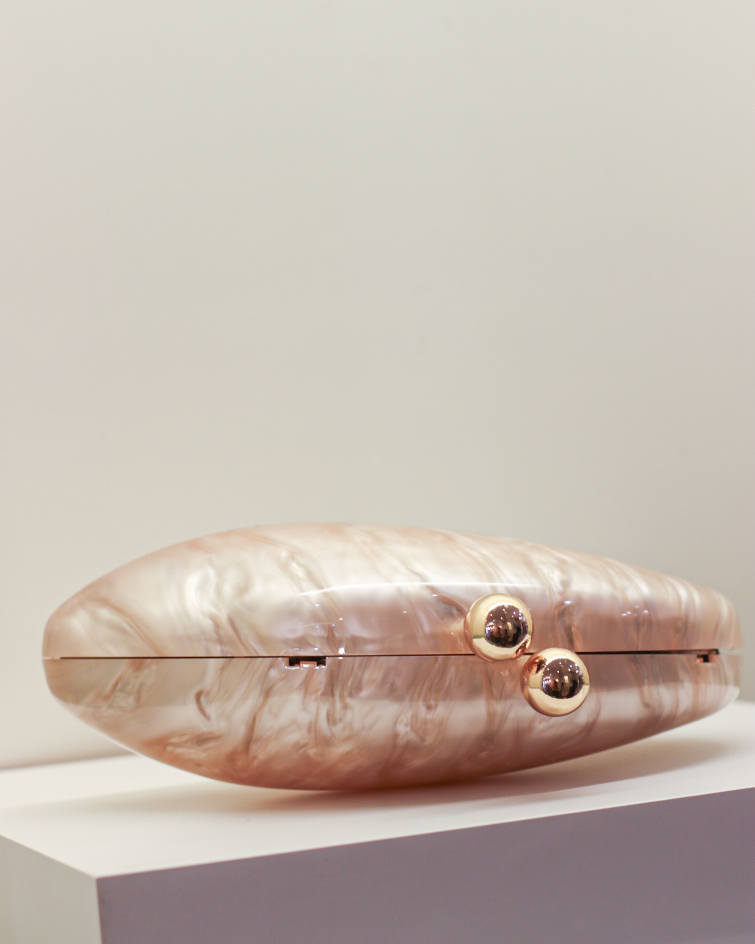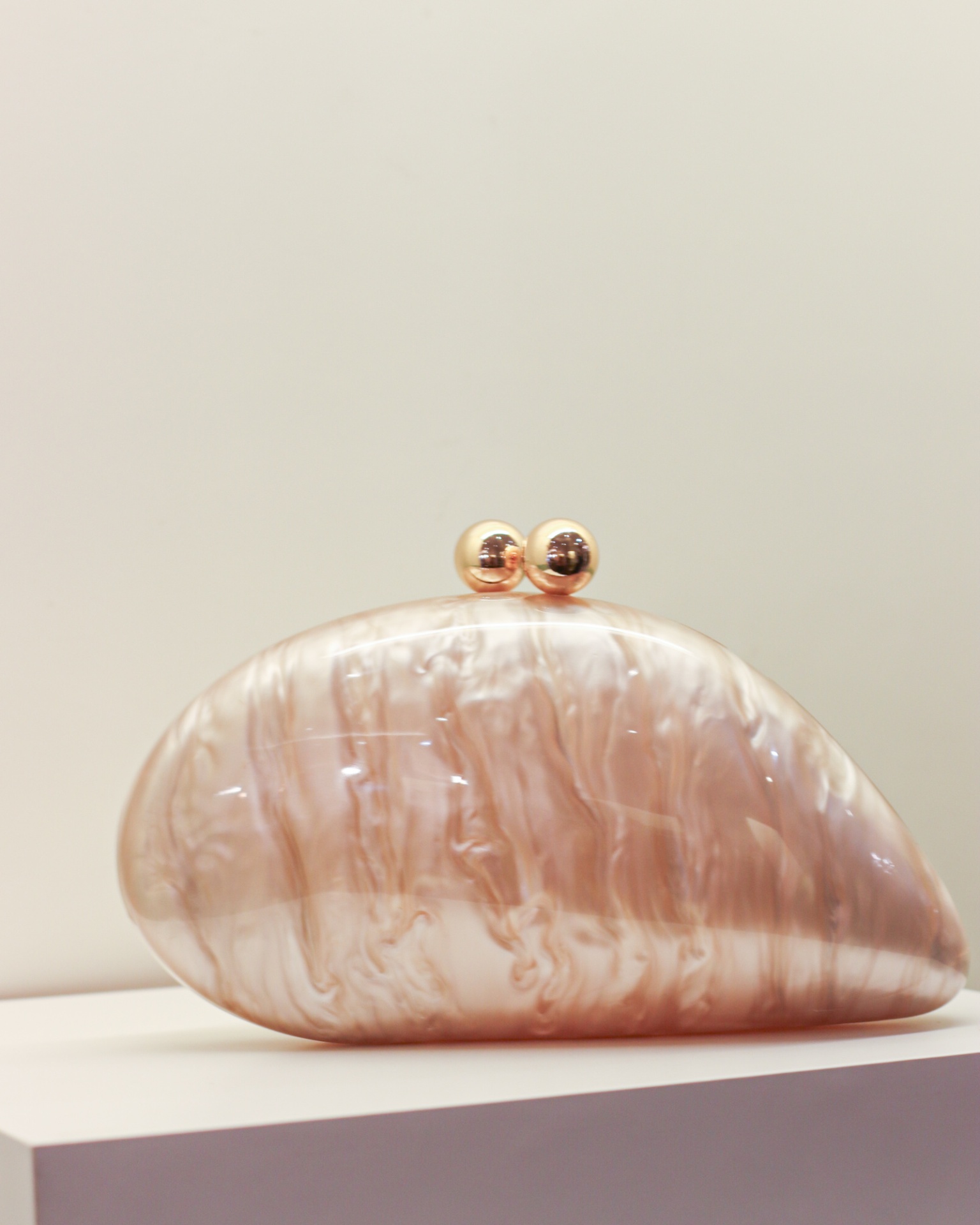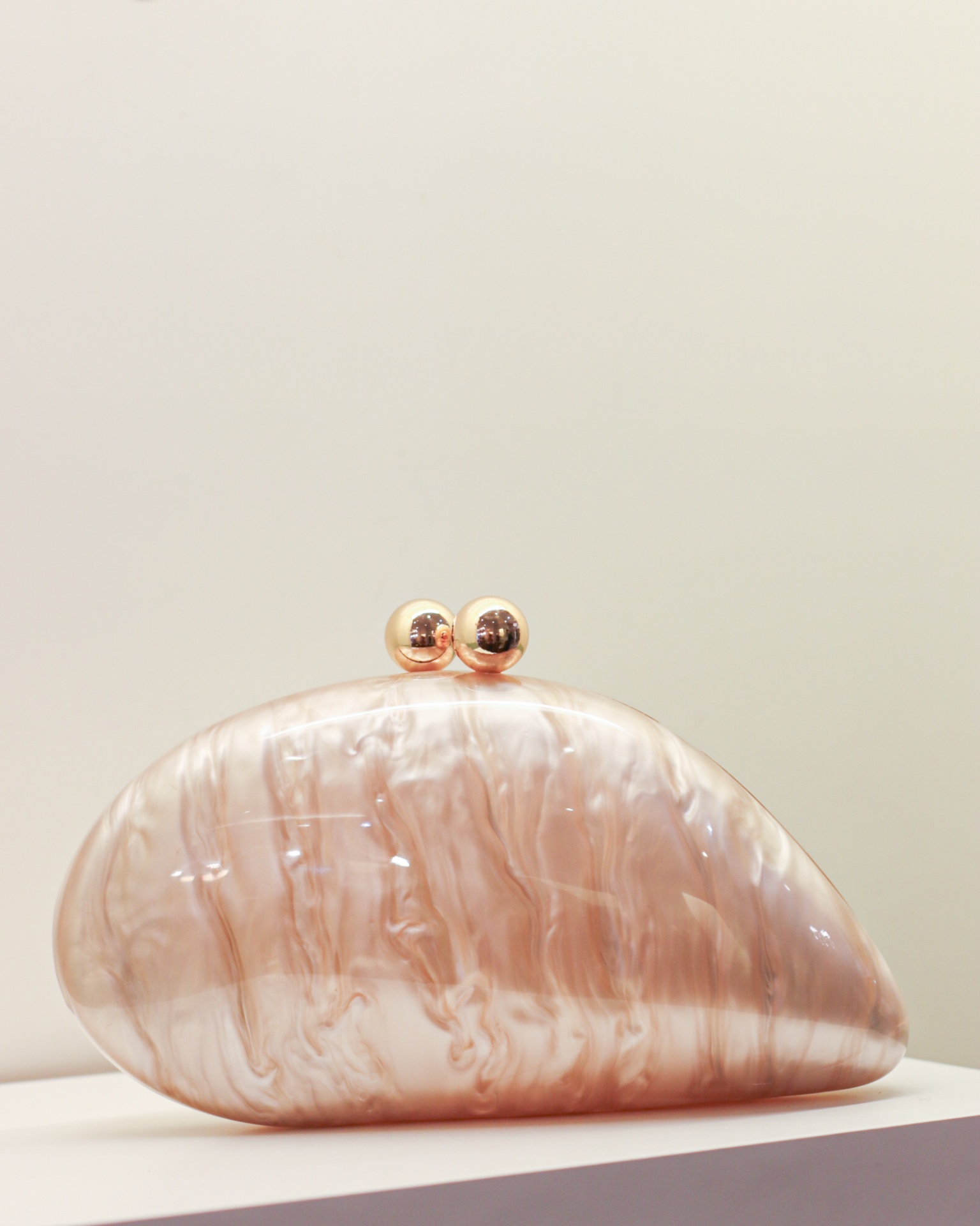 Clutch em acrílico com acabamento marmoreado. É um acessório para eventos formais como casamentos e festas. O modelo é de forma oval tem um fecho de metal dourado com duas esferas.