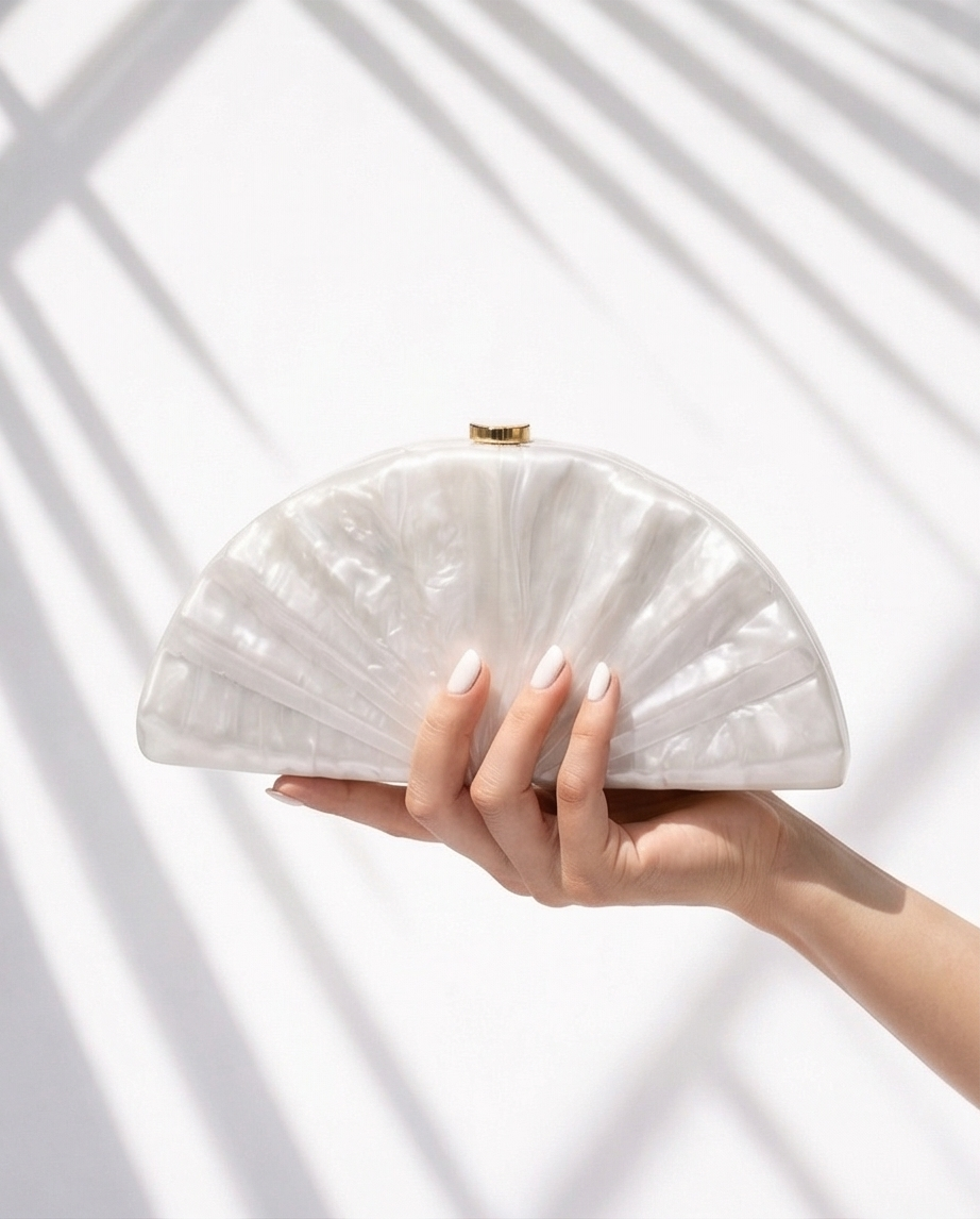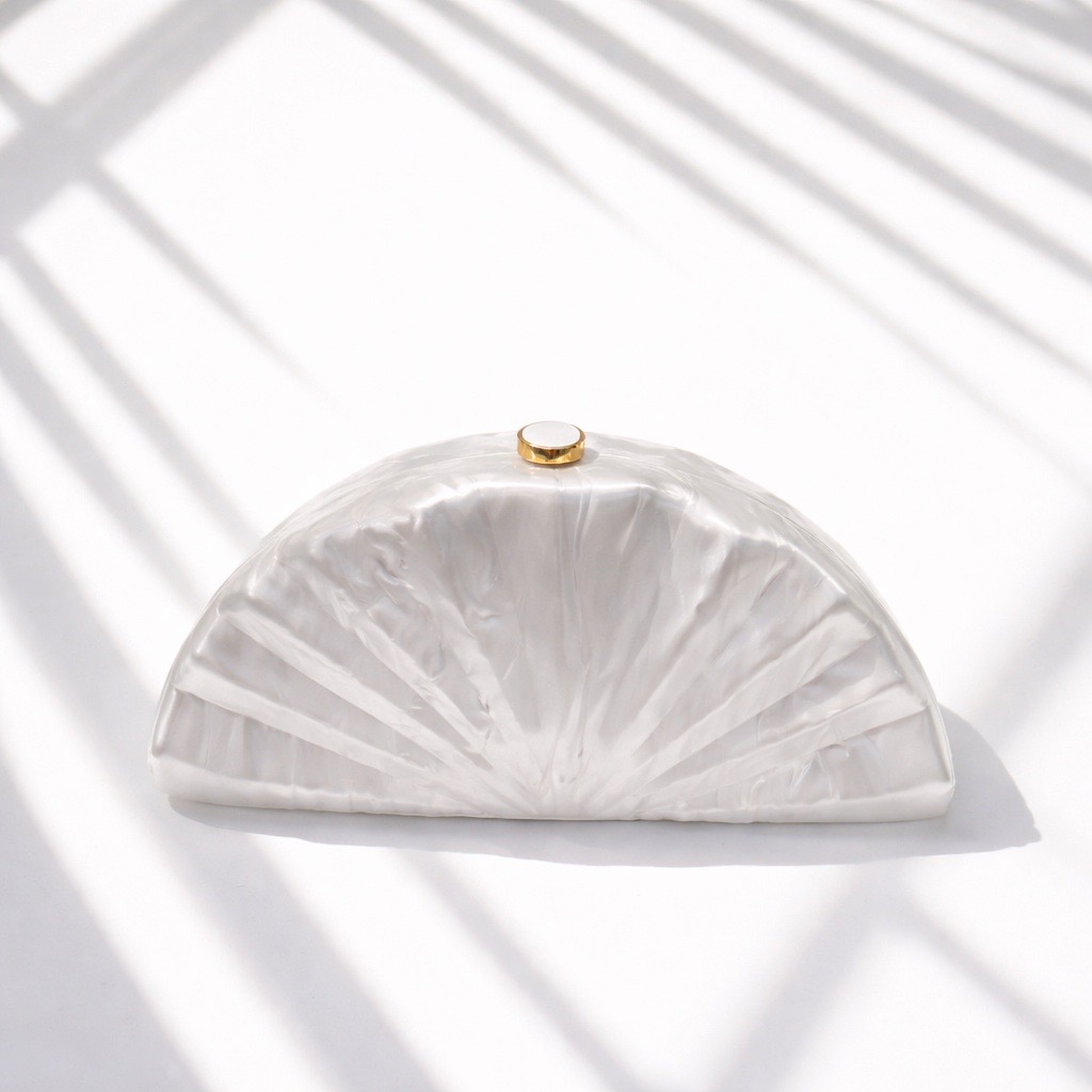 Clutch White Fan 49,40 € Desconto de %. Partilhar Comprar Contactar Esta clutch é de acrílico com o formato de leque com o acabamento marmorizado branco. É um acessório sofisticado, ideal para eventos formais como casamentos e festas, tem uma corrente dourada removível para usar ao ombro. Cor : Branco