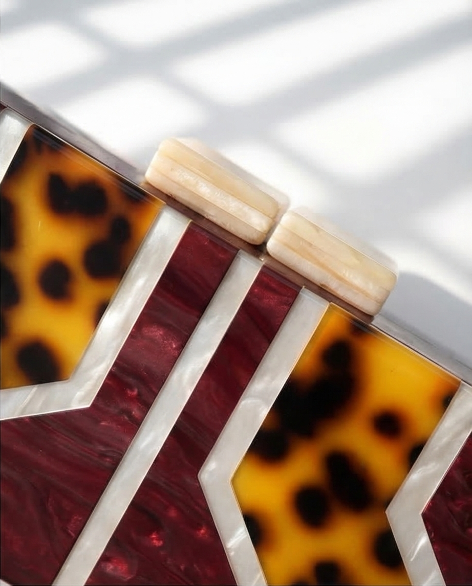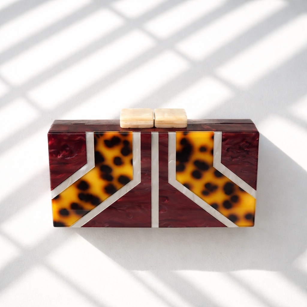 O desing da clutche apresenta um padrão geométrico ousado, o material têm um acabamento em madrepérola ás riscas em beje e carapaça de tartaruga em laranja e preto.