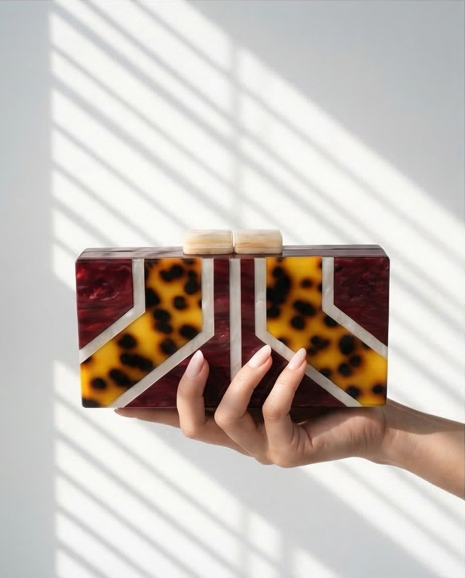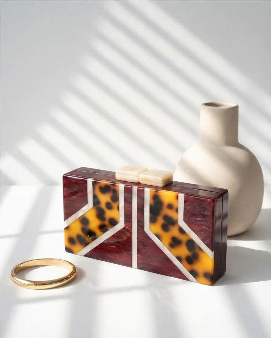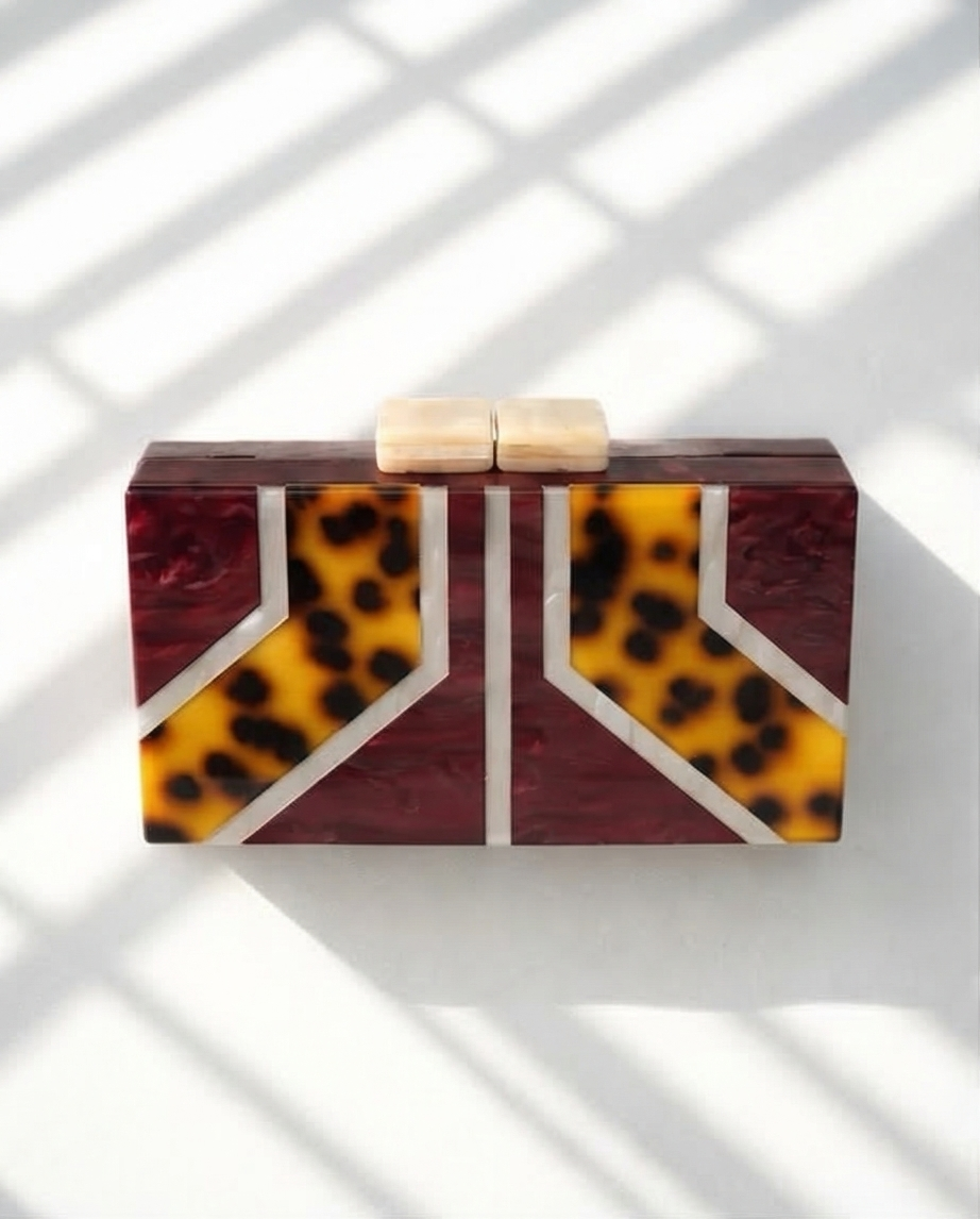 • Clutch retangular com padrões em resina, detalhes amarelos, pretos, vinhos e bege