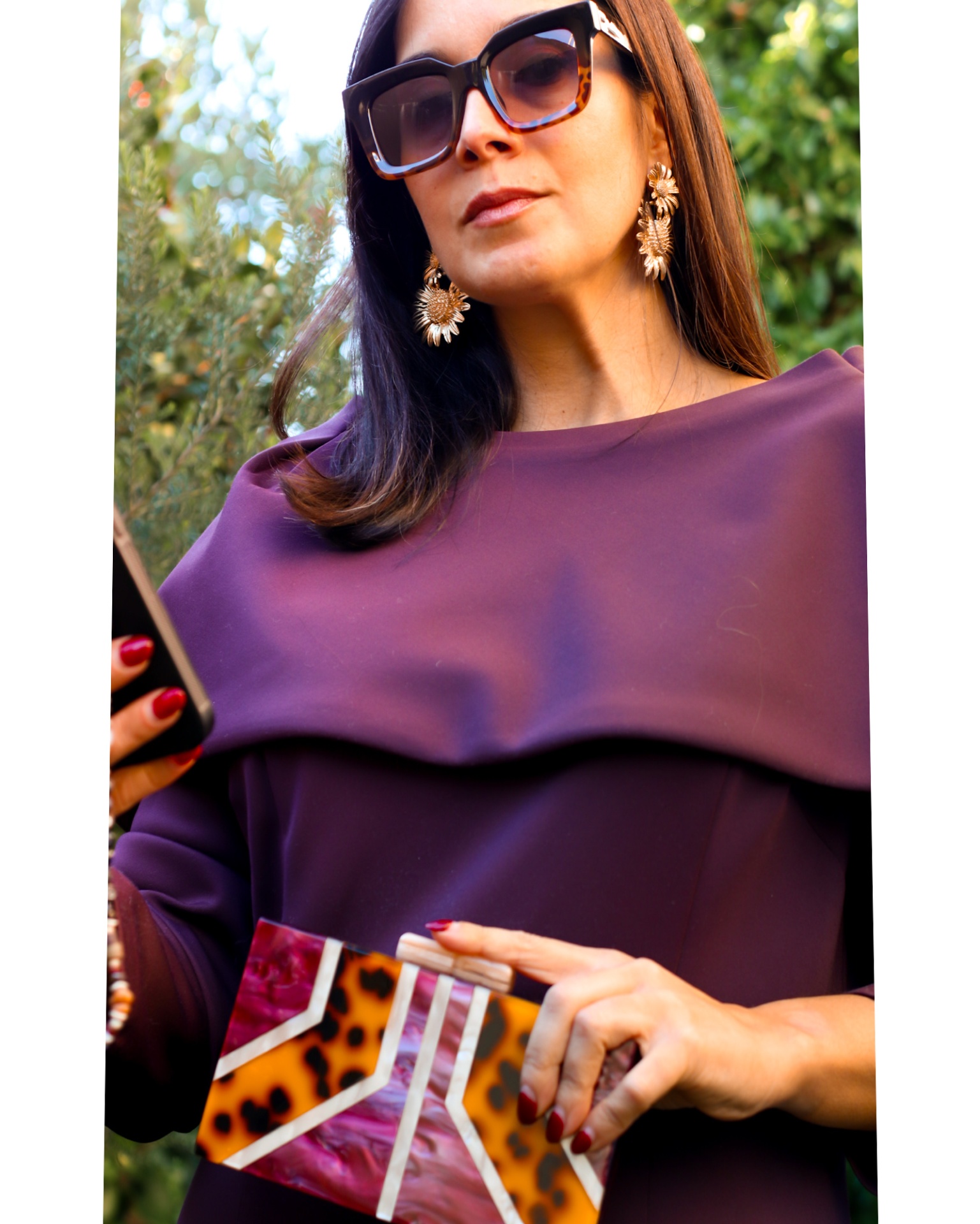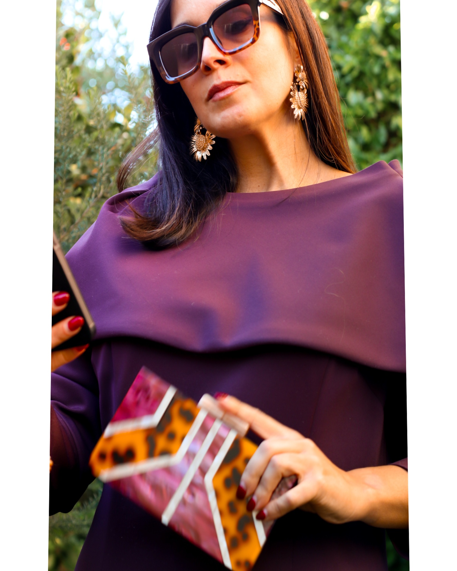 • Mulher com vestido roxo, brincos dourados, óculos de sol e carteira de mão padrão animal print