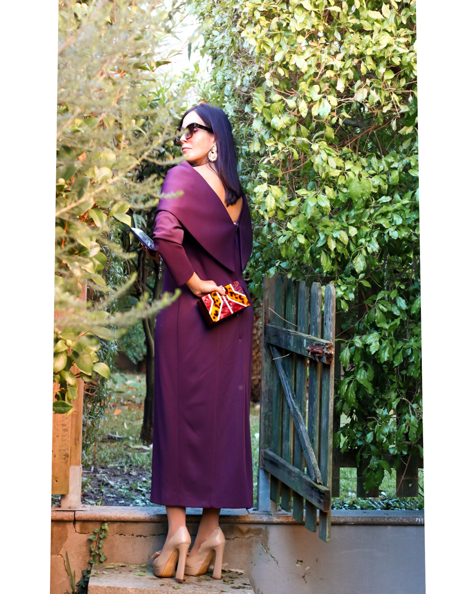 • Mulher com vestido roxo e carteira padrão animal print junto a portão de madeira verde em jardim