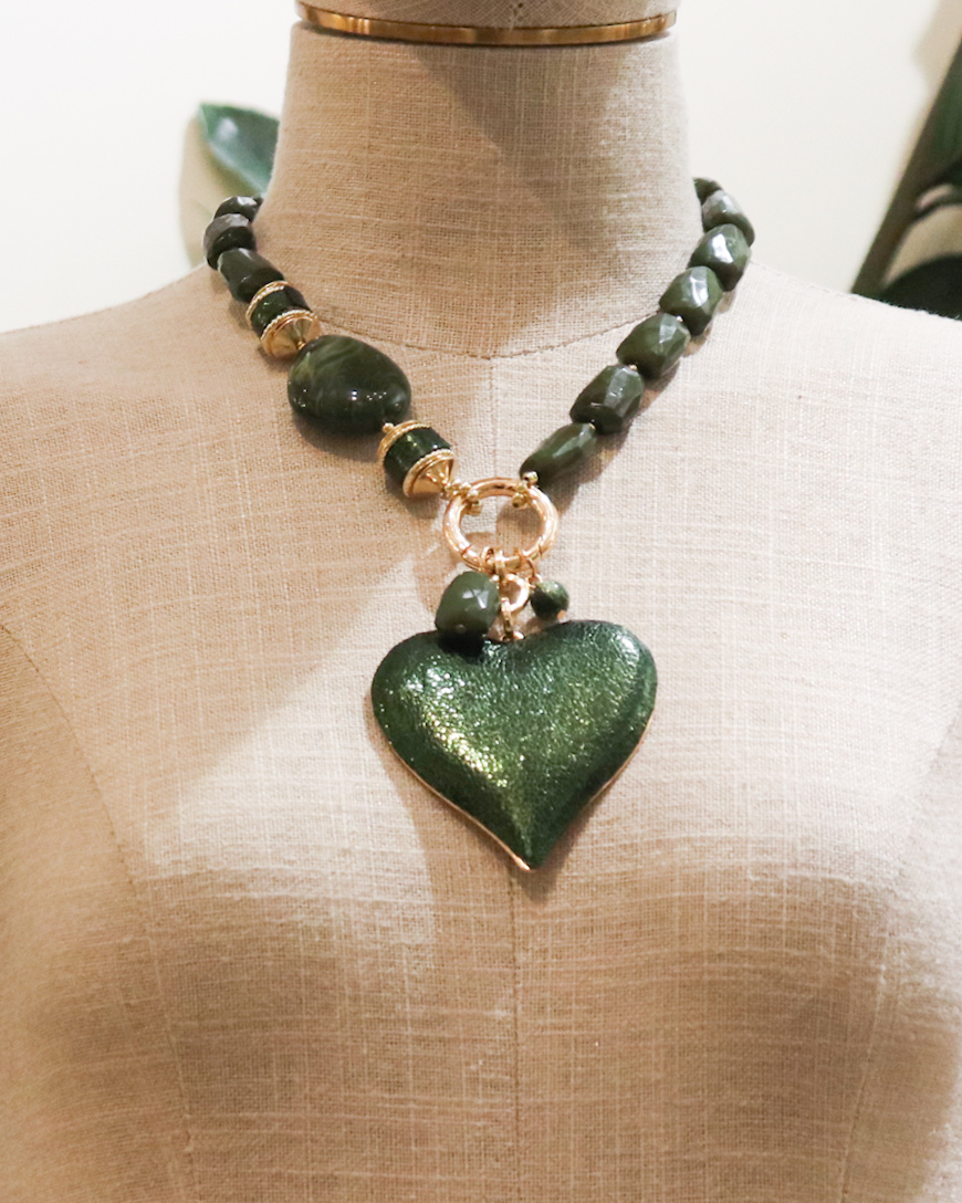 Colar Amour Green 22,40 € Desconto de %. Partilhar Comprar Contactar Este colar é romantico e cheio de personalidade. Tem umas contas grandes e irregulares, com um coração grande texturado. Cor: Verde e Dourado