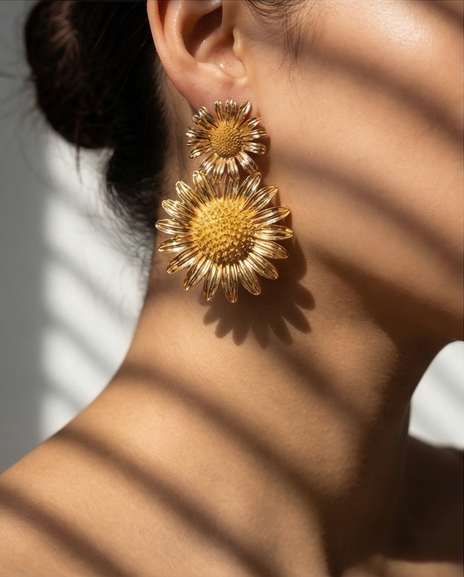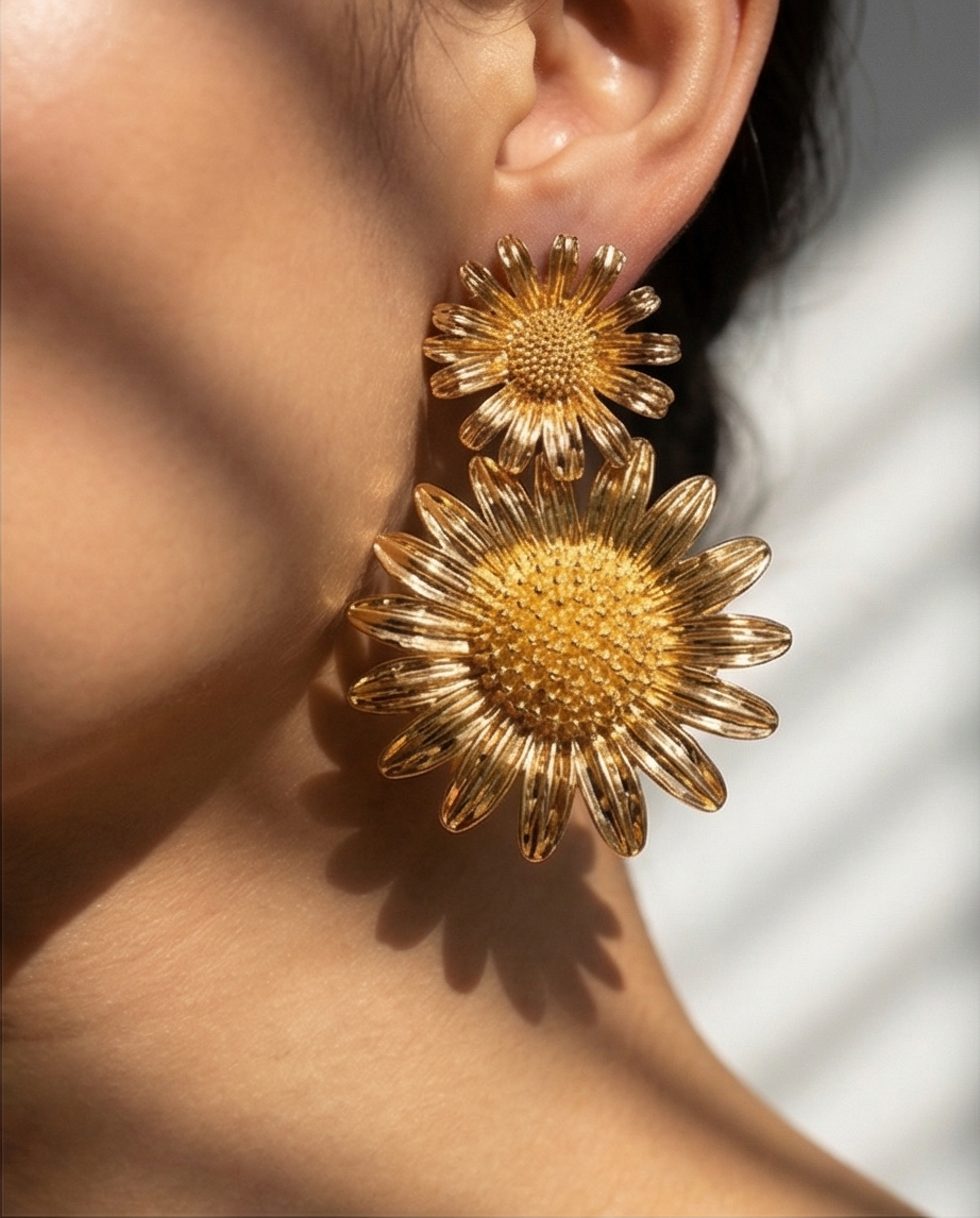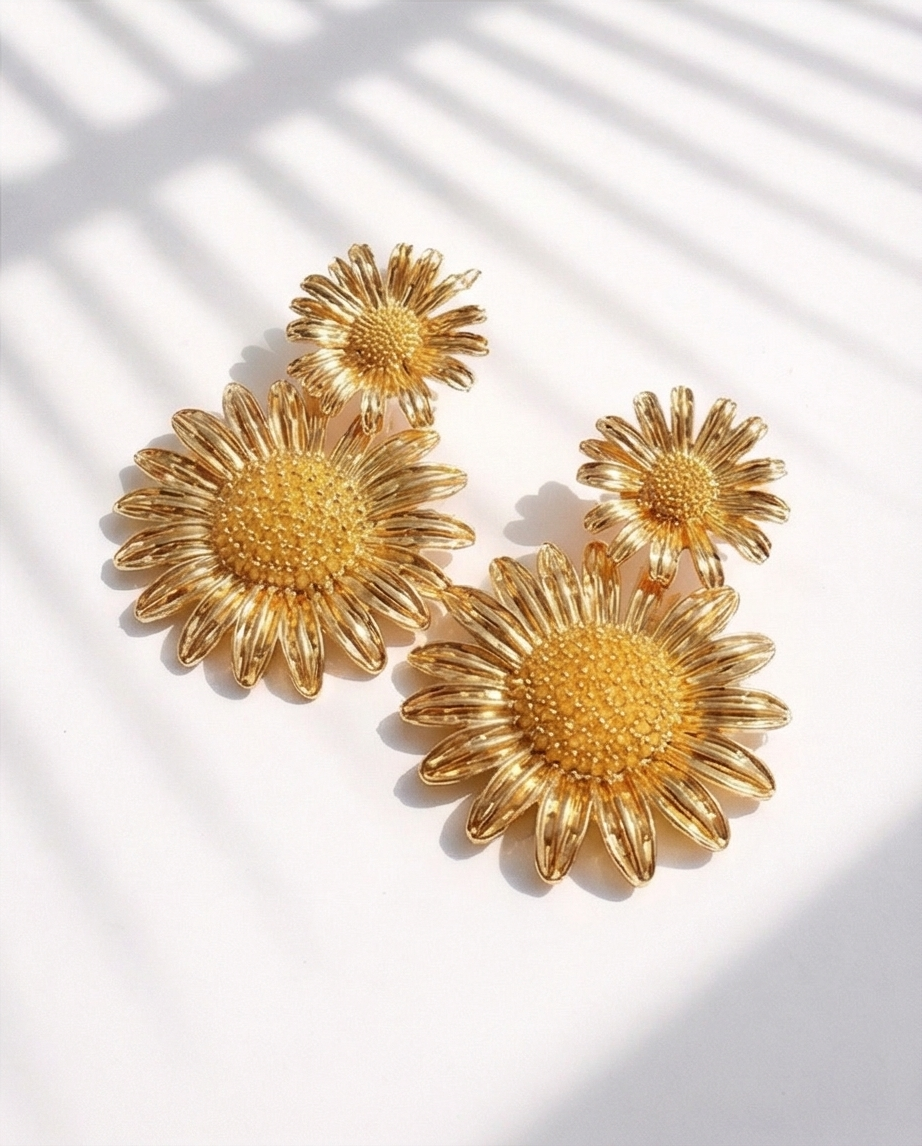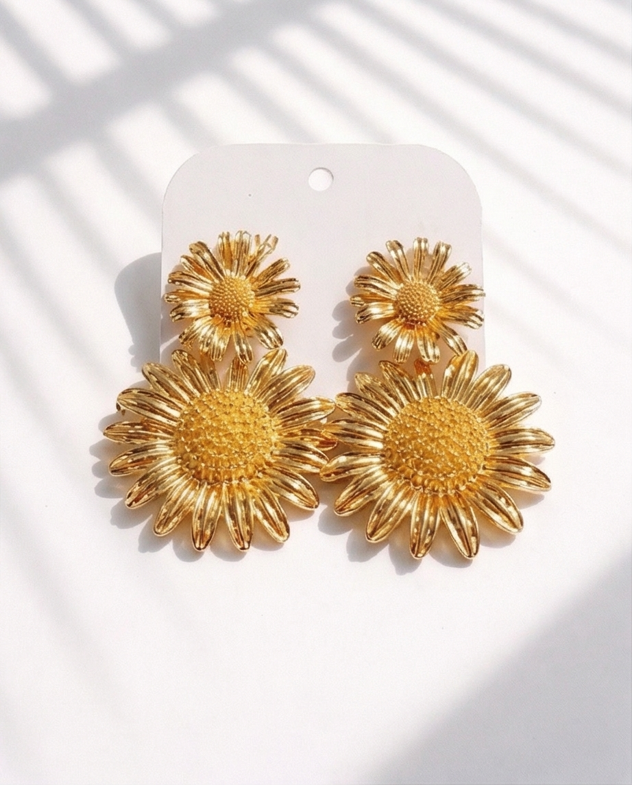 Brincos Gold SunFlower 15,40 € Desconto de %. Partilhar O produto encontra-se sem stock. Brincos em metal dourado, tamanho médio, em forma de dois girassois. Perfeito para ocasiões especiais ou para quem gosta de transformar qualquer momento num momento especial.