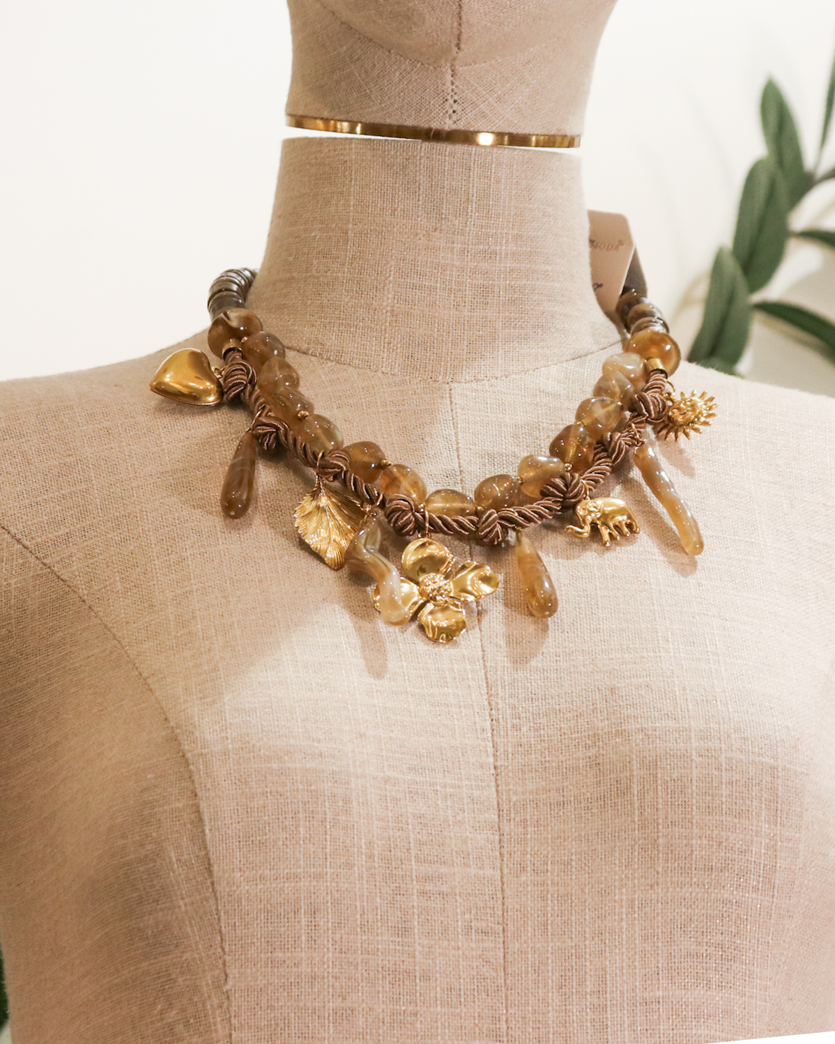 É um colar de contas castanhas, com pingentes de metal dourado, inclui um coração, um elefante, uma flor,uma folha e um sol, com uma cordabeje torcida como corrente.