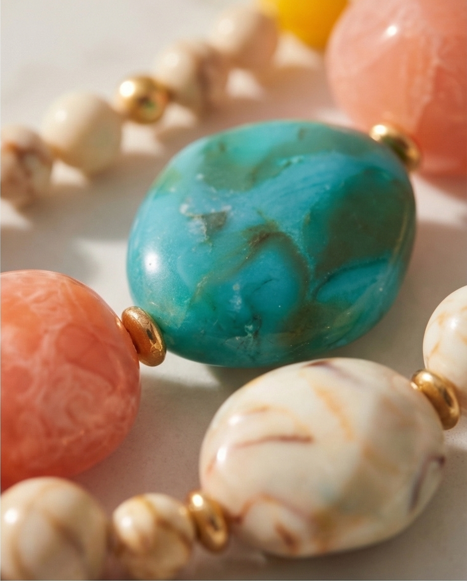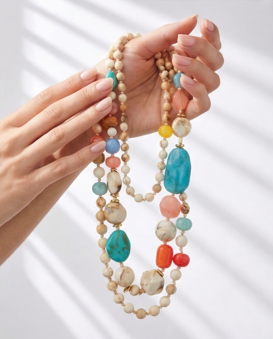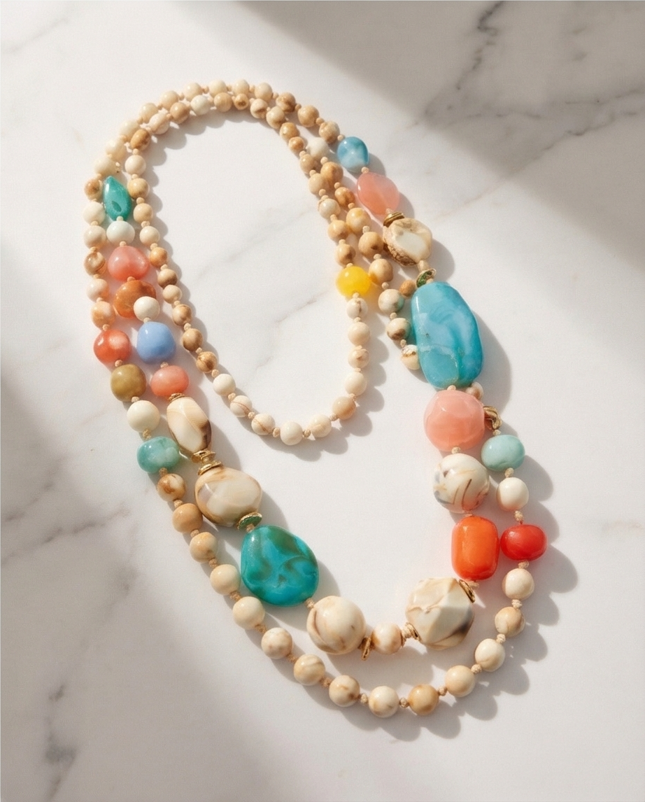 Colar Kika 22,40 € Desconto de %. Partilhar Comprar Contactar Este colar de contas de múltplas fileiras com uma mistura de pedras de cores vivas e de vários comprimentos. Ideal para elevar looks neutros, funcionando como a peça central do visual.