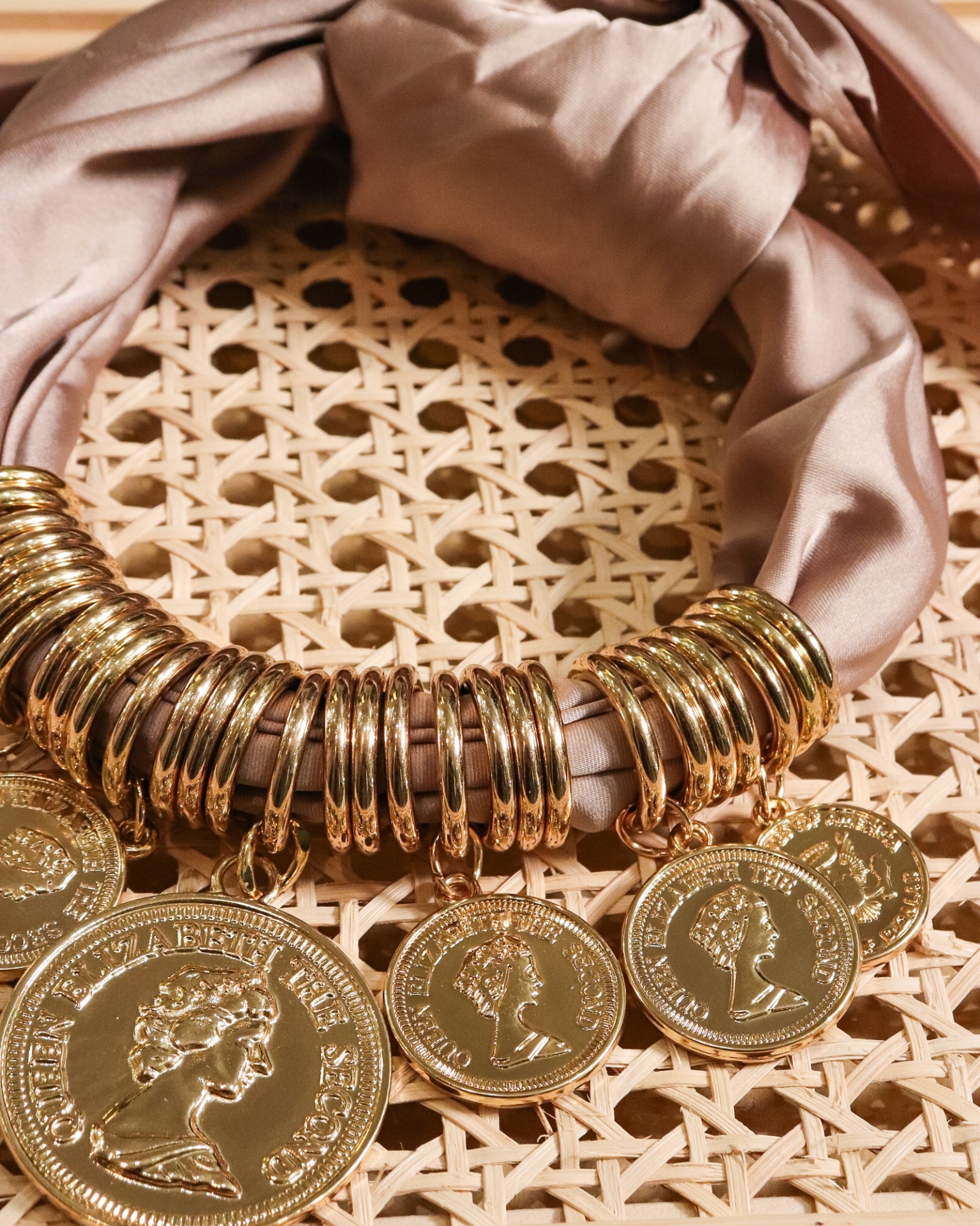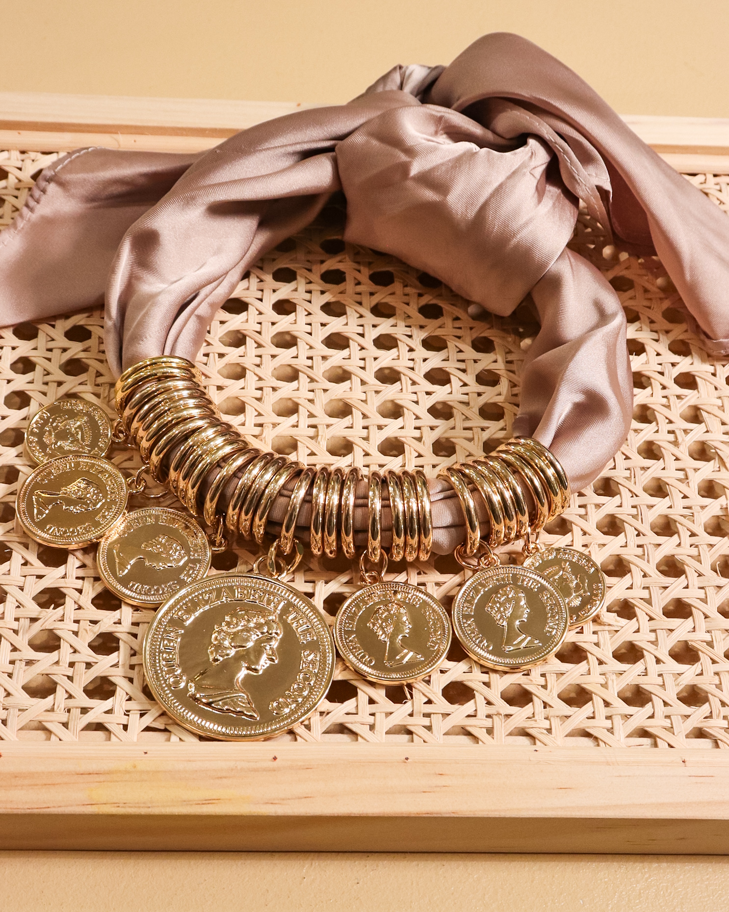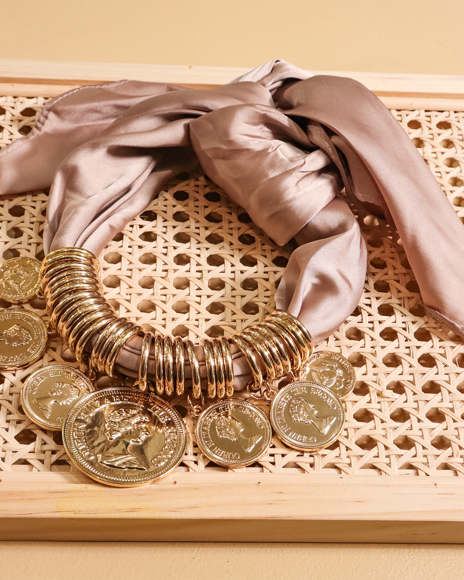 Colar Libra Bege 22,40 € Desconto de %. Partilhar Comprar Contactar Colar em forma de lenço com argolas e libras douradas.
