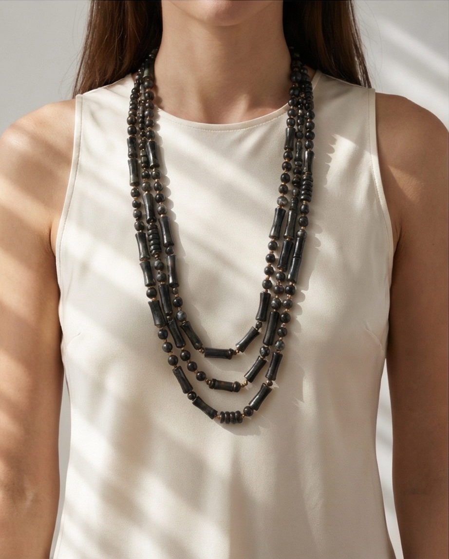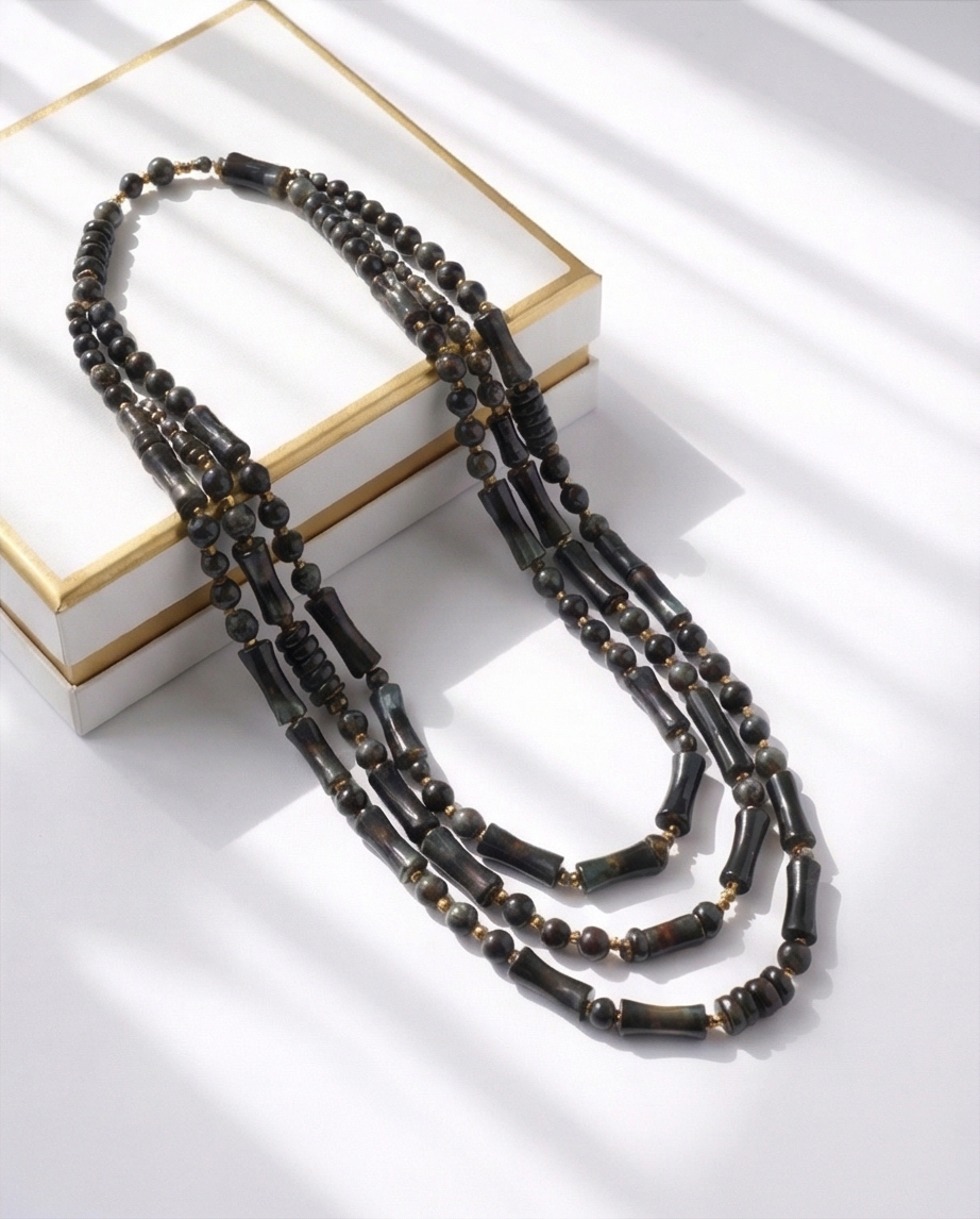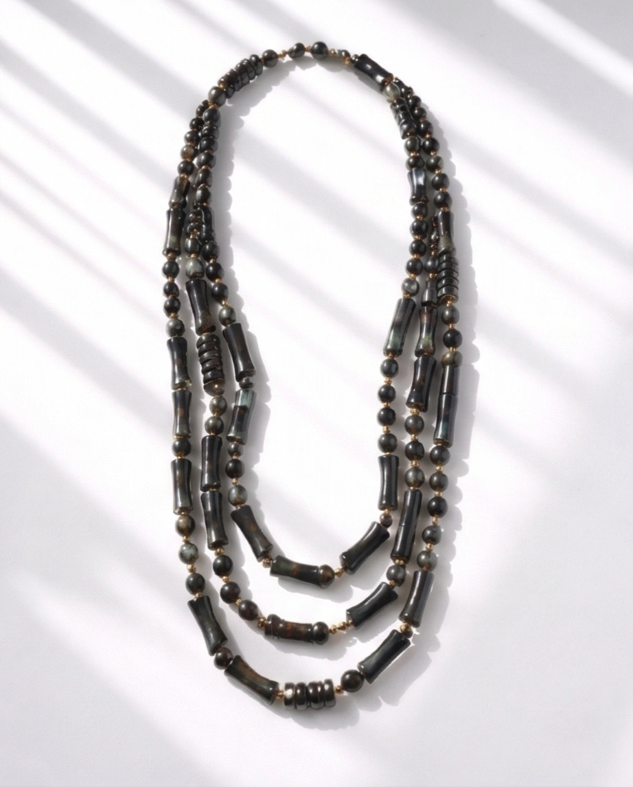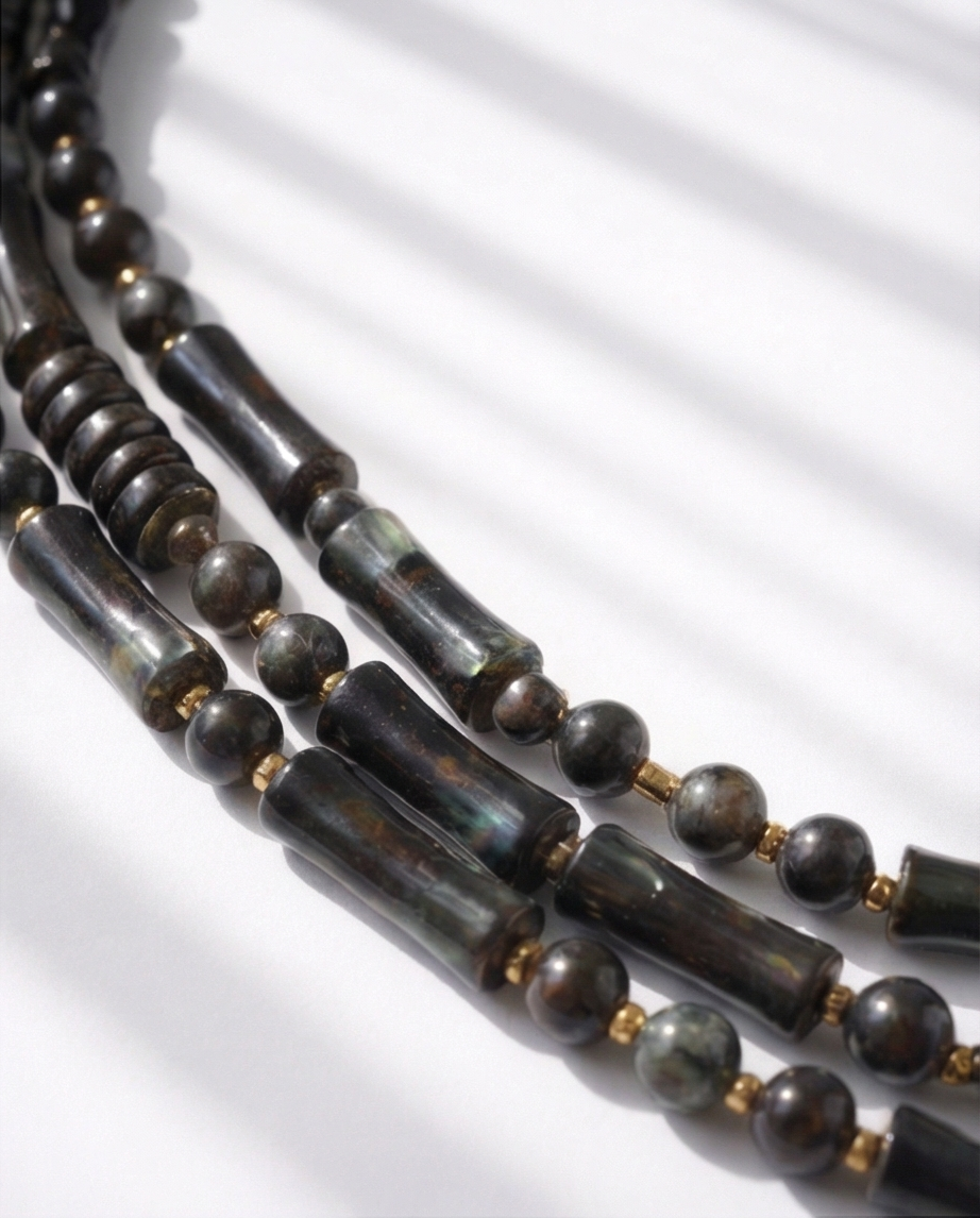 Colar Mate 19,40 € Desconto de %. Partilhar Comprar Contactar Este colar tem várias camadas, com contas de forma cilíndricas e esféricas. Em tons de cinzento e preto, intercaladas com contas mais pequenas em dourado. Uma peça essencial que se adpta a qualquer ocasião.