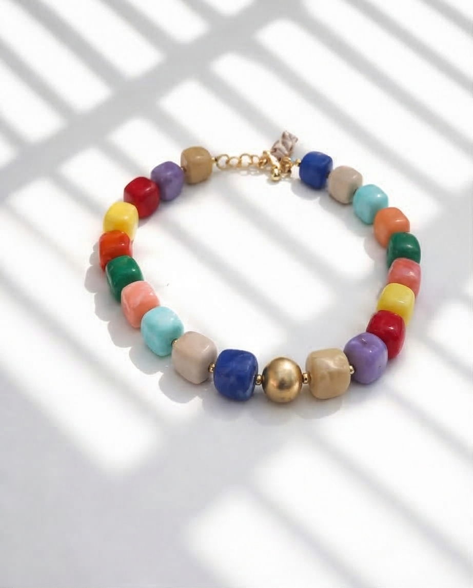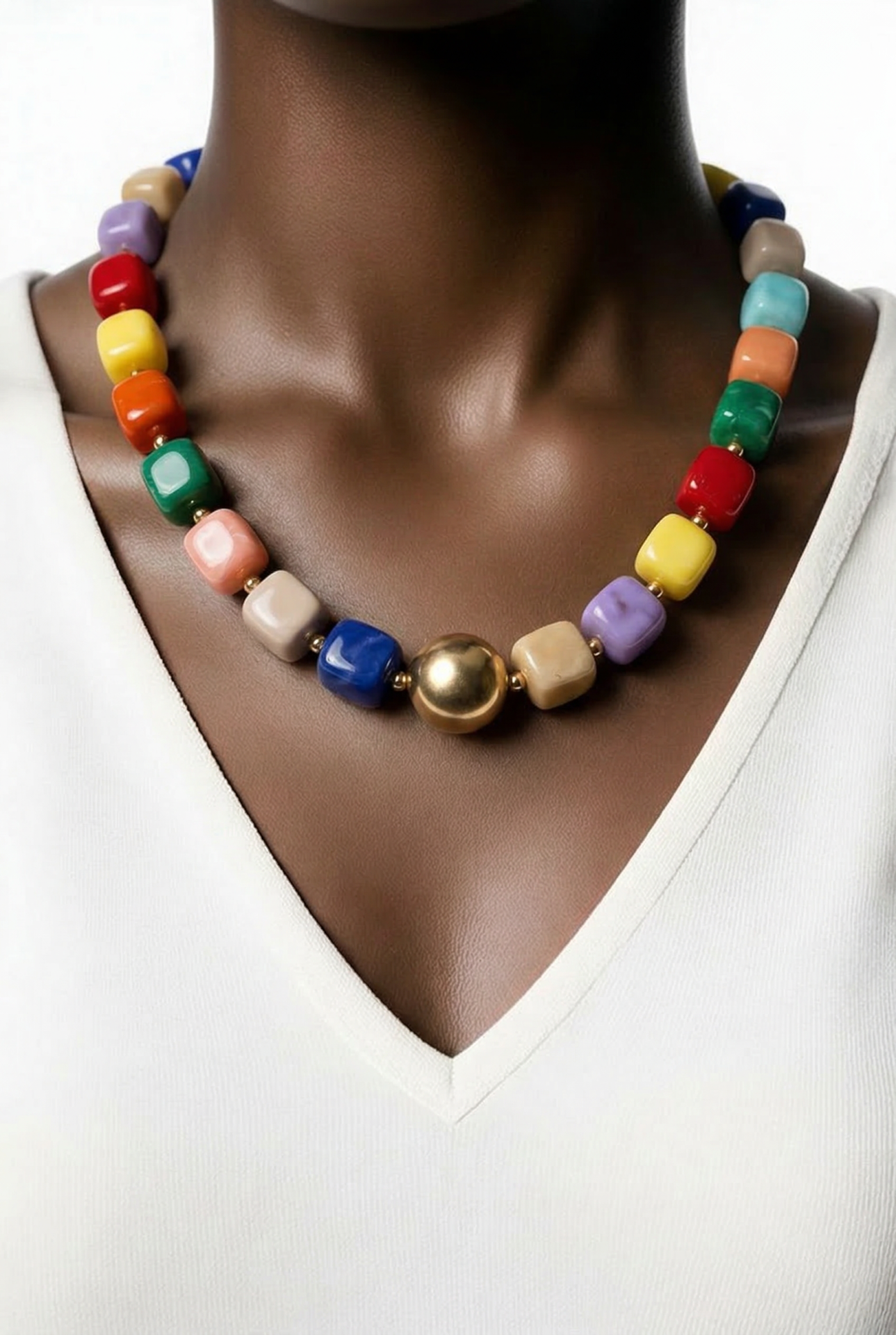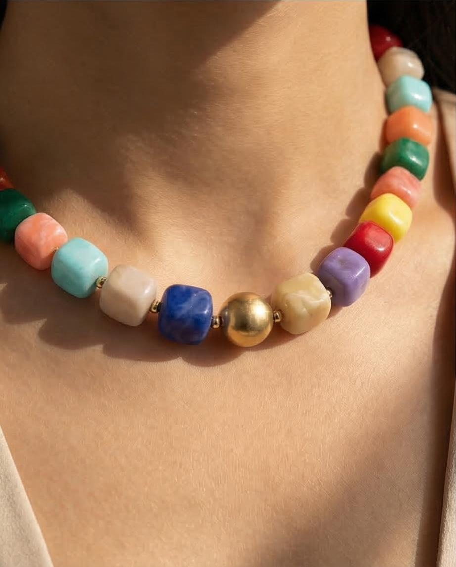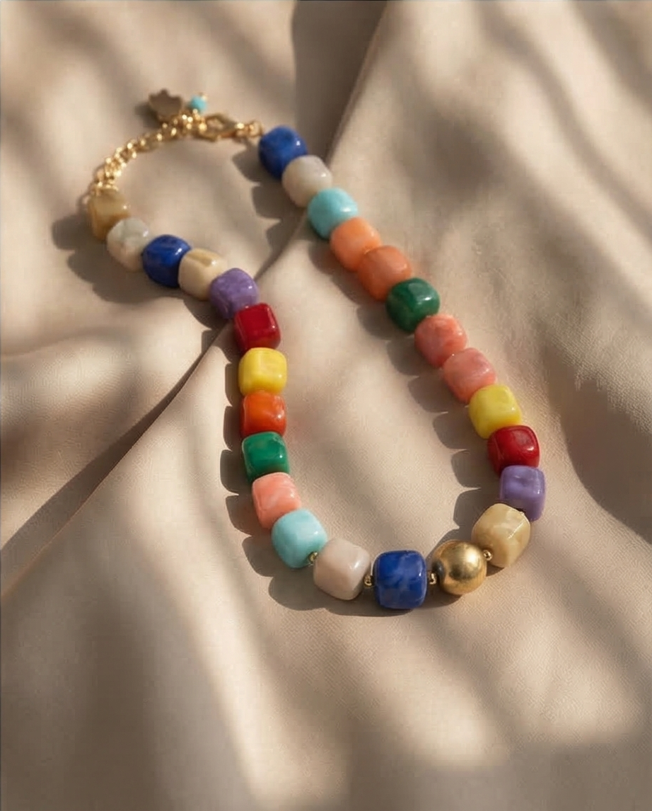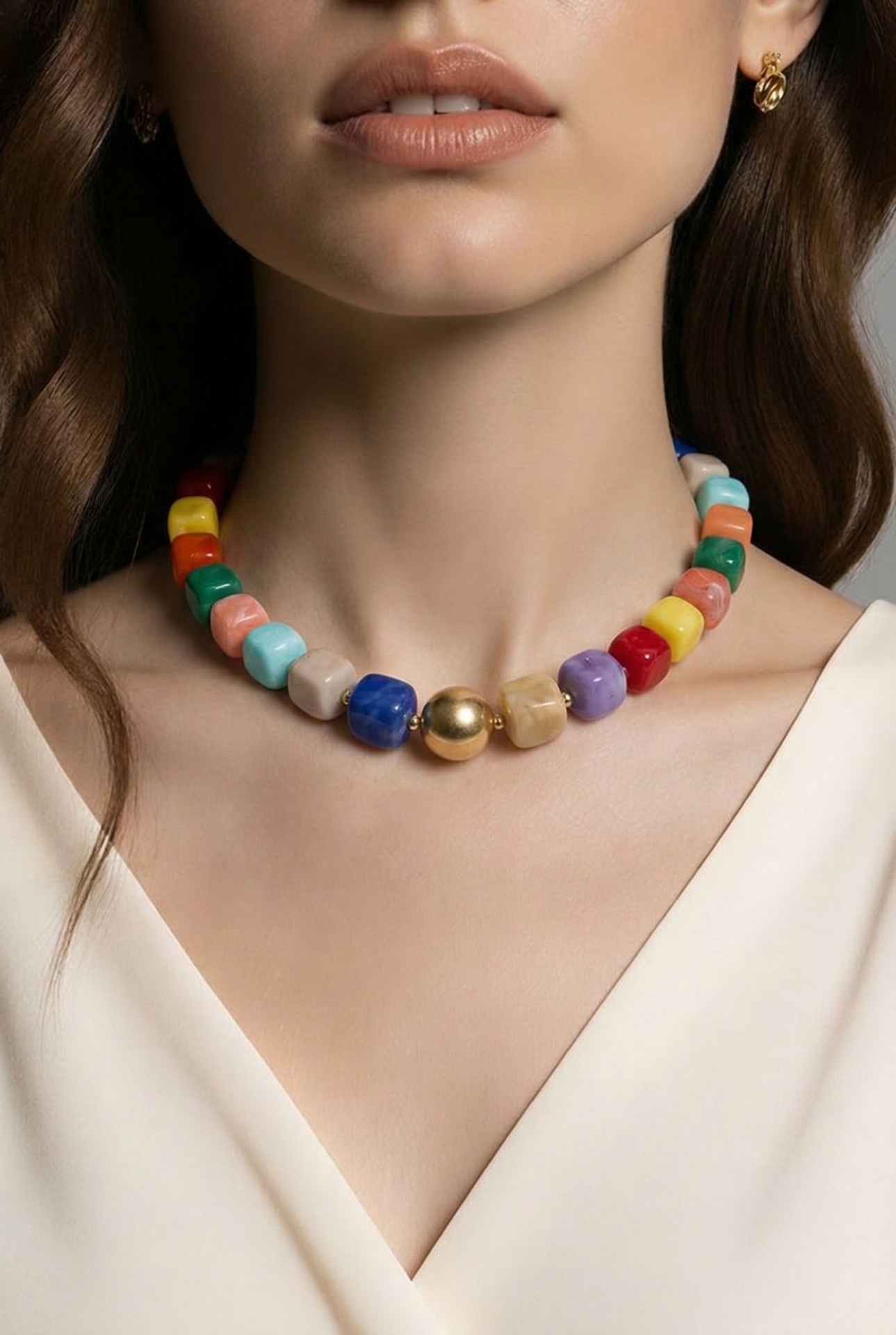 Colar Sfera 19,40 € Desconto de %. Partilhar Comprar Contactar Este colar de contas coloridas é um acessório vibrante, as bolas são em resina. É um colar curto ideal para adicionar um toque de cor ao look. Cor : pastel, azul, laranja, amarelo e rosa.