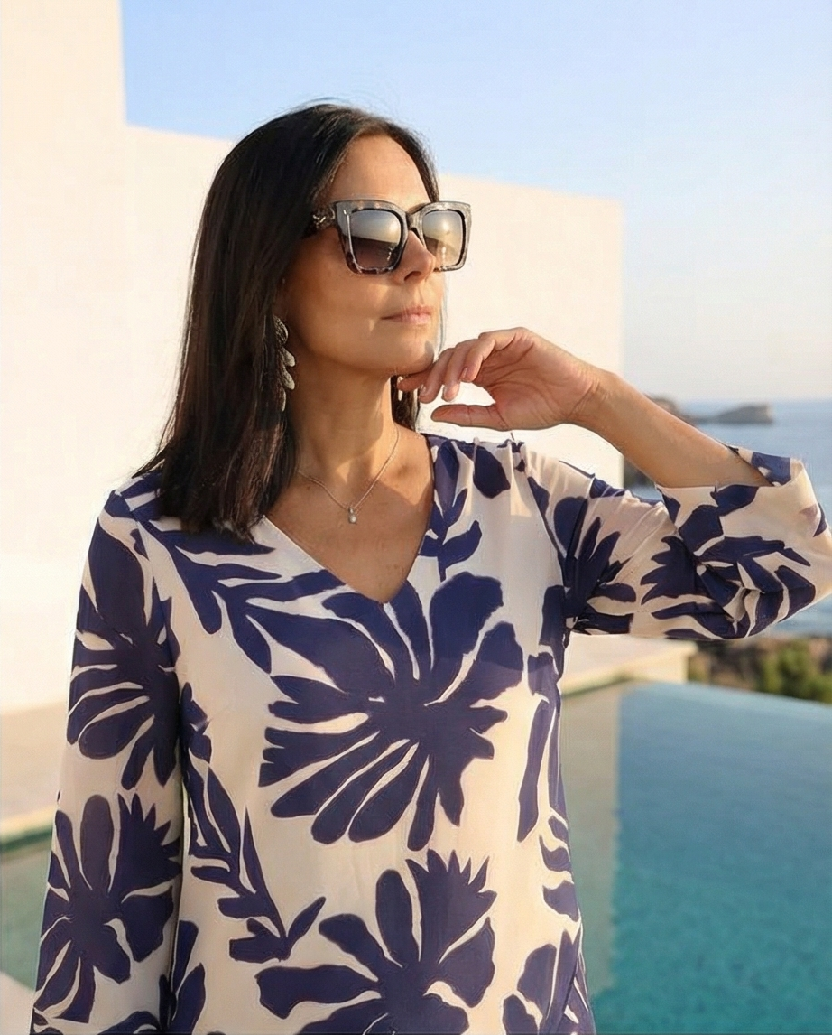 • Mulher sentada com blusa estampada azul e creme, calças azuis e sandálias de salto, em ambiente exterior junto à piscina e mar.