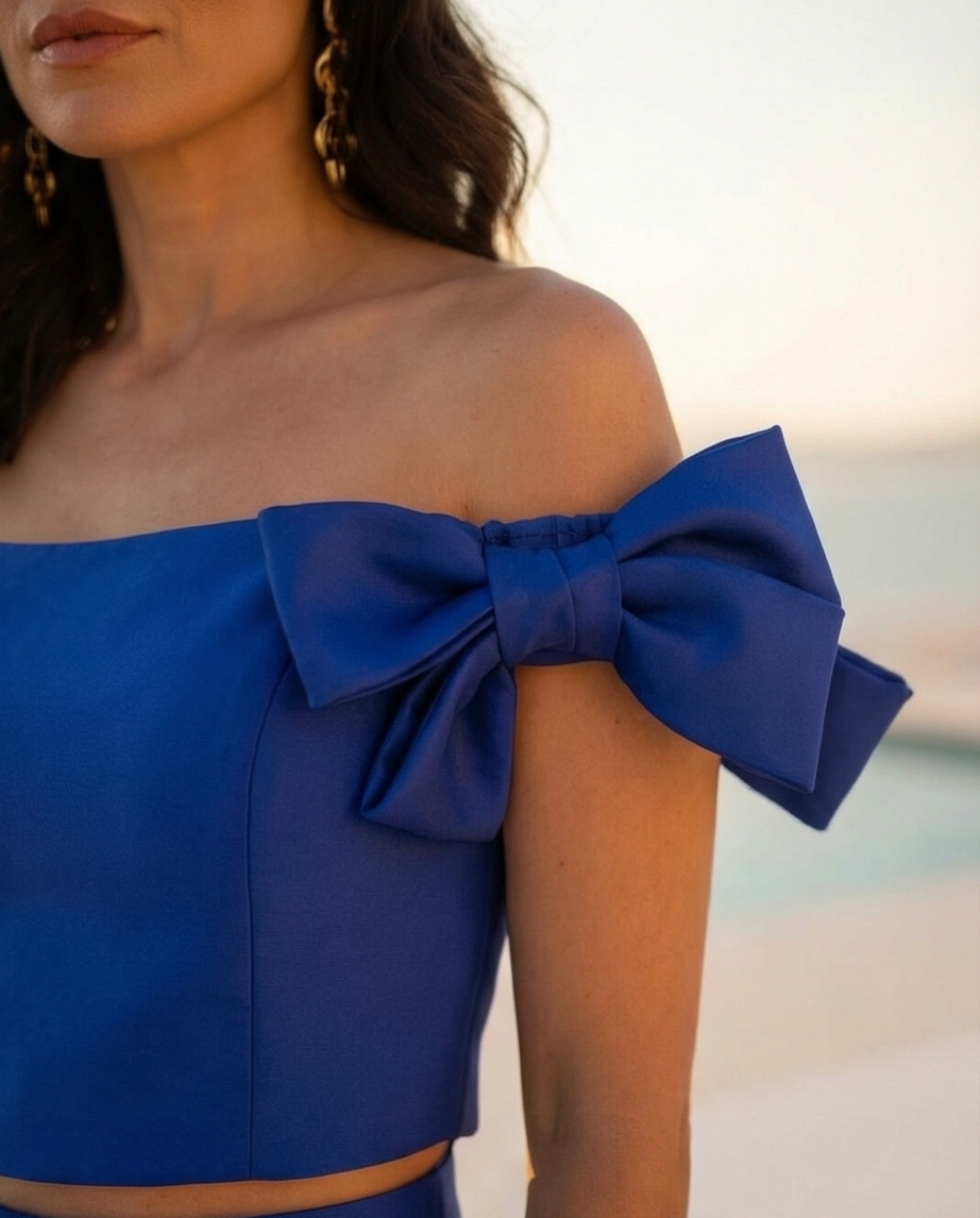 • Top feminino azul royal com laço grande no ombro direito