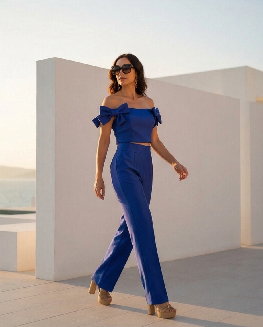 Mulher com conjunto azul royal, top com laços nos ombros e calças compridas, usando sandálias e óculos escuros frente a piscina e mar.