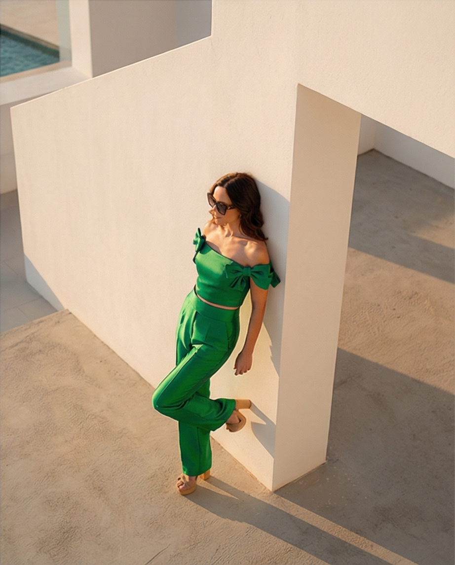 • Mulher vestindo conjunto verde apoiada numa parede branca ao ar livre