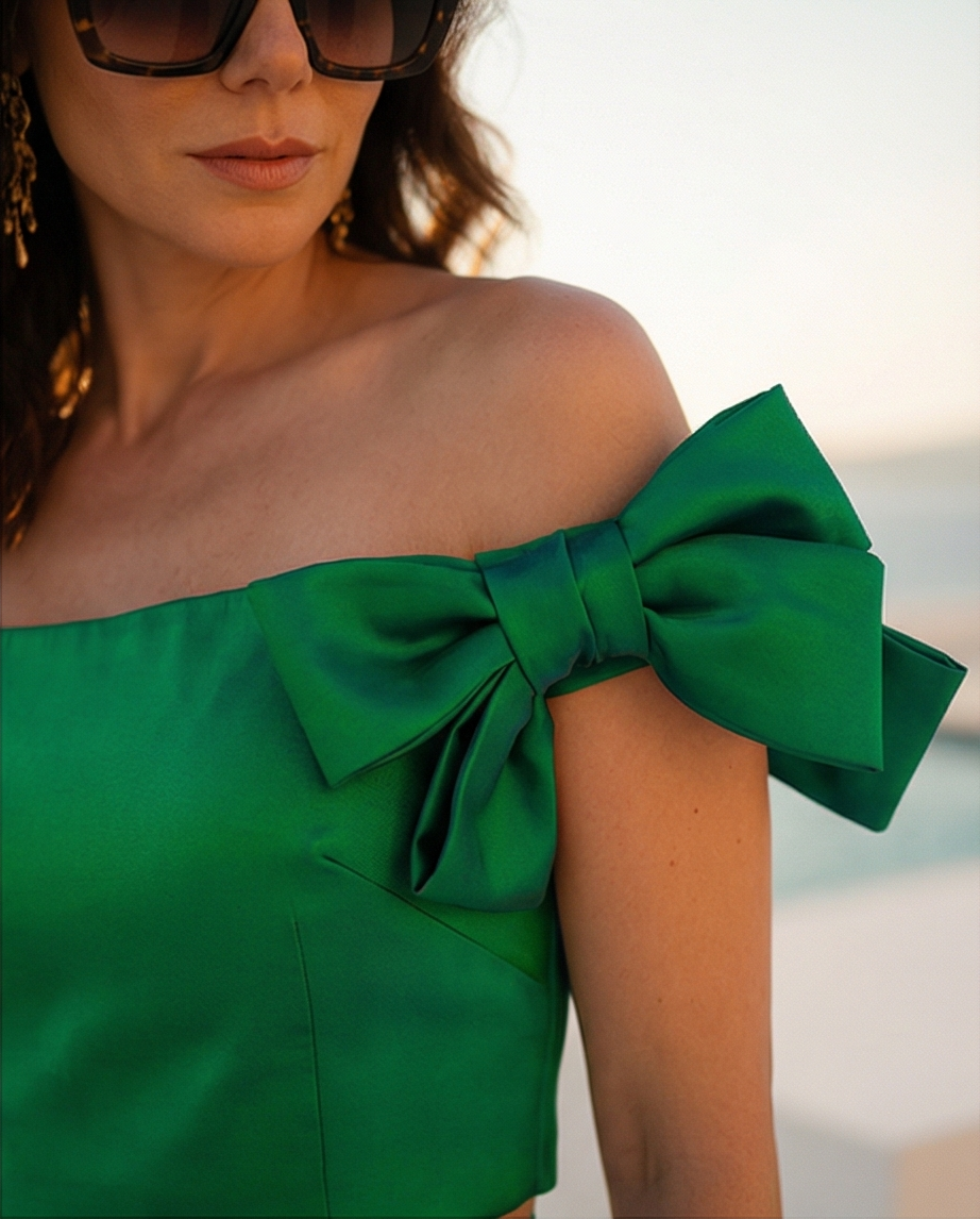 • Top feminino verde com laço grande no ombro direito, decote ombro a ombro.