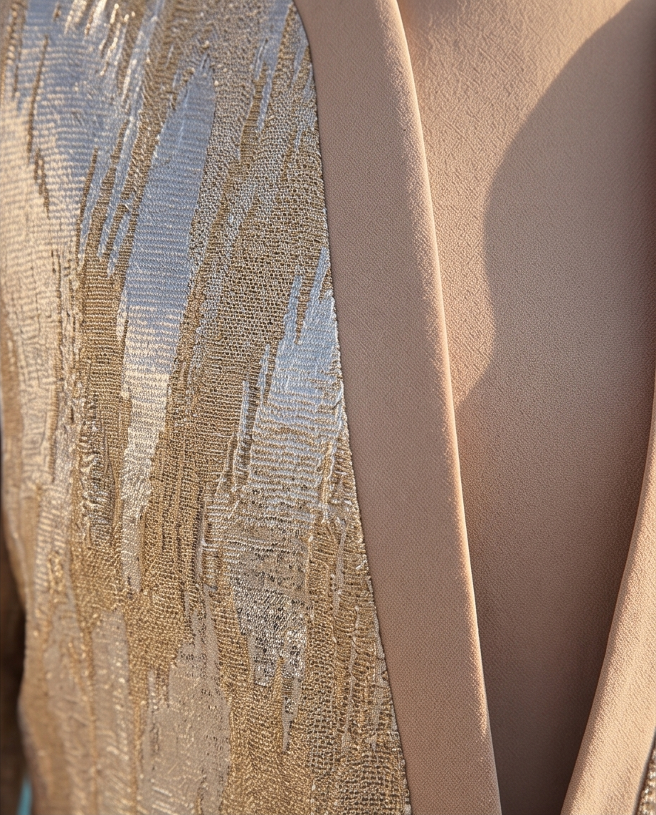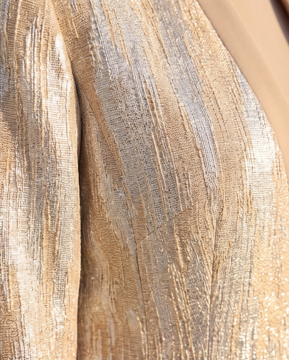 • Blazer dourado metálico feminino com padrão abstrato junto a piscina e mar.