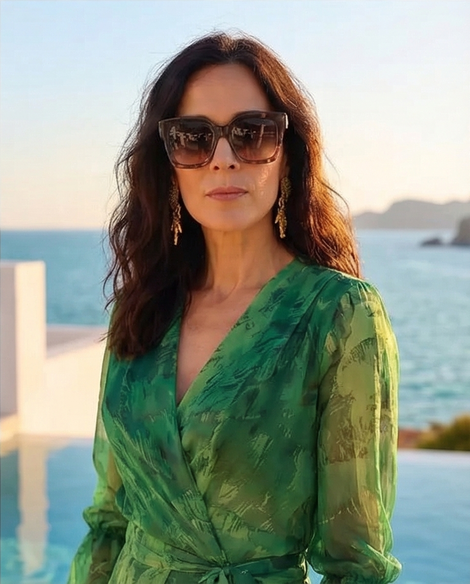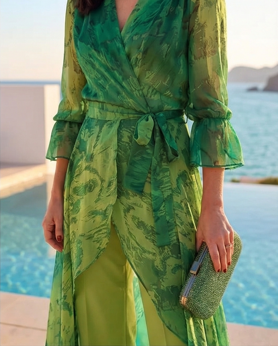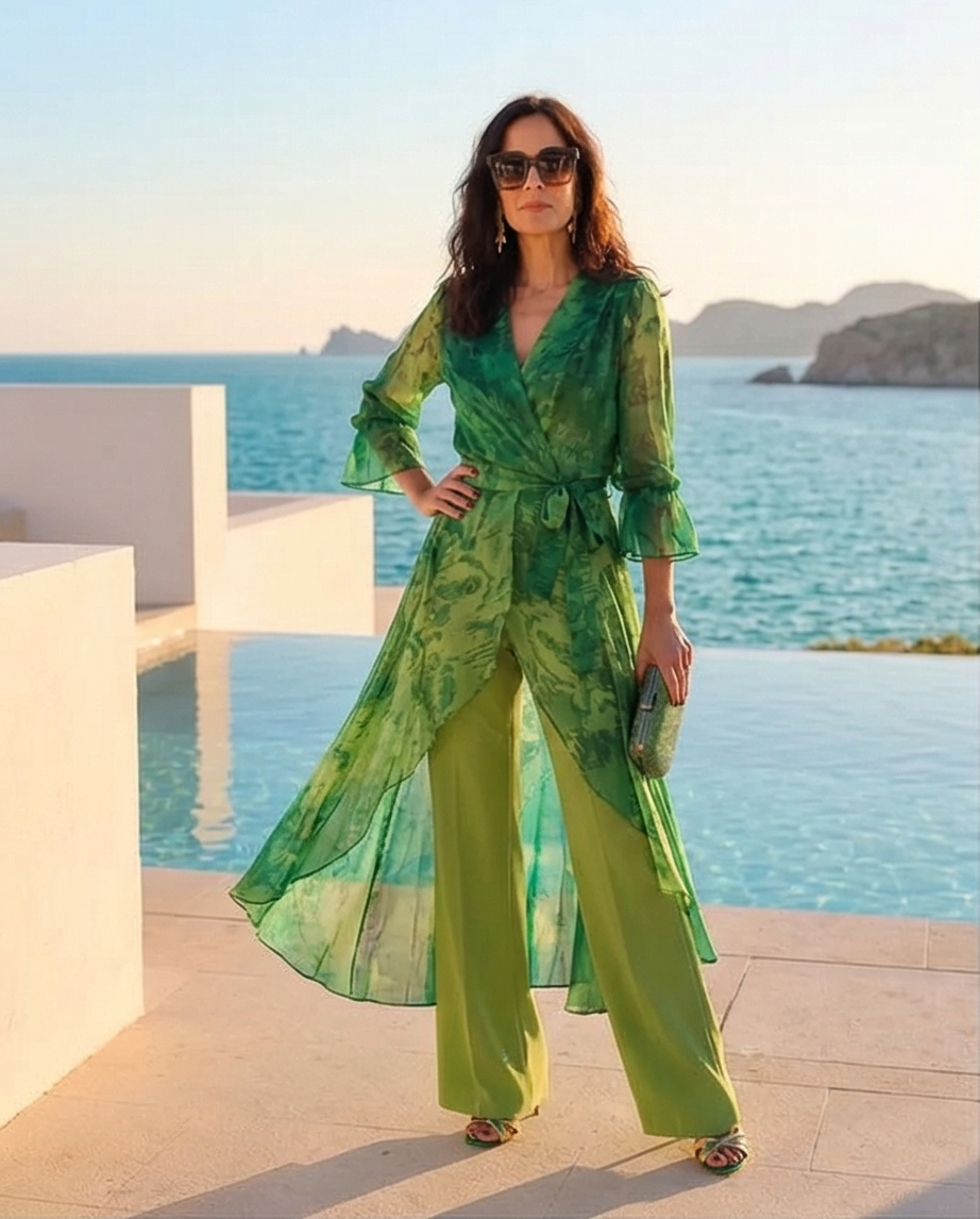 Mulher com túnica verde e calças largas junto ao mar, com piscina ao fundo, usando óculos escuros e mala verde. Conjunto Dubai Green 189,40 € Desconto de %. Partilhar Tamanho S/M L/XL Comprar Contactar Conjunto de tunica e calça, tunica de trespasse com laço ao lado e mais comprida atrás. Calça a direito. Tons de verde