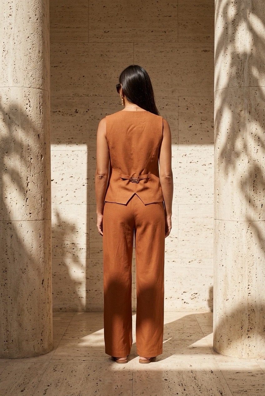 Mulher com colete e calças castanhas largas, calçado de salto médio e óculos escuros, em ambiente com colunas de pedra.